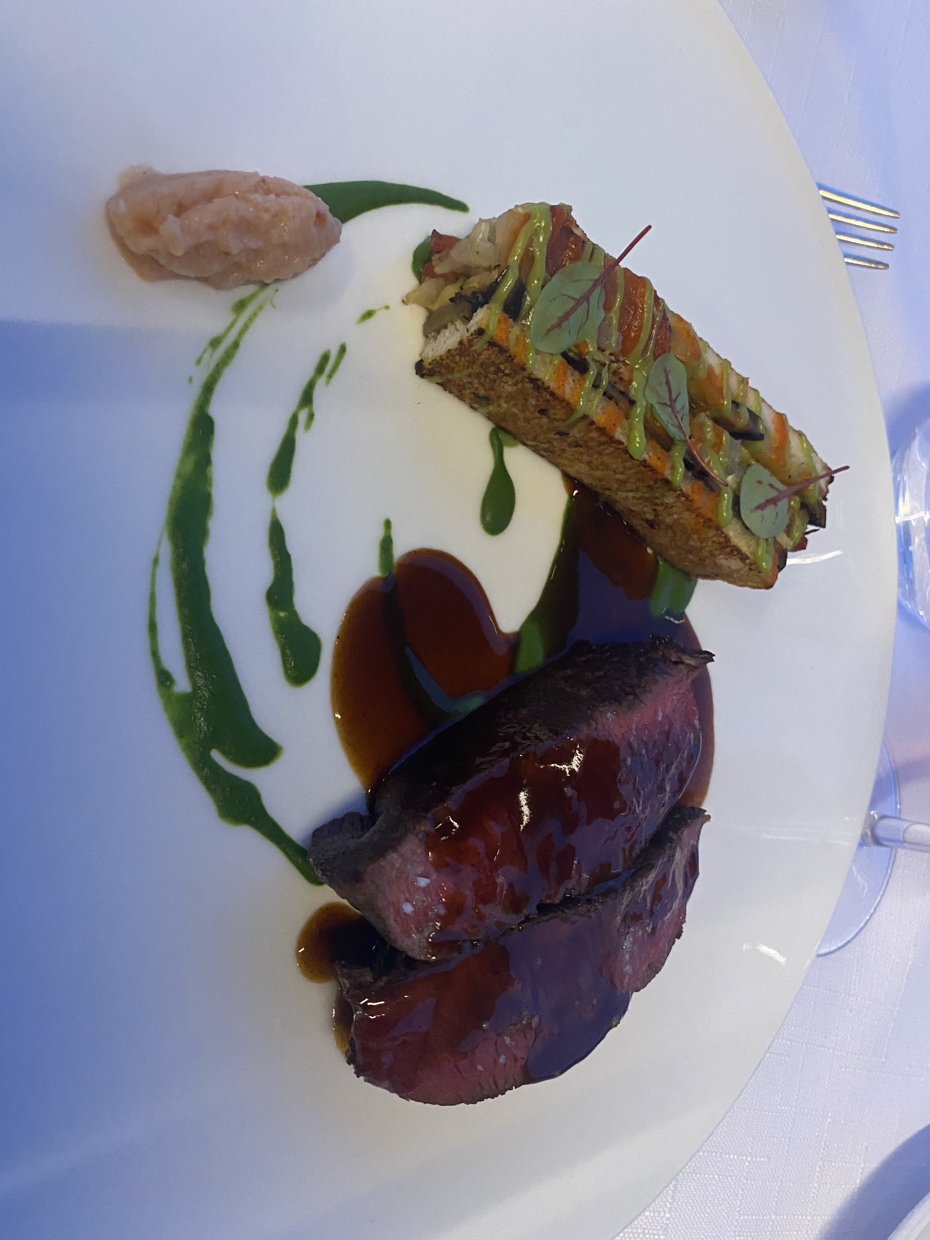 Repas excellent du début à la fin avec une présentation très raffinée. Personnel charmant aux petits soins. Joli cadre.