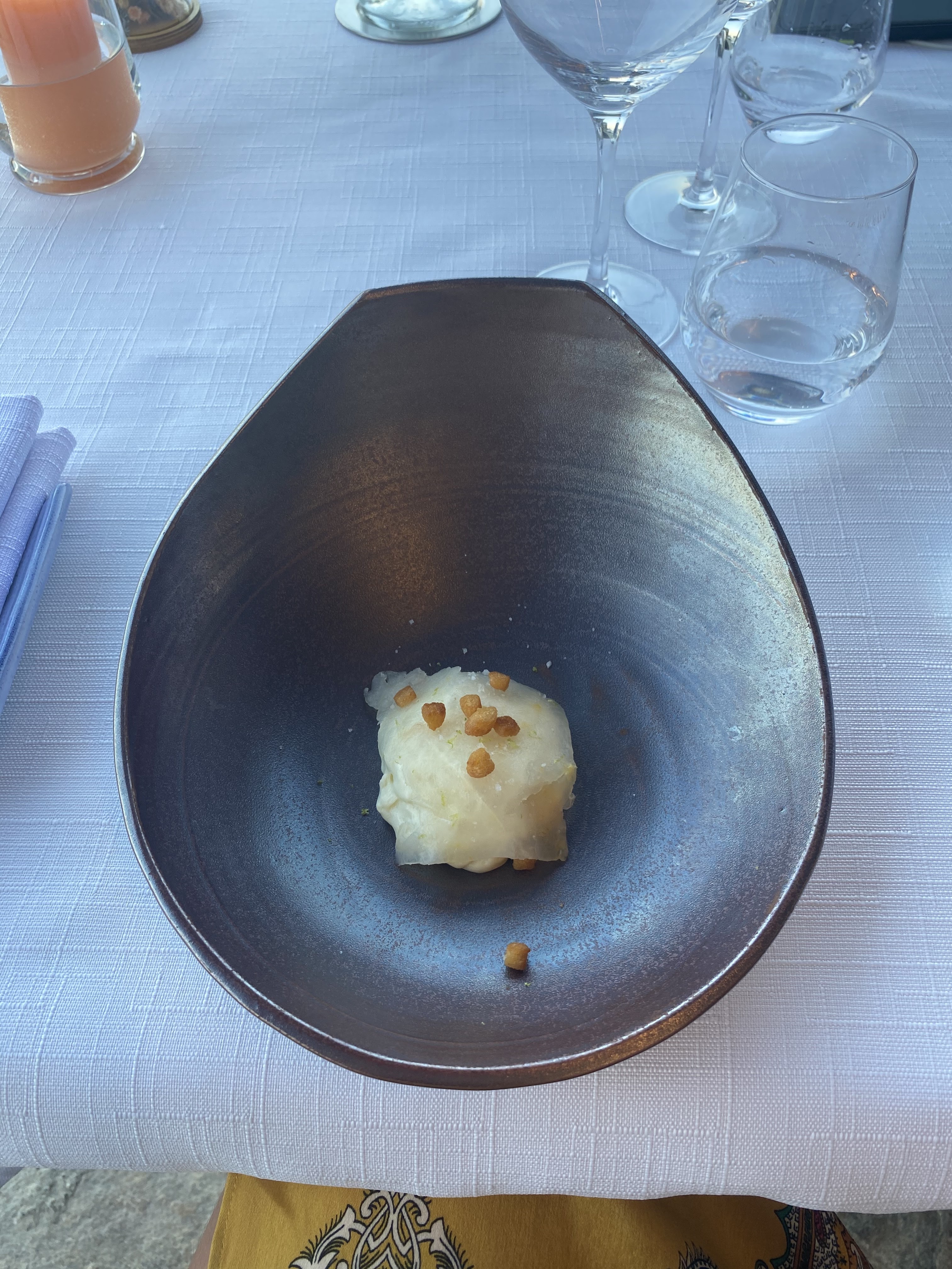 Permettez-moi de commencer par l'évidence : la nourriture et le cadre sont merveilleux. On ne pouvait pas rêver d'un cadre plus parfait pour un repas. Voici où c'est différent. Il s'agit d'un restaurant étoilé Michelin de très haut niveau. Nous avions réservé pour le dîner (ma femme et moi et notre fils de 9 mois. Je ne connais pas une bonne idée). Nous sommes arrivés en ville et notre fils avait un rhume. Nous nous sommes arrêtés pour annuler ou reporter, mal habillés (car nous venions de Calvi et nous nous sommes arrêtés à la plage au préalable). Ils étaient tous très chaleureux et aimables, alors nous avons décidé de rester pour le déjeuner. Nous avons opté pour le menu dégustation complet du chef (6 plats et 2 desserts, encore une fois, ce n'est pas une bonne idée avec un bébé.) Ils l'ont préparé avec précision, grâce et excellence. Le service était également excellent, sympathique et attentionné, mais pas écoeurant non plus. Vraiment?!? Quelle belle expérience. Merci! Nous reviendrons.