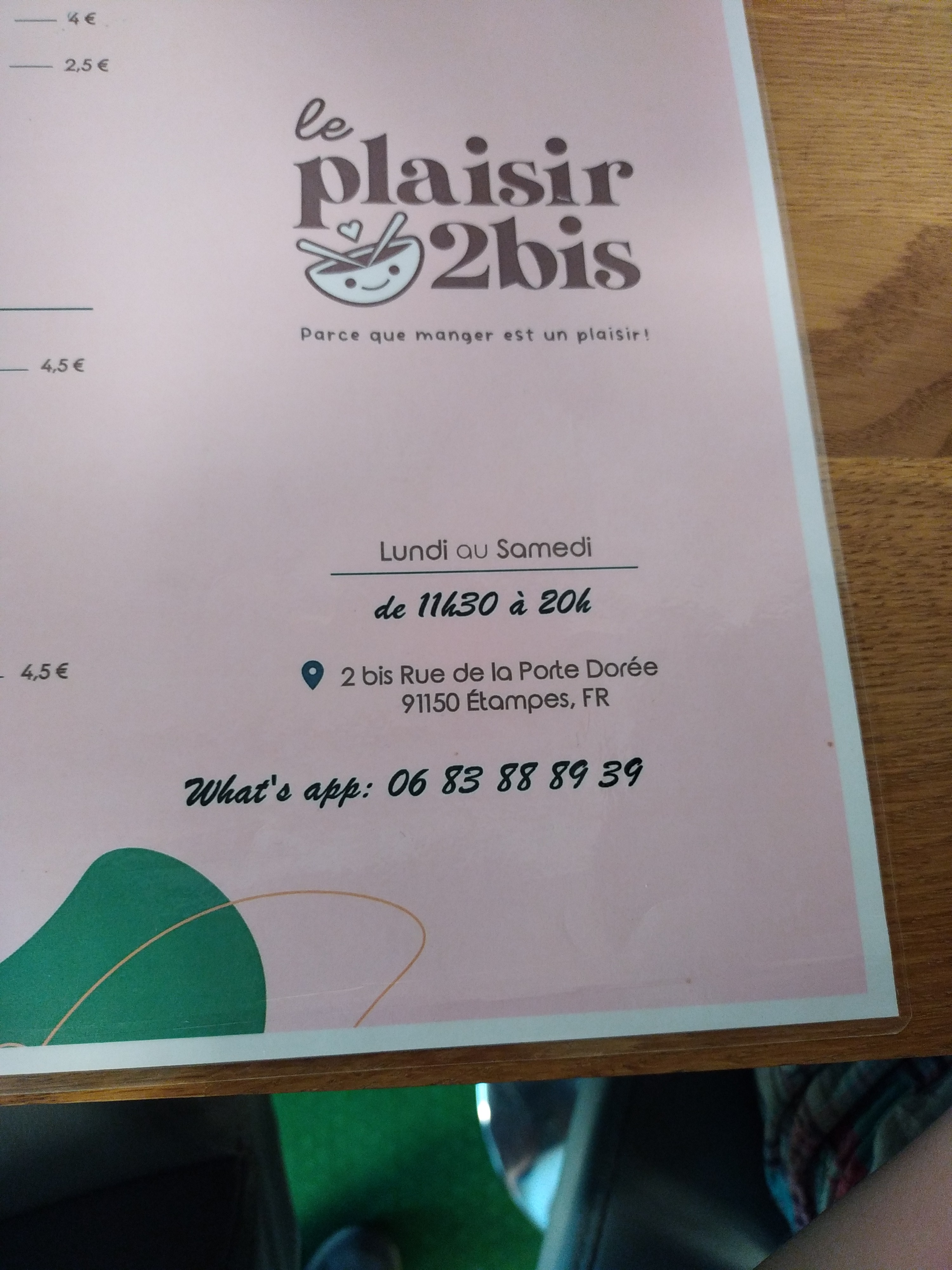 Un lieu très sympa qui va vite devenir un incontournable d'Etampes ! Les poke bowl sont frais, bien garni et très bons ! les Bubble Tea fait maison sont un délice. Et on oubli pas les crêpes très gourmandes :) Les gérants sont chaleureux, bref il y a tout pour vous arrêter au Plaisir O2Bis, vous ne le regretterez pas !