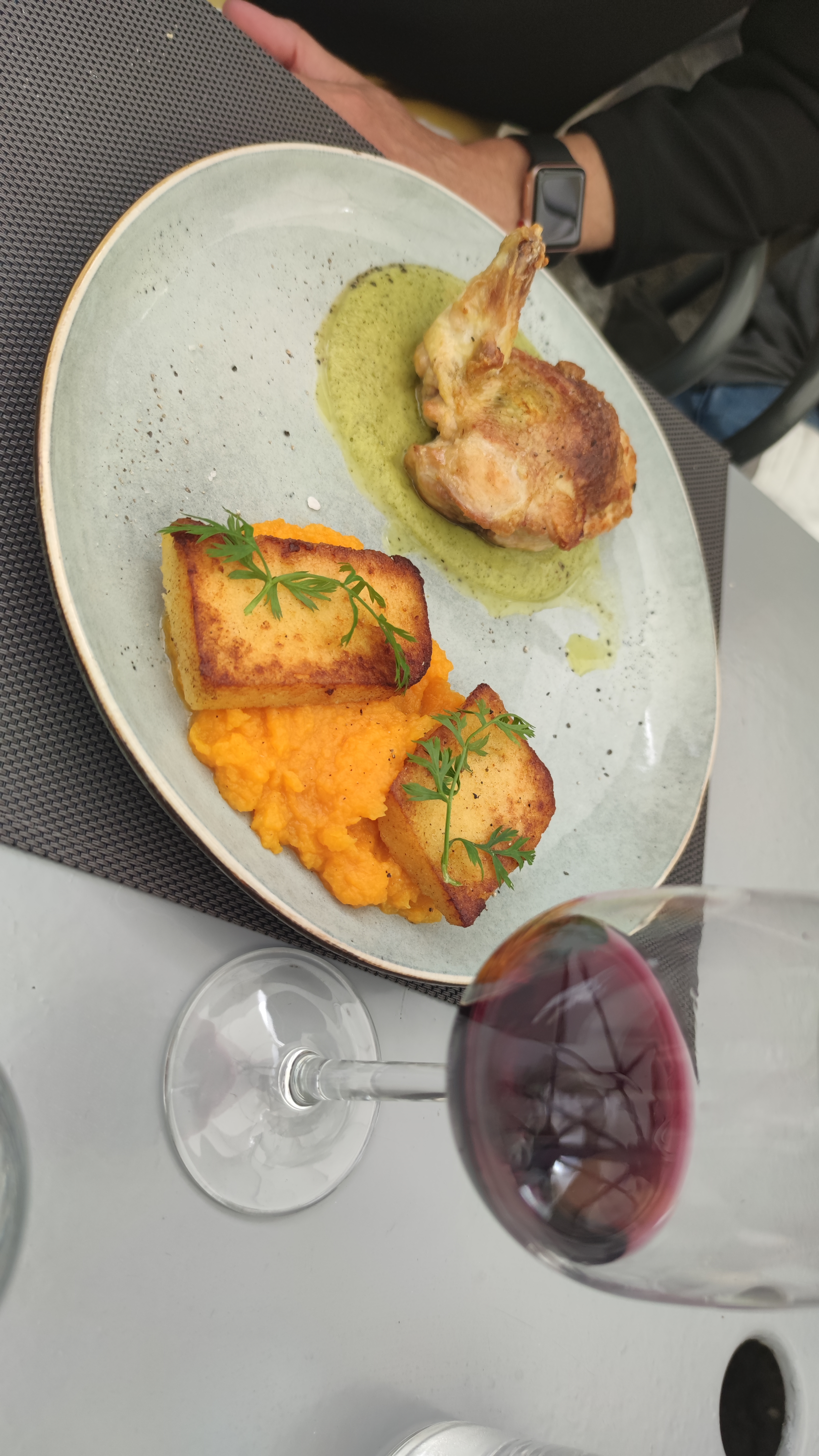 Excellent accueil et suivi (avec des détails précis). Recettes, mets, vins et assaisonnement tout en finesse. Connaissances et désignation de produits de terroir. Magnifique moment à l'abri du vent.