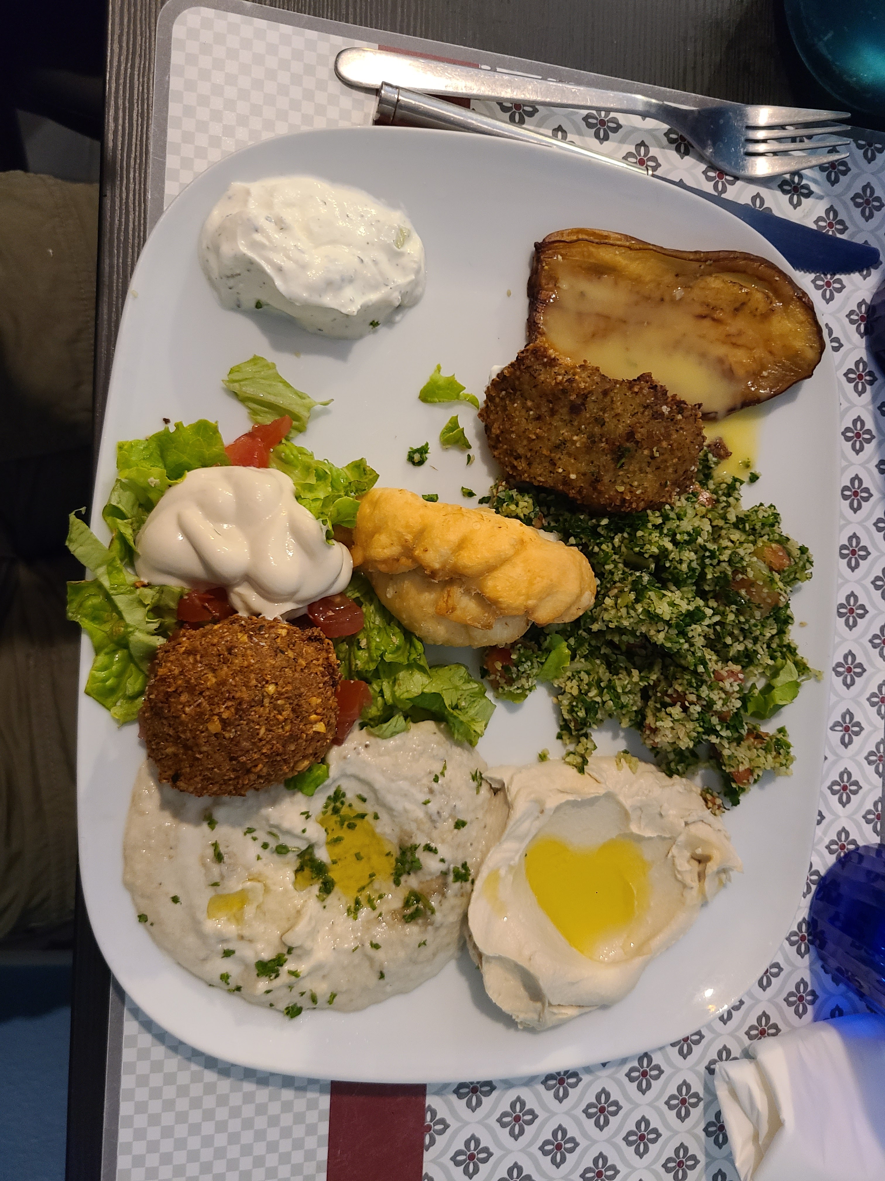 Un très bon restaurant, nous avons été très bien reçu et le service était au top. Nous avons commandé un plateau de mezze avec 7 assortiments végétariens et un dessert, c'était relativement copieux. Tous les plats sont végétariens !