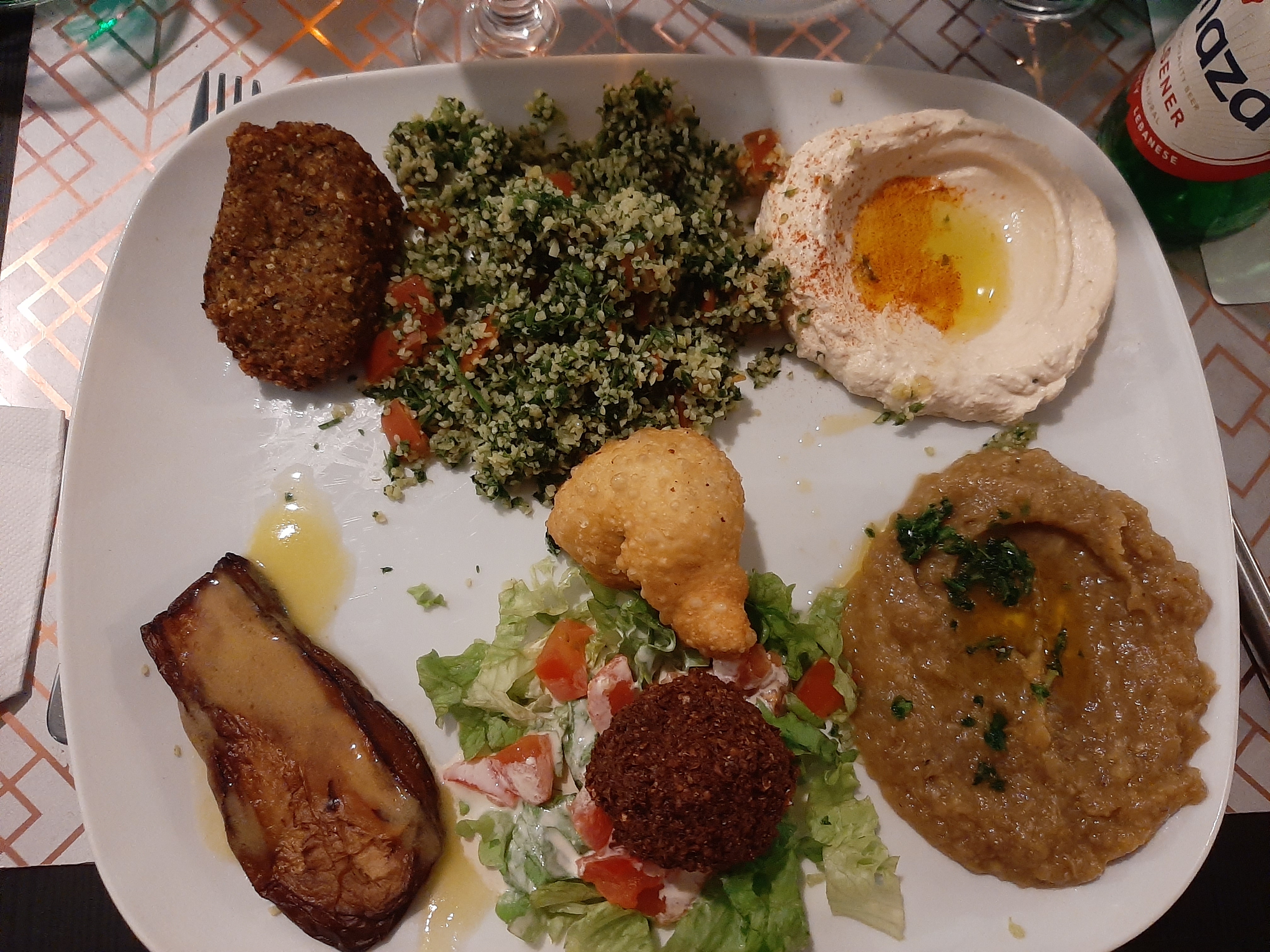 EXCELLENT RESTAURANT! on en sort à l'instant, 5 collègues de boulot. On ne connaissait pas du tout. Excellente cuisine faite maison. Très très très bon produit. Le houmous, caviar d'aubergine, falafel! TOUT EST BON! on a choisi une assiette avec pleins de produits différents! c'est un pur régal et le patron est adorable. Je recommande 10 fois!!!! vous pouvez y aller les yeux fermés si vous aimez le sésame, la menthe, le citron, aubergine bref la cuisine libanaise. La bière libanaise est très bonne! ETANT DONNE QUE CE SONT DES PLATS MAISON, LE TEMPS DE PRÉPARATION EST PLUS LONG ET C'EST TANT MIEUX !! Assiette en photo 14€ et on a plus faim