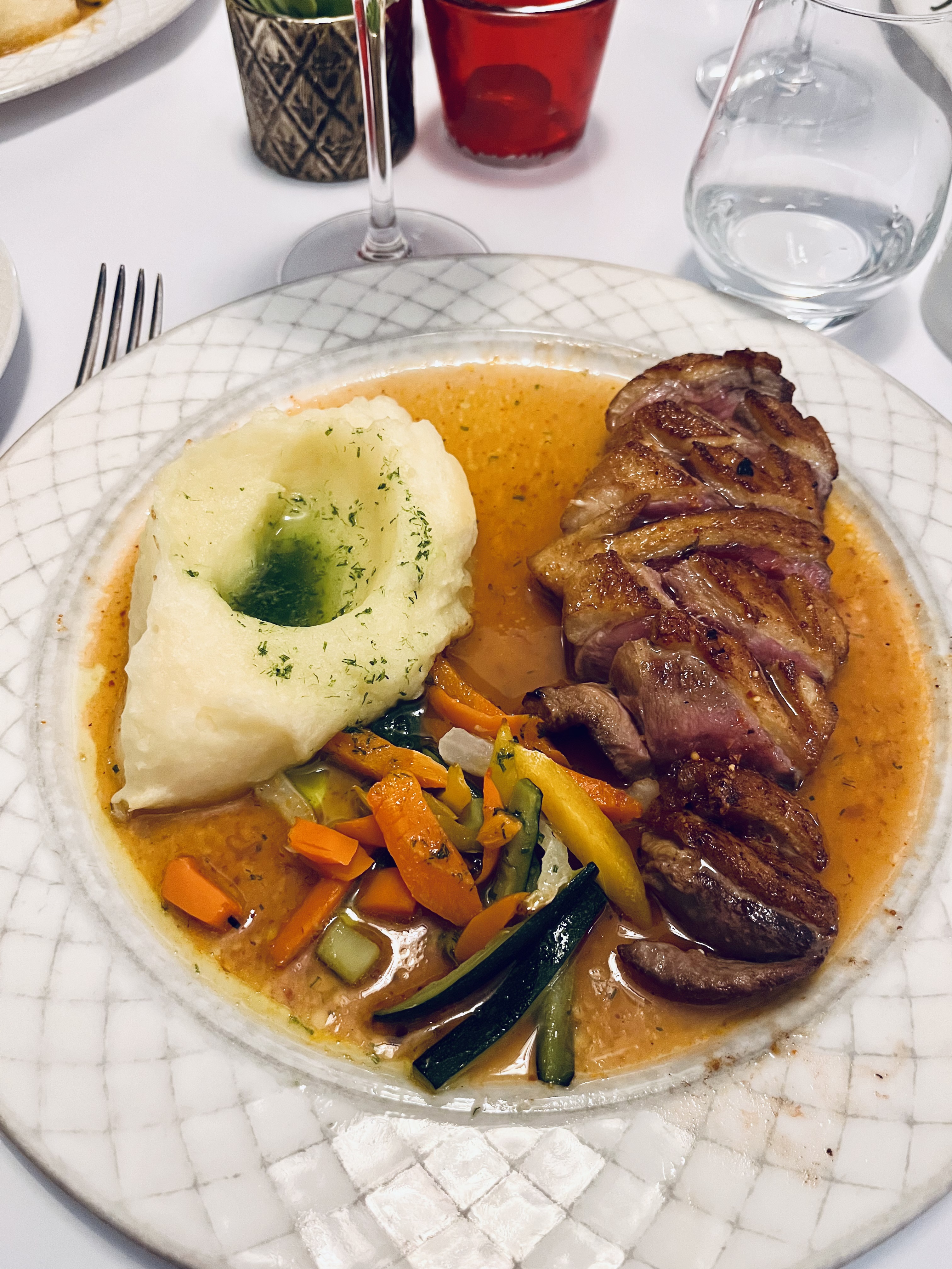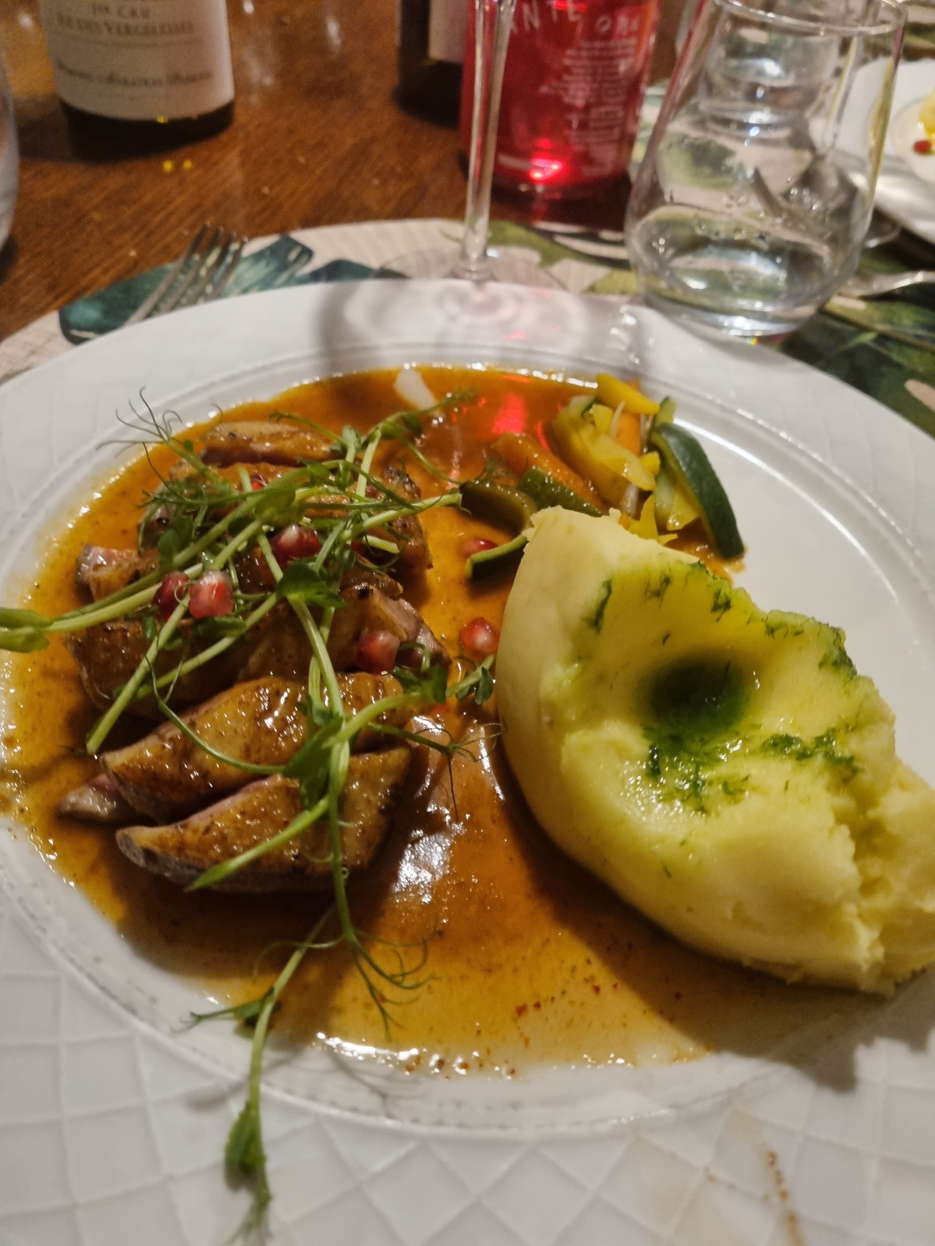 1° fois dans ce restaurant: repas excellent. Canette avec une cuisson parfaite, accompagnement type top et sauce un peu sucrée juste parfaite.. un sans faute pour le plat. J'ai voulu changer mes habitudes pour le dessert en prenant un nougat glacé mais je crois que malgré qu'il fut très bon... j'aurais préféré un tiramisu qui m'aurait certainement comblé. Chef très disponible pour un renseignement. Malgré le lieu très chic, les serveurs ne sont pas guindés donc c'est appréciable. Je vous recommande ce lieu sans problème.