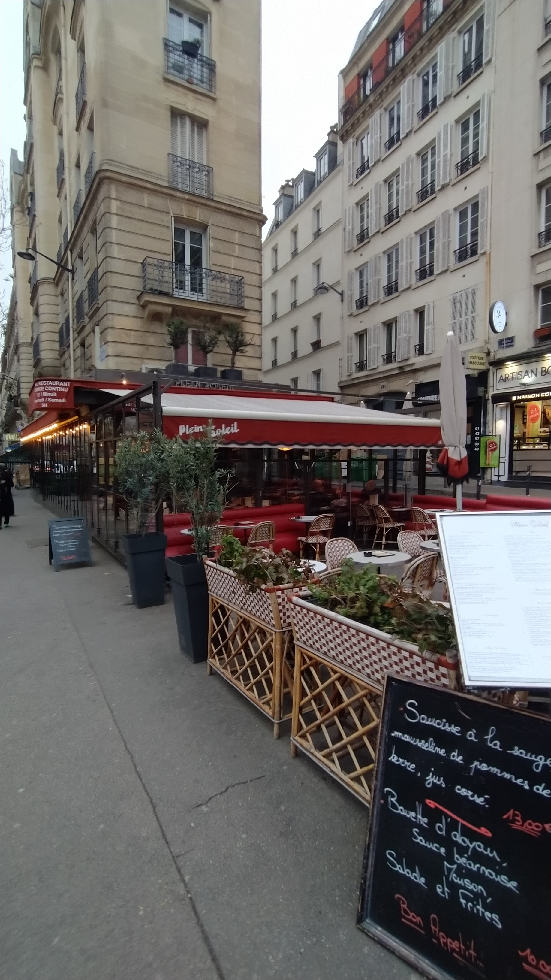 Les amis je vous conseille ce restaurant où tout est très bon et fait maison avec des produits frais. Très bons cocktails aussi. Prix raisonnable pratiqués dans tout bons restaurants parisiens Une grande terrasse d'où le nom Plein Soleil Il y règne une ambiance très sympathique et une bonne entente très cool entre les employés et la direction. Allez-y n'hésitez pas !!! 🏃♀️🏃♀️🏃♀️