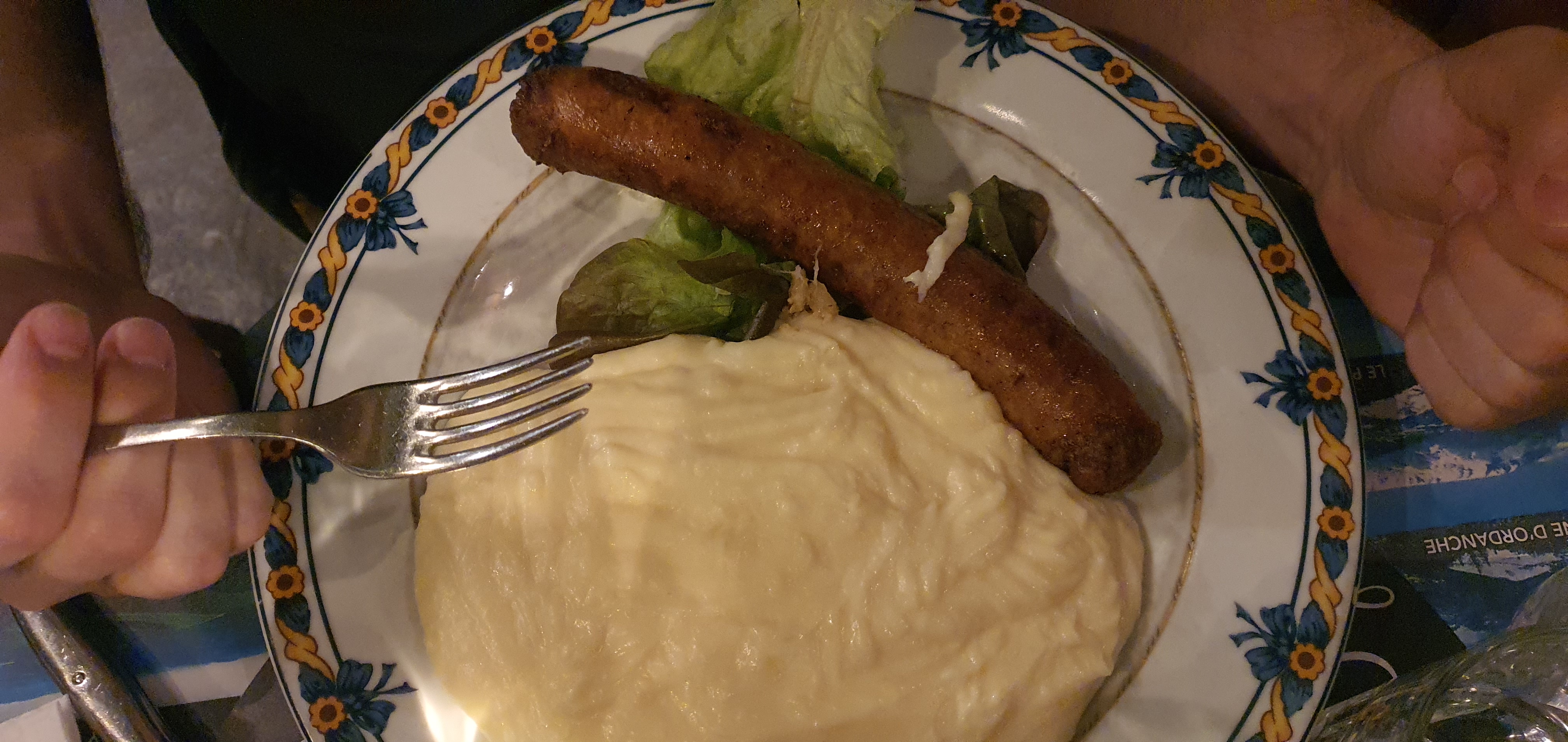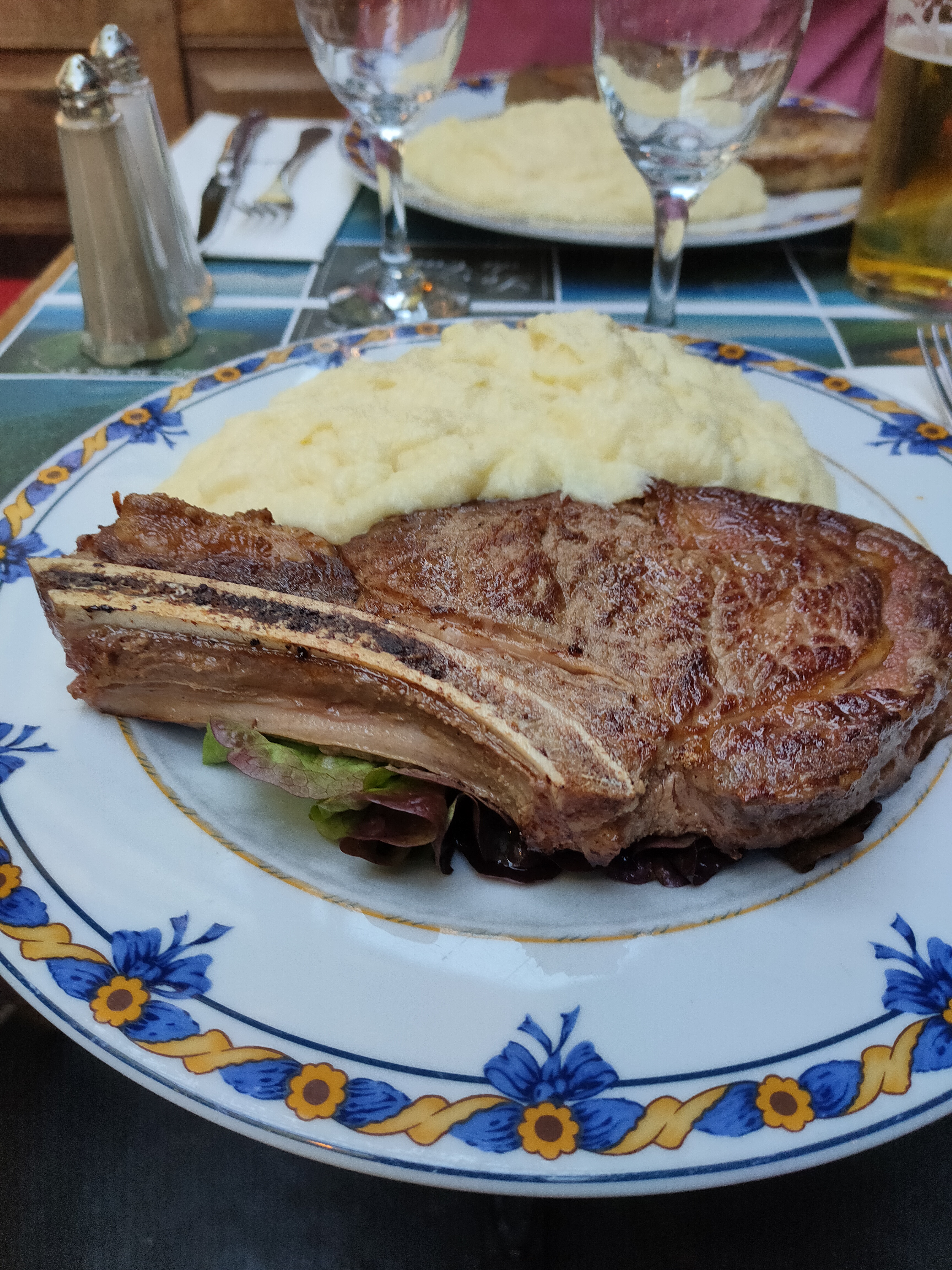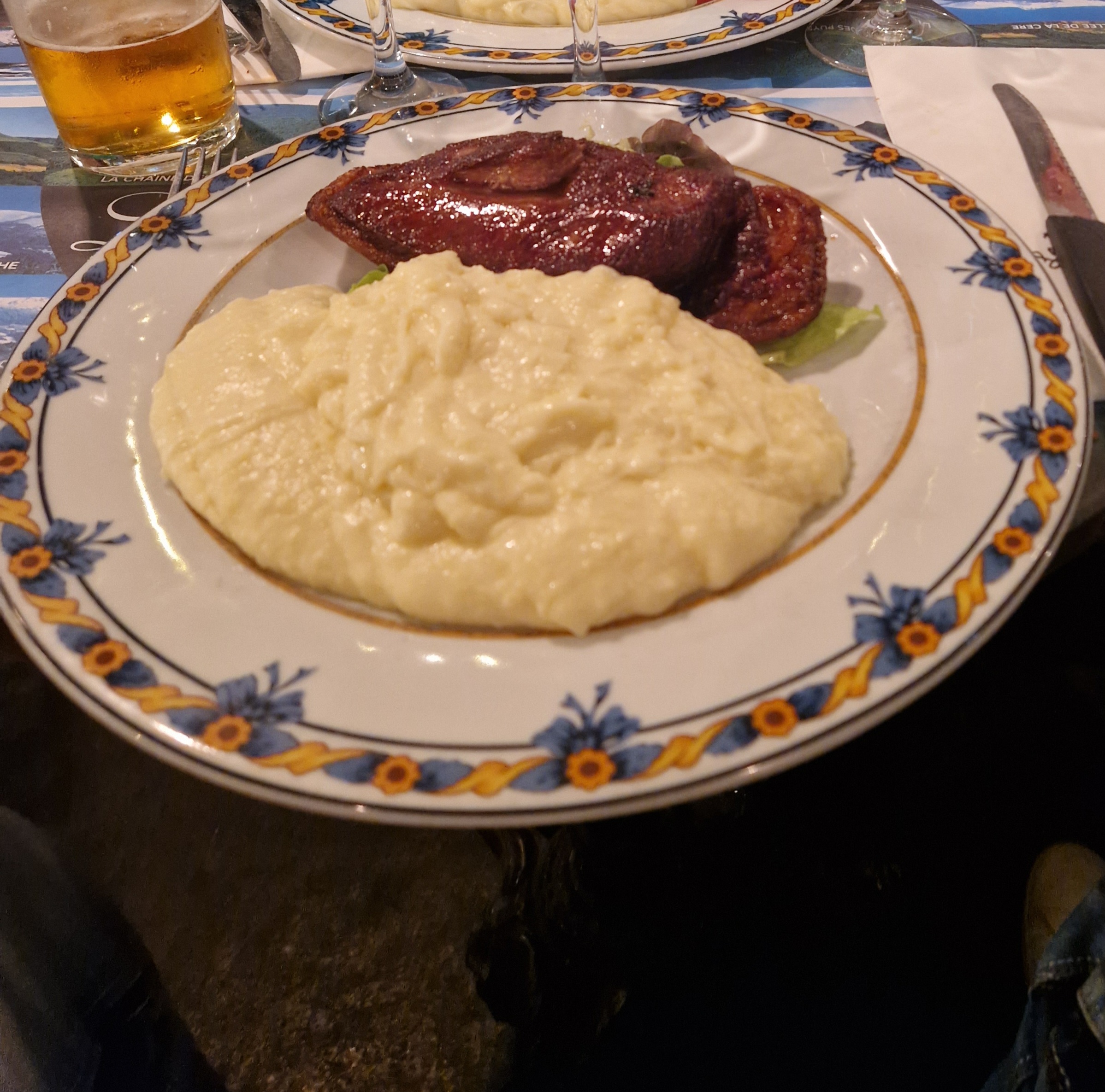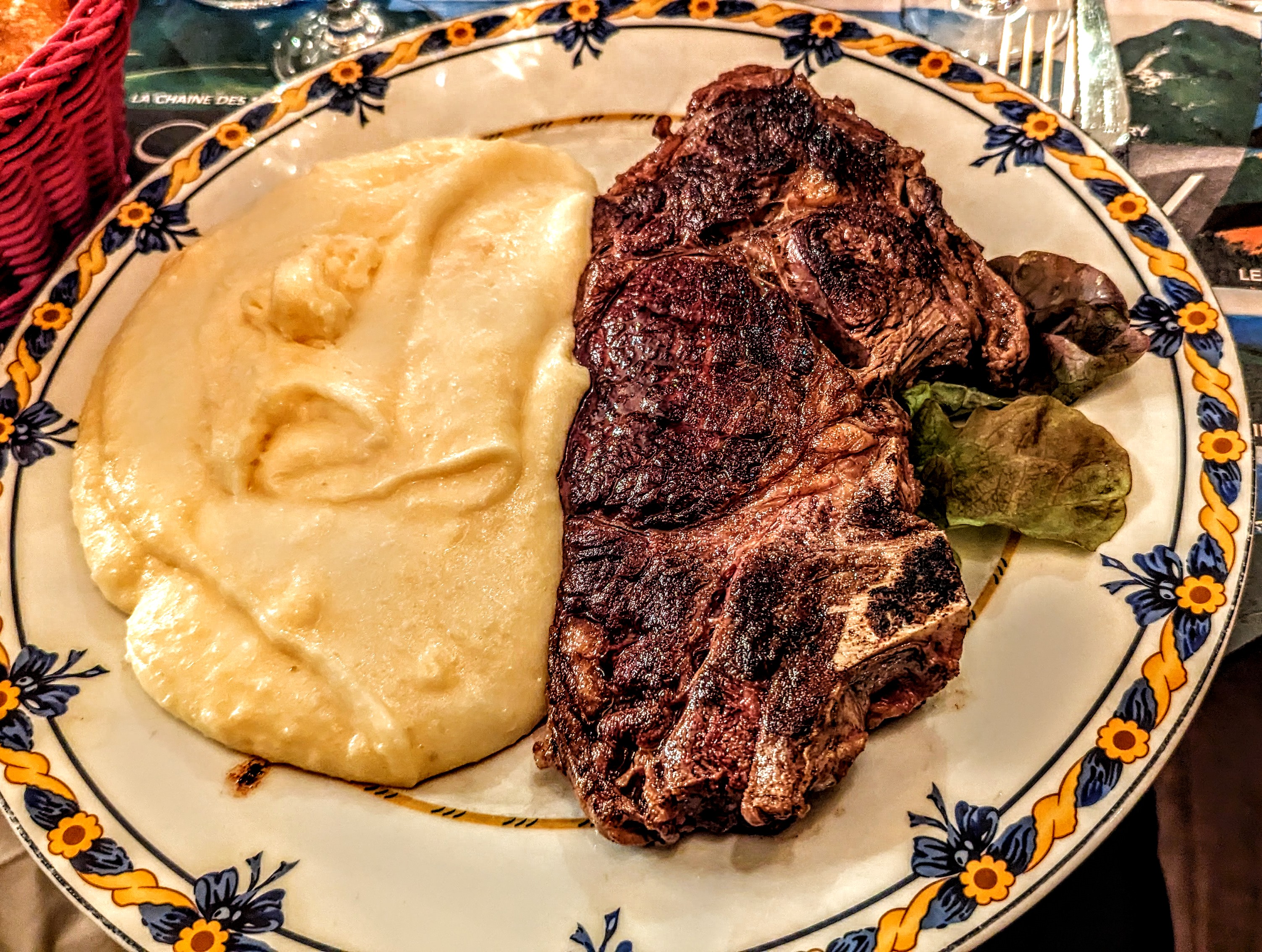 L'aligot était délicieux. C'était la première fois que j'en mangeais, et c'était comme quelque chose entre une purée de pommes de terre et un fromage fondu léger. L'entrecôte était bien cuite et se mariait très bien avec l'aligot. Ce n’était pas vraiment salé, mais ce n’était pas grave avec l’aligot. Le repas était d'un assez bon rapport qualité-prix à moins de 25 euros.