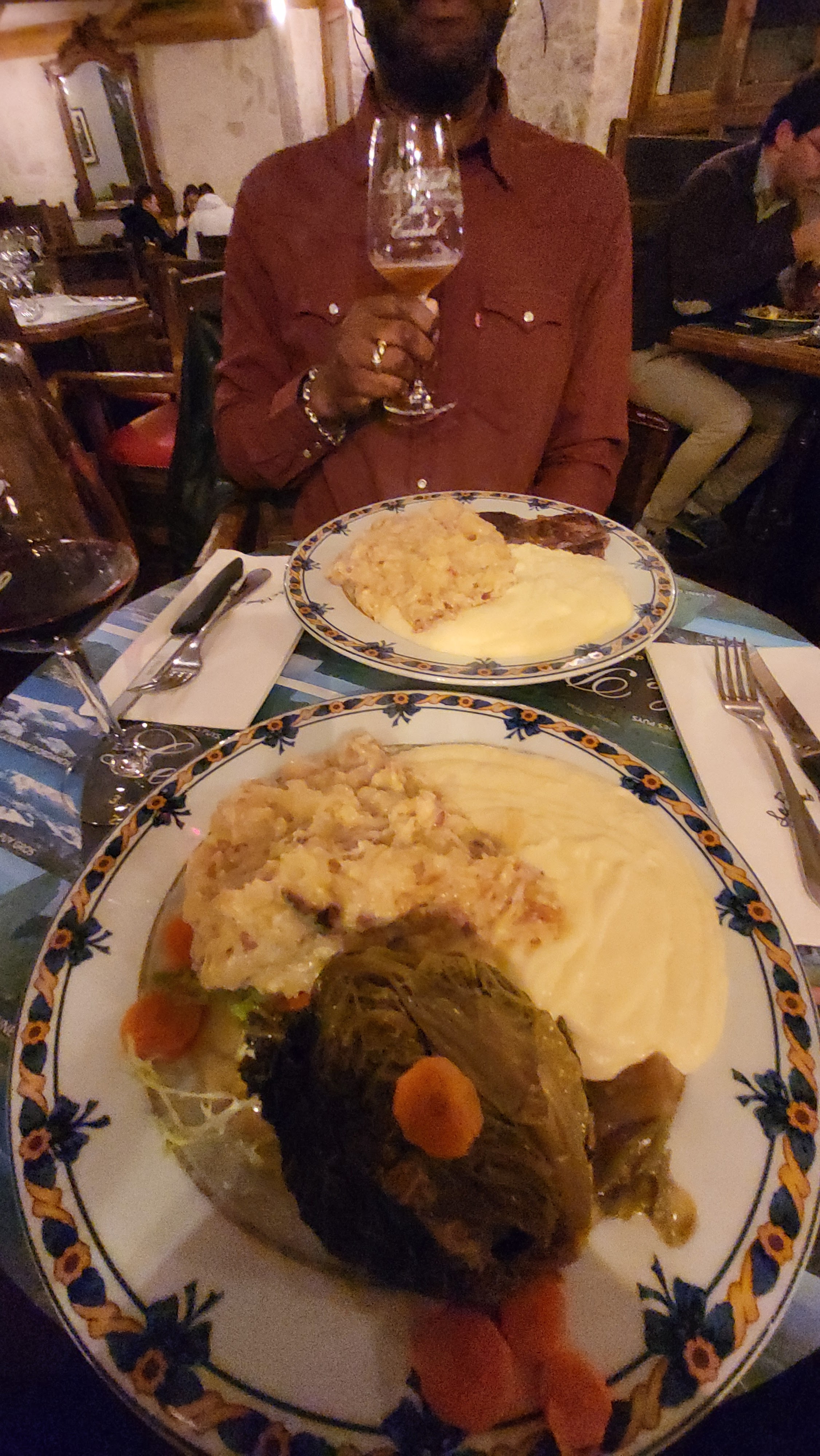 Tout d'abord, bravo à Ruben pour son service charmant, attentionné et amical - et son excellent anglais. Deuxièmement, les portions sont immenses. Si vous pouvez répartir les plats entre votre groupe, essayez. Les desserts ont l'air incroyables mais nous ne pourrions pas le faire. Troisièmement, procurez-vous le canard confit. J'ai essayé un peu celui de mes parents et c'était tellement meilleur que mon chou farci (il fallait plus d'épices et d'assaisonnement). J'ai essayé l'aligot et c'est vraiment bon mais je n'en ai mangé que 1/4. Très riche et très copieux. L'atmosphère est charmante et informelle et la carte des vins propose de nombreuses sélections abordables. Je reviendrais.