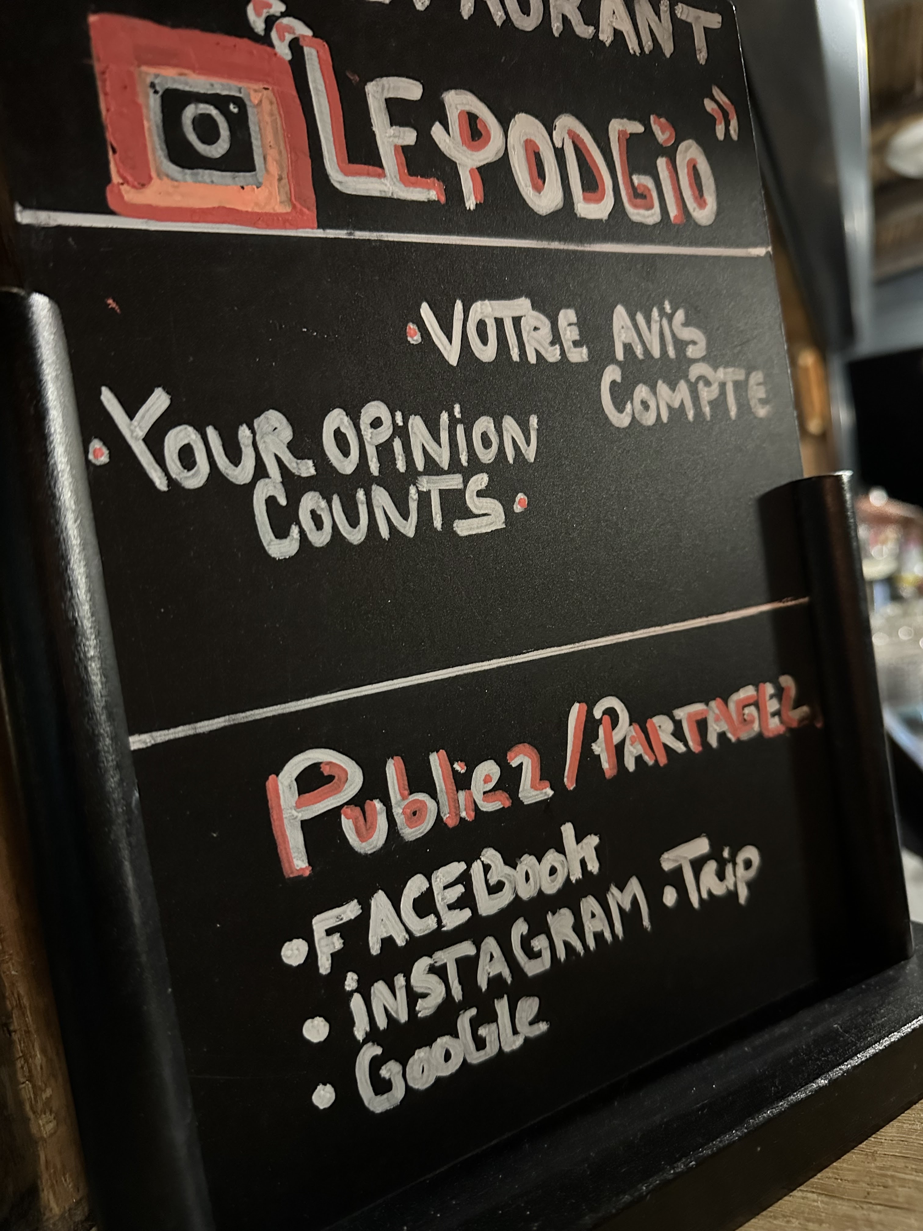 Un grand merci! C’était délicieuse et on a eu beaucoup de plaisir! Nous avons apprécié le bon service, la bonne vue et ambiance cosy. On peut recommander le Podgio à tout le monde.