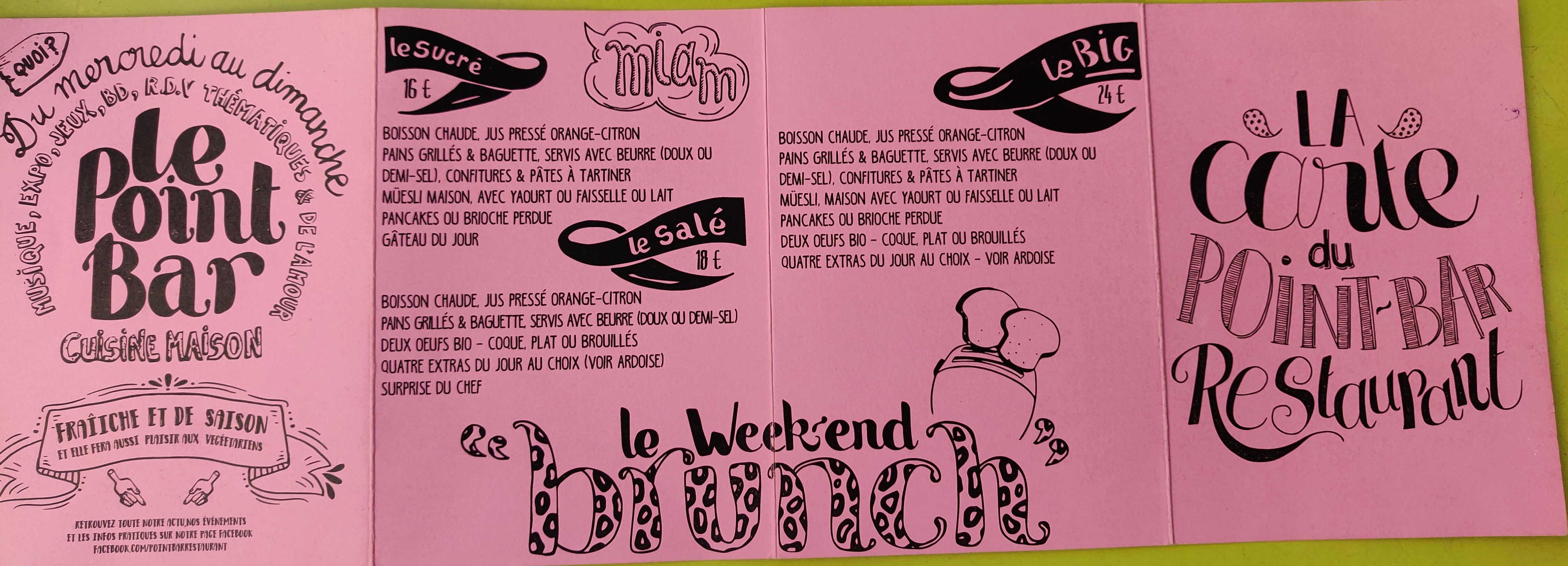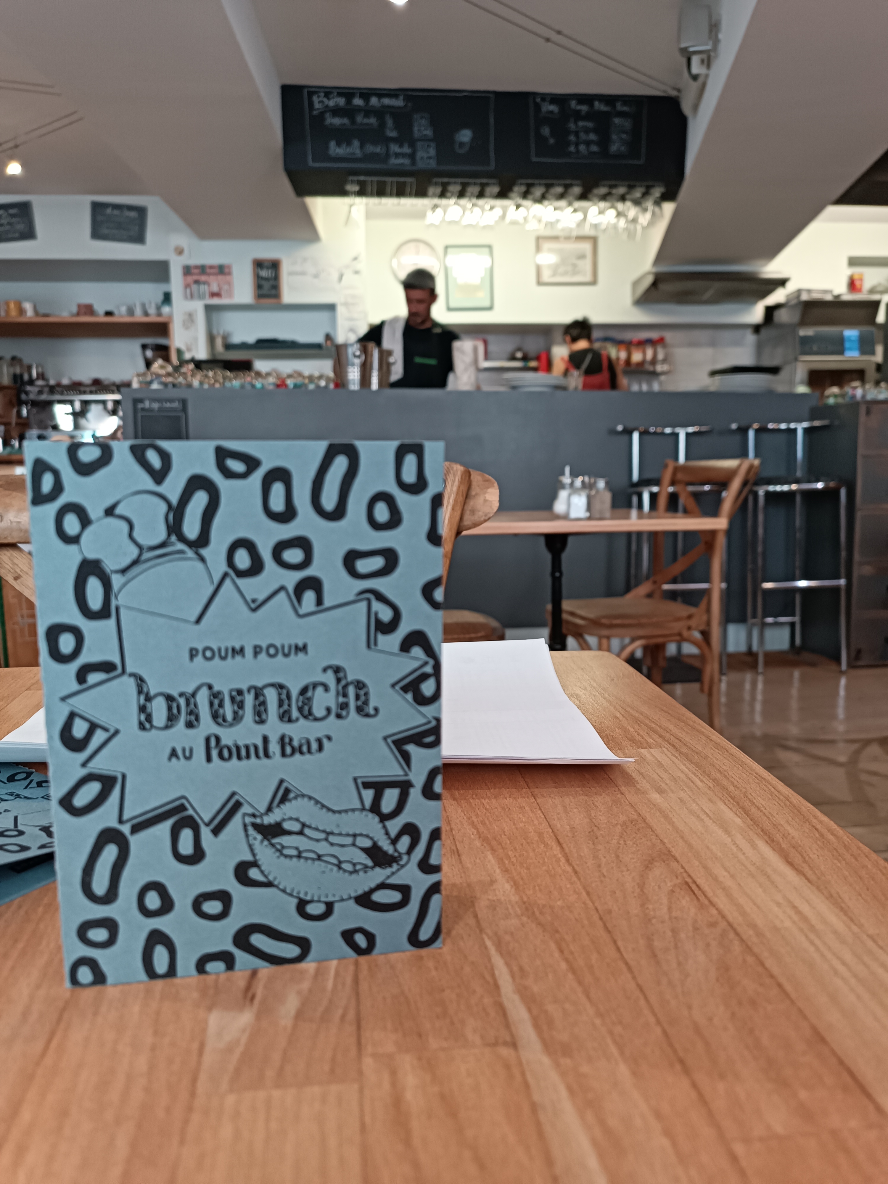 un brunch, un vrai, et original par dessus tout..bref, si vous voulez manger à votre faim de bon petits plats, le Point Bar est LE lieu où il faut aller. Je n'y malheureusement jamais eu l'occasion d'y aller le midi en semaine mais la carte quotidienne que je vois sur facebook me met toujours l'eau à la bouche !! :P le lieu est très accueillant, il y a un coin jeux & livre pour occuper les plus jeunes.