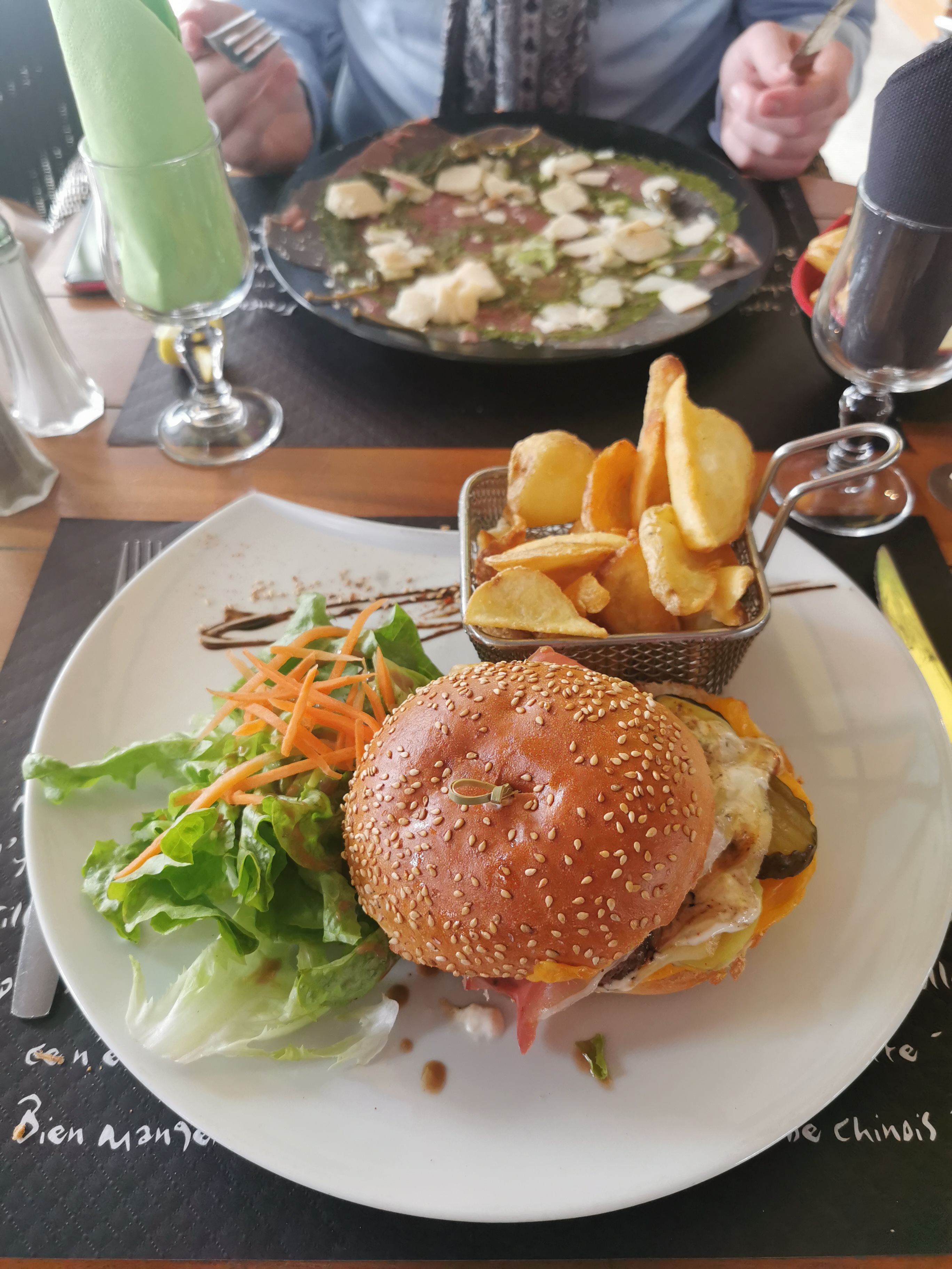 Je recommande: Prix raisonnables, qualité au rdv. Repas pris en salle avec moquette façon velours bleu, jolis mobiliers et ambiance cosy. Service rapide et souriant. Sanitaires propres. On a testé les burgers avec frites maison, et on a pas été déçus (celui chèvre / confiture de cerise est une belle surprise) En plus, on a pu régler l’addition avec les chèques vacances, bref… tout va bien vous pouvez y aller
