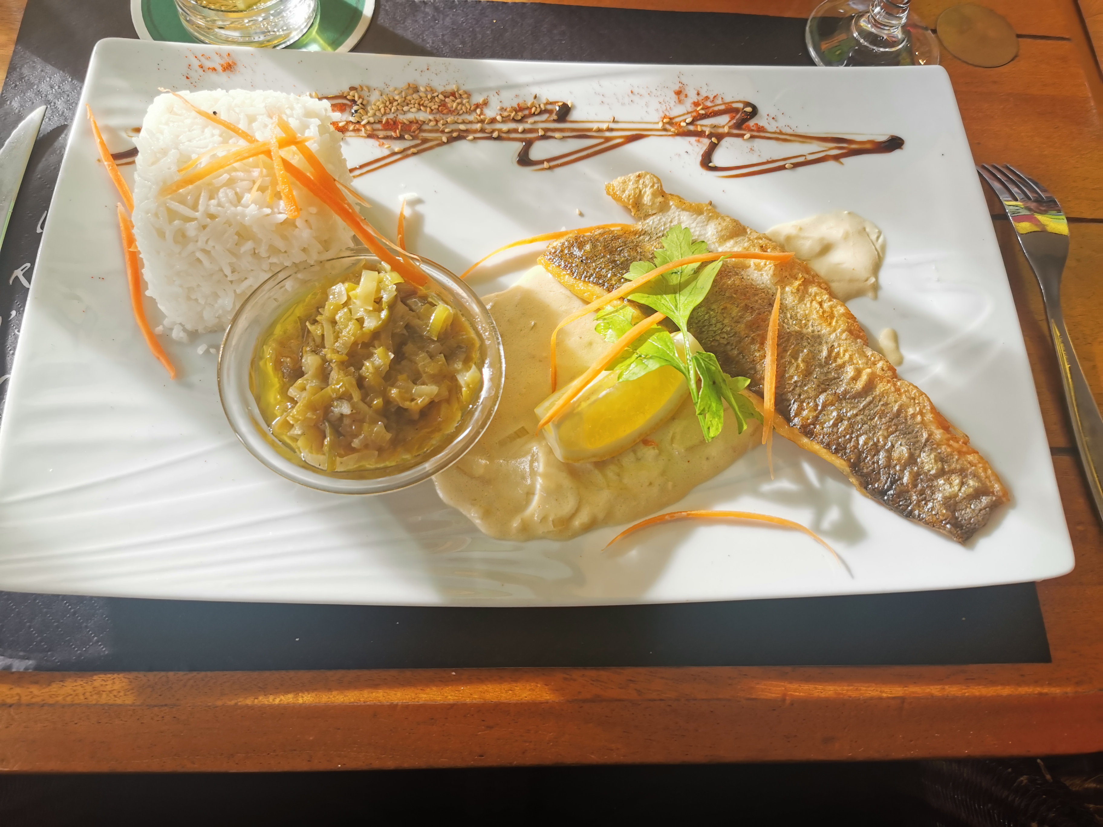 Avec ma femme nous avons un filet de dorade avec son risotto crémeux au chorizo, le plat était excellent, dessert copieux (crêpe Nutella chantilly). Le service impeccable, les serveurs et serveuse sympatique. Je recommande cet établissement. @bientôt