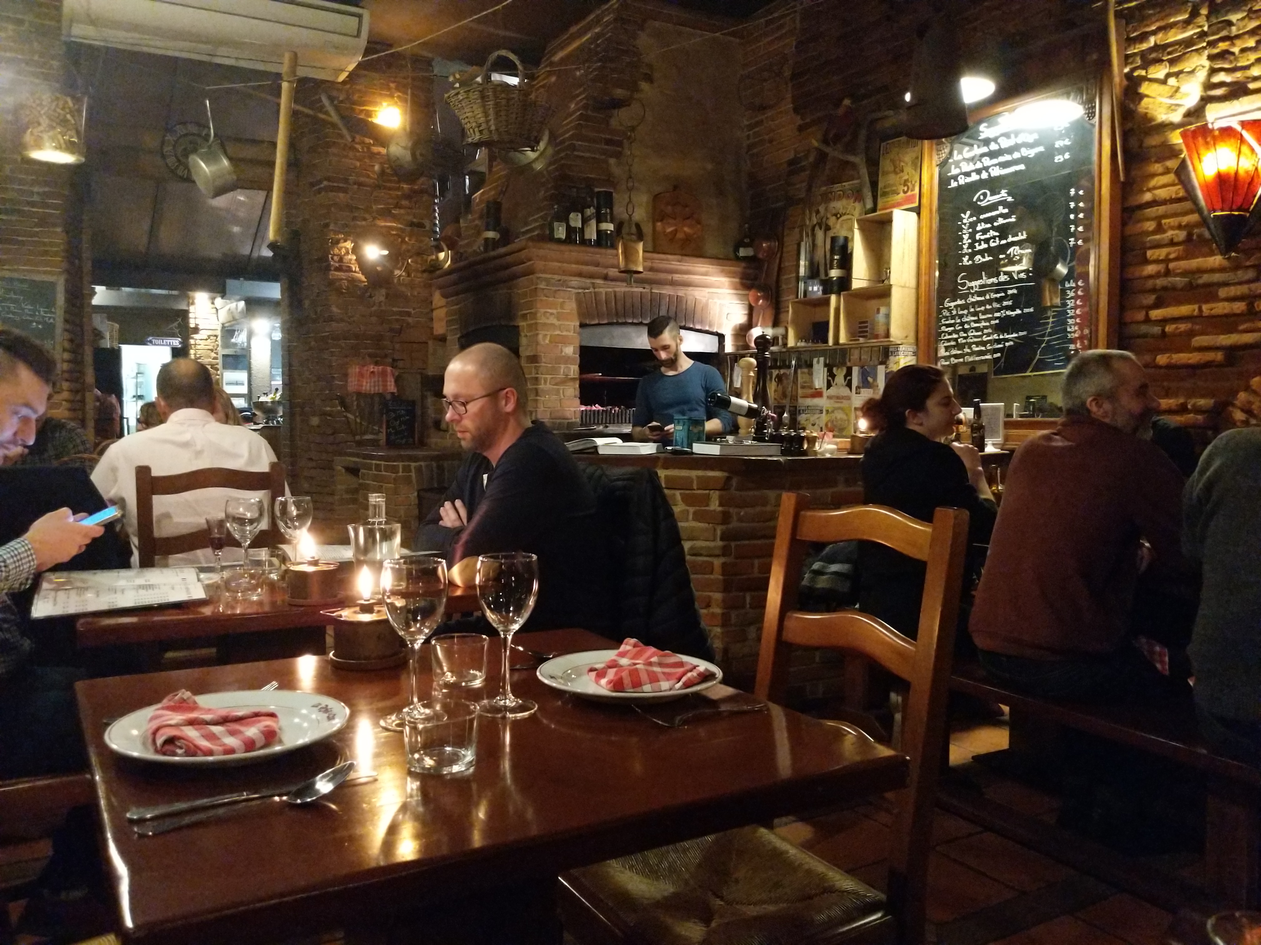 Très bien! On y a mangé un soir en couplé. Un vrai resto toulousain, avec briquettes, poutres et l odeur de la cheminée ! Le début est un peu surprenant, car le tarif des plats est plutôt cher, entre 35 et 40euros ! Mais cela comprend l entrée, le fameux panier de charcuterie à volonté ! La viande est un régal, cuite parfaitement dans la cheminée. Et on vous donne des vrai couteaux à viande qui coupent comme des rasoirs! Le service est très bien, rien à dire. Je recommande fortement ce restaurant pour les grosses faims, car la il y a à manger et c est, bon! Si je devais critiquer, je dirais qu il manque une petite sauce pour la viande. Et l adition un peu salé à la fin, le vin étant trop cher. Mis à part cela, tres tres bon restaurant ! Bravo, car cela dure depuis plus de 20 ans!