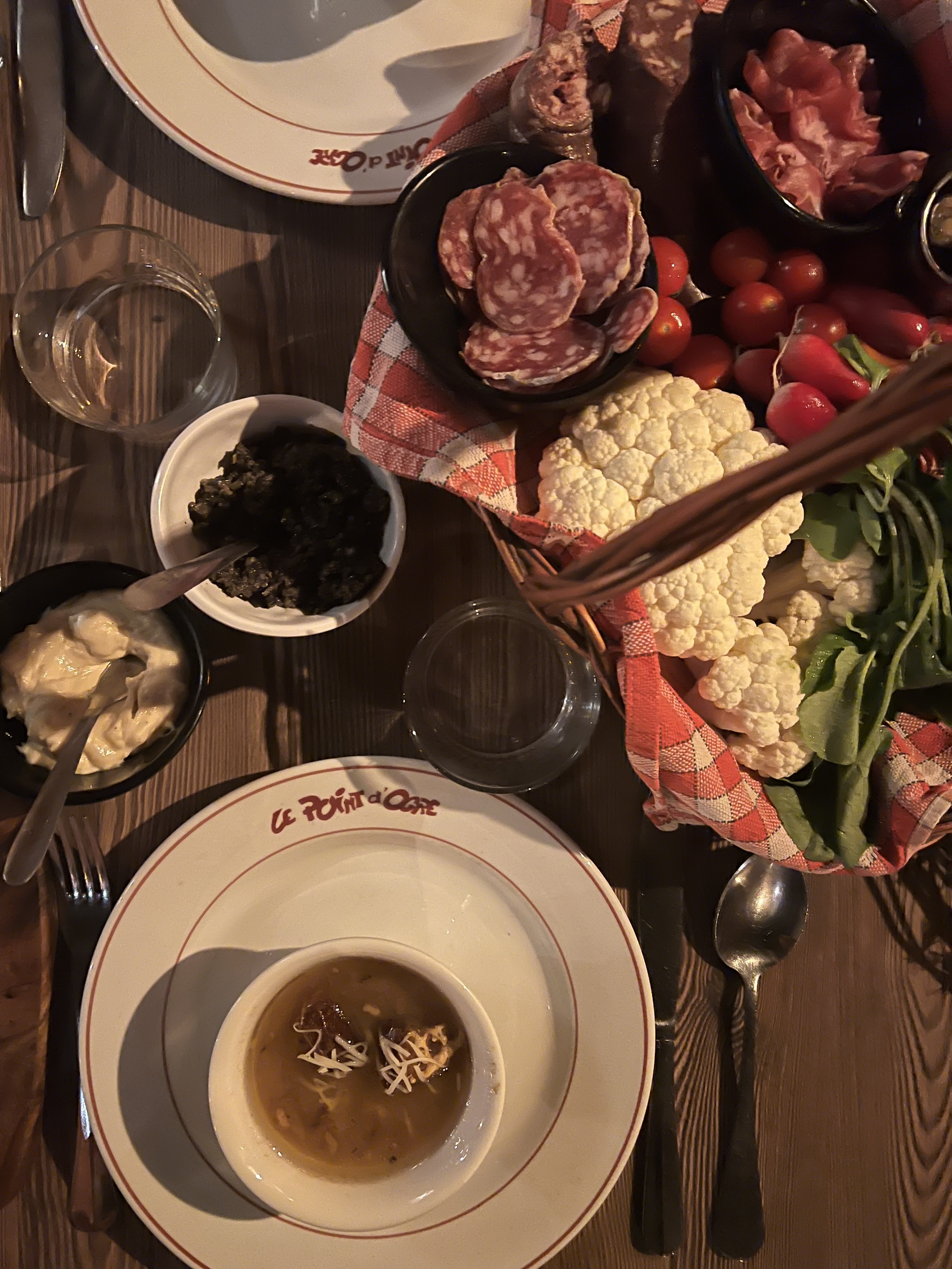 Une entrée surprise copieuse, intégrée au plat (entrée partagée) avec une soupe très parfumée et un assortiment de charcuterie/crudités. Les plats sont généreux, la viande excellente. Mention spéciale pour la polenta de lait de chèvre: un véritable délice, crémeuse et bien parfumée ! Seul bémol: nous étions 8 et le brouhaha de cette belle cave typiquement toulousaine ne nous permettait pas d'entendre le bout de la table. Ça reste notre seule critique si c'en est une. Nous avons passé une super soirée !
