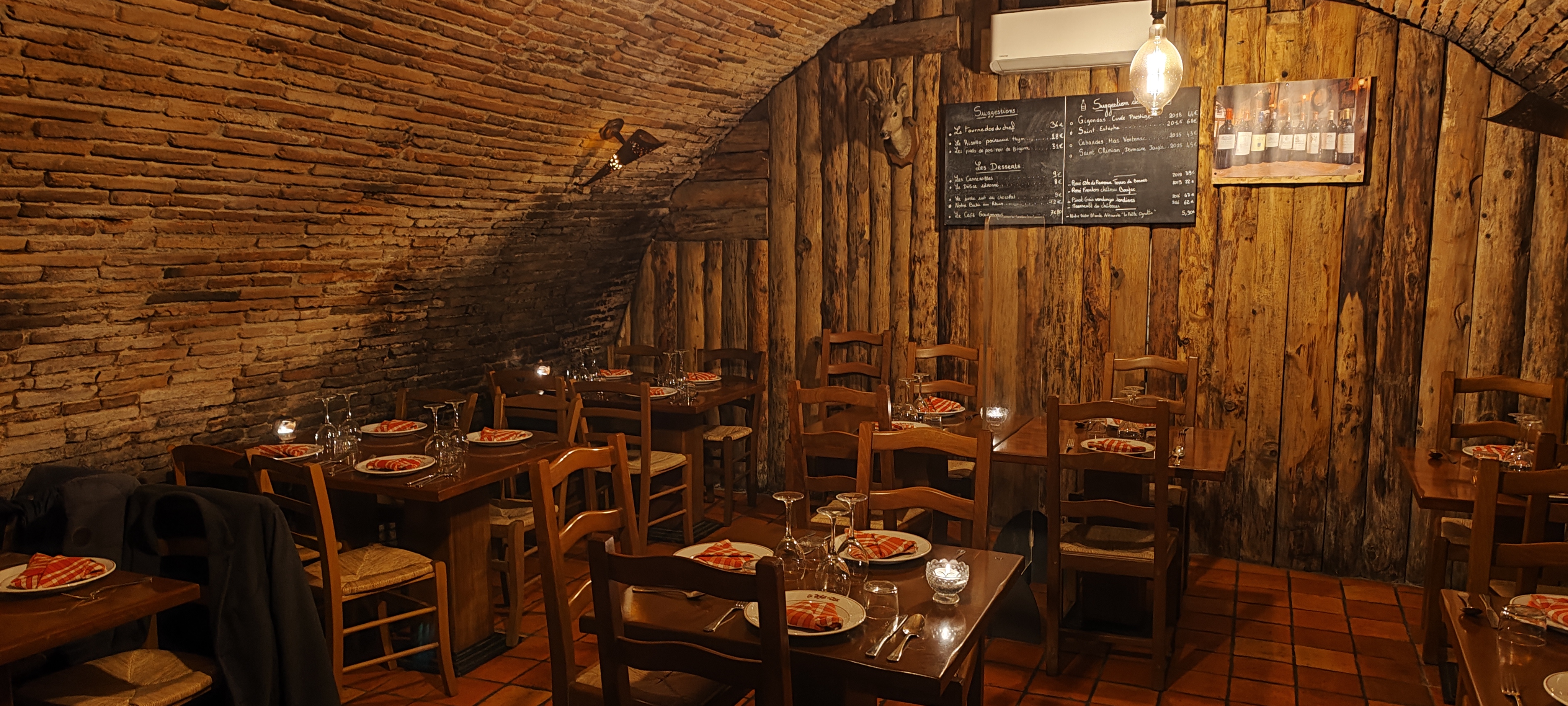 Quel endroit ! Le lieu est tellement chaleureux en briquettes, la partie cave est géniale ! L'endroit idéal pour un repas en famille ou entre amis ! Peu de choix sur la carte mais que des bons produits ! Le panier servi pour la table en entrée donne un côté ancienne table traditionnelle très sympa ! La cote échine de porc noir... un délice ! Le tout est très copieux ! Service au top, ils prennent le temps. Possible de se faire servir le plat tard , nous avons fait traîner l'apéro et avons commencé à manger à 22h sans que cela pose problème ! Le seul point d'ombre de mon côté est la carte des vins.. pas assez de références et certaines un peu chères en qualité prix .. Nous reviendrons !