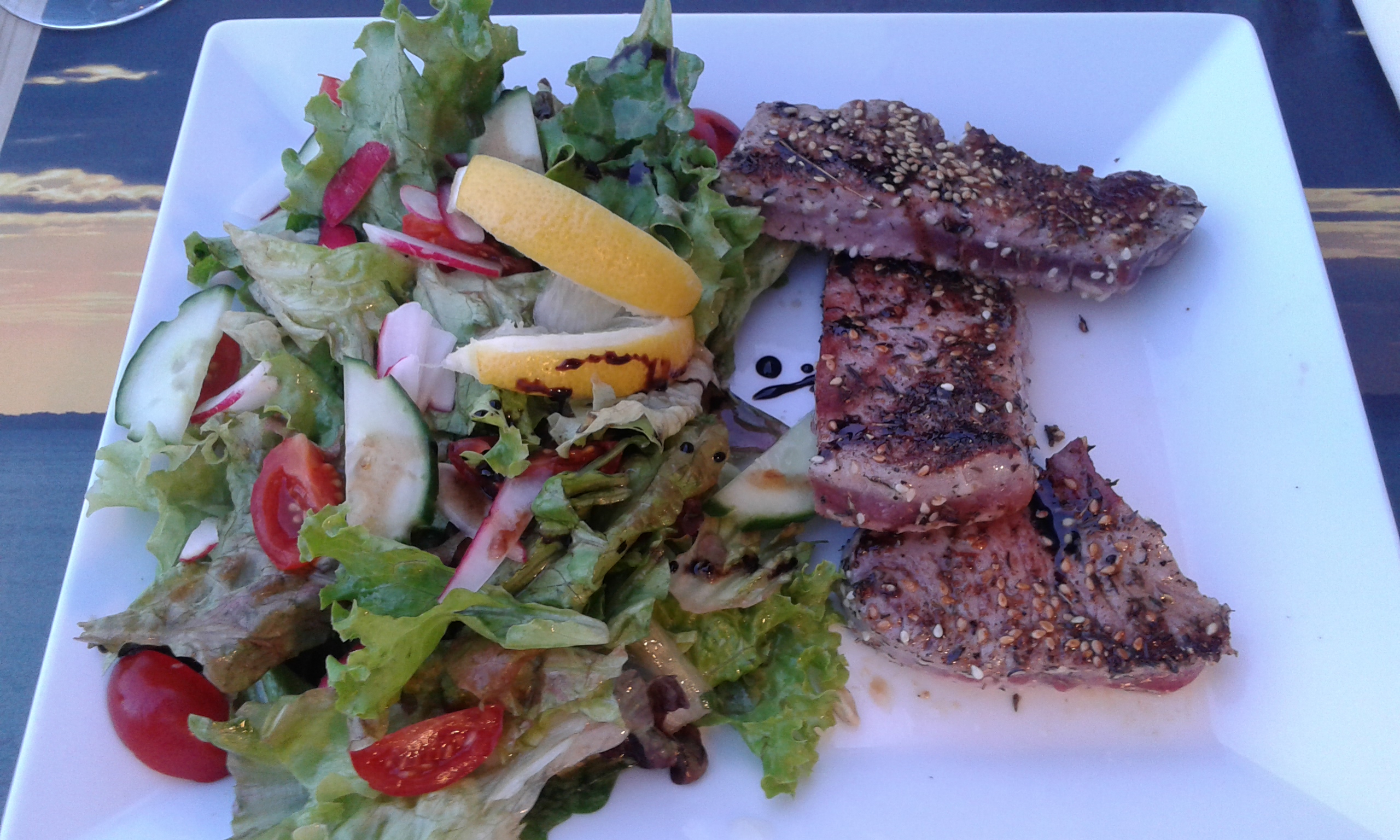 Des produits frais Une carte interessante de poissons grillés ou frits A tester : le plat la sirène de Thau avec brochettes de poissons crevettes calamars saumon lotte st jacques avec petite salade + riz ratatouille Cuisson bien maitrisée En apéro un savoureux et généreux mojito Service rien a redire Seul petit bémol une salle a l étage donc pas de terrasse extérieure Baie vitrée fermée plus clim : dommage a cette période de l année malgré toutefois une belle vue sur l étang de Thau