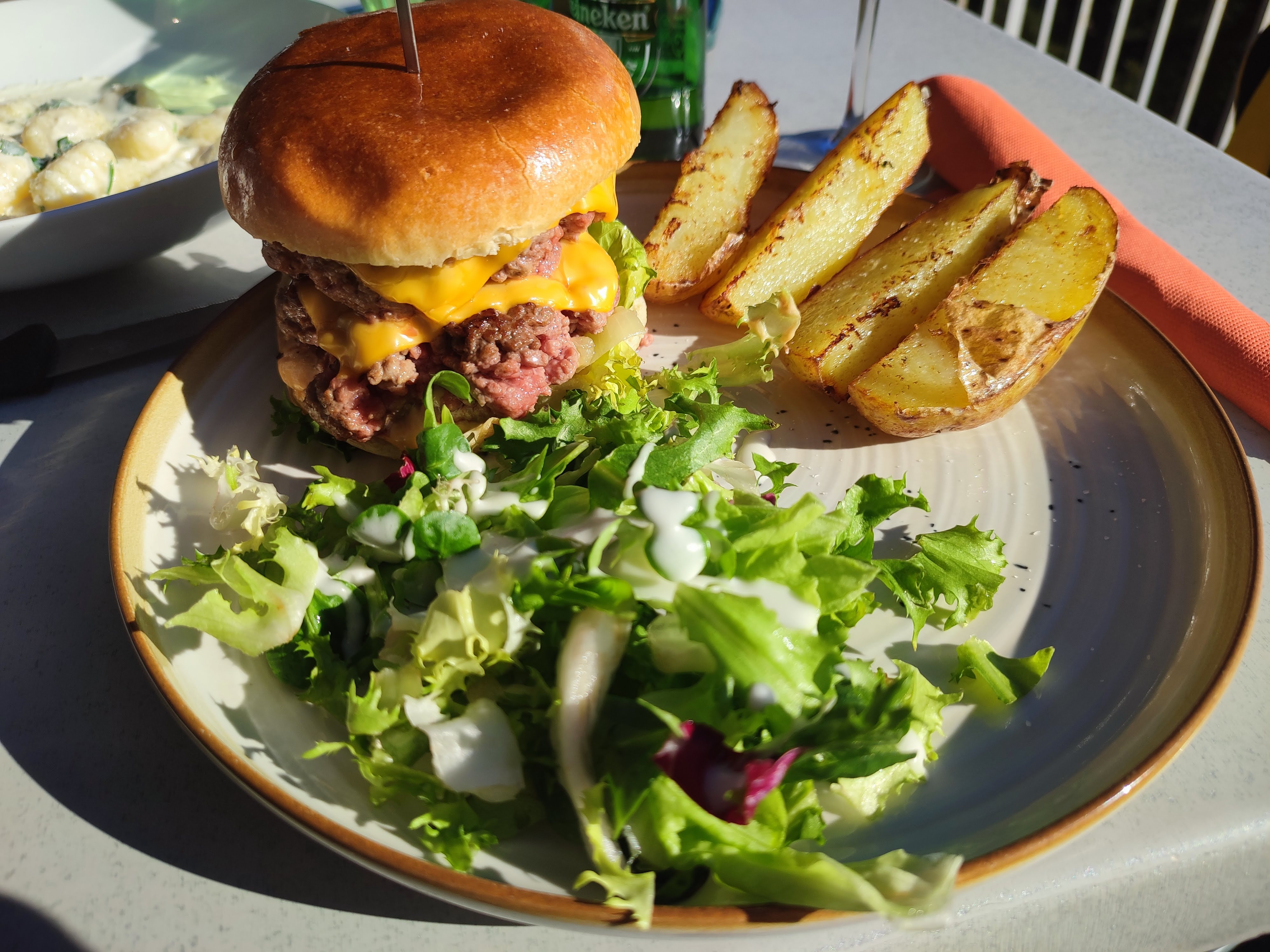 J'ai pris un hamburger. Je pense m'être trompé car le plat du jour avait meilleure allure. Malheureusement pour moi, viande haché caoutchouteuse de qualité mediocre et sans intérêt. Frites congelées avec un goût particulier. Je met 3 car je pense que les hamburgers sont le parent pauvre du snack car j'ai vu passer de beaux tournedos et de belles salades. La vue et le cadre sont très agréables sur la baie de villefranche et le snack ambiance de village avec beaucoup de monde qui se connaissent. Je trouve dommage dans un cadre aussi agréable et un lieu très touristique que la qualité des produits sur le hamburger ne soit pas au rendez vous même si on sens une volonté. (Oignons confits) J'aurais été prêt à payer 2 à 3 euros de plus pour avoir une viande fraîche juteuse et des frites maisons.