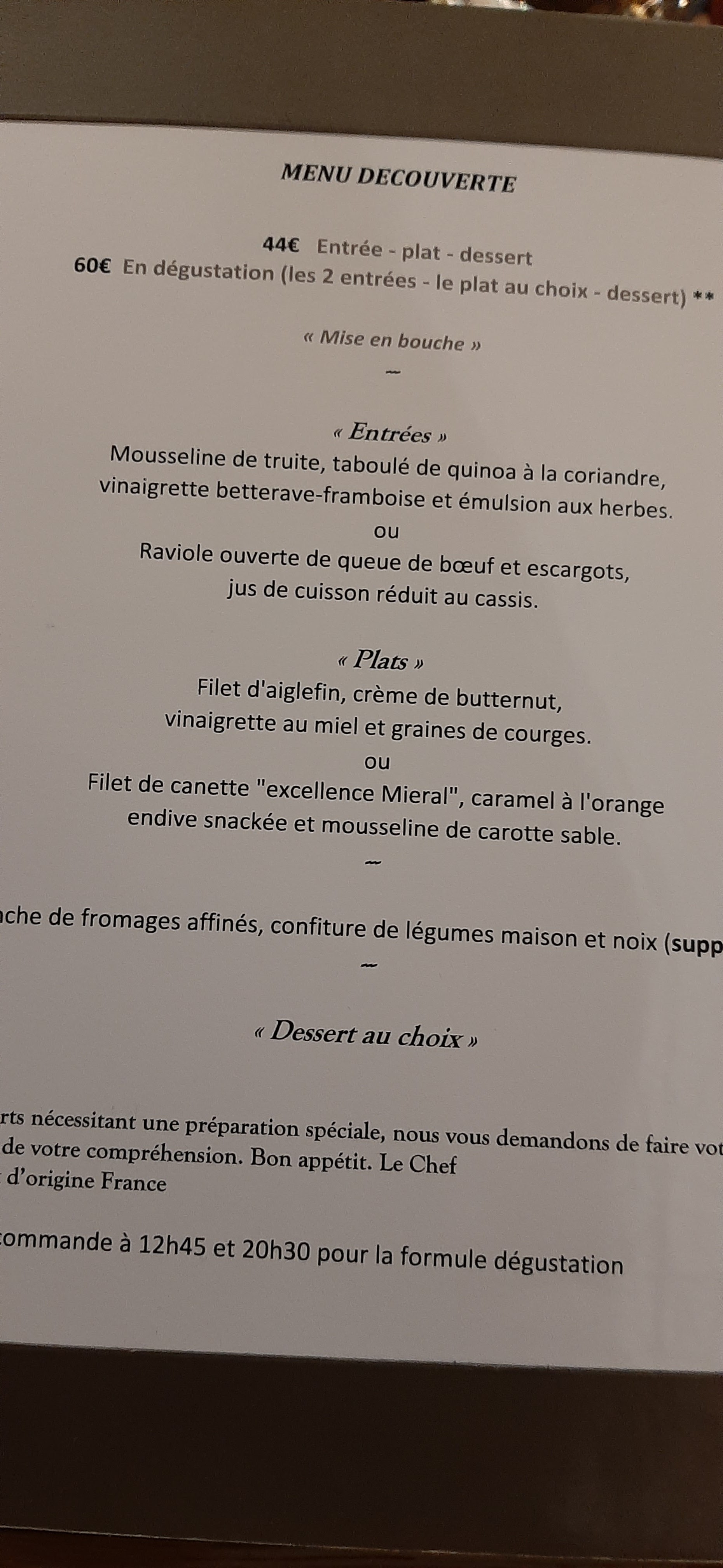 Excellent repas , tout est parfait : cuisine / lieu / service . Je recommande .