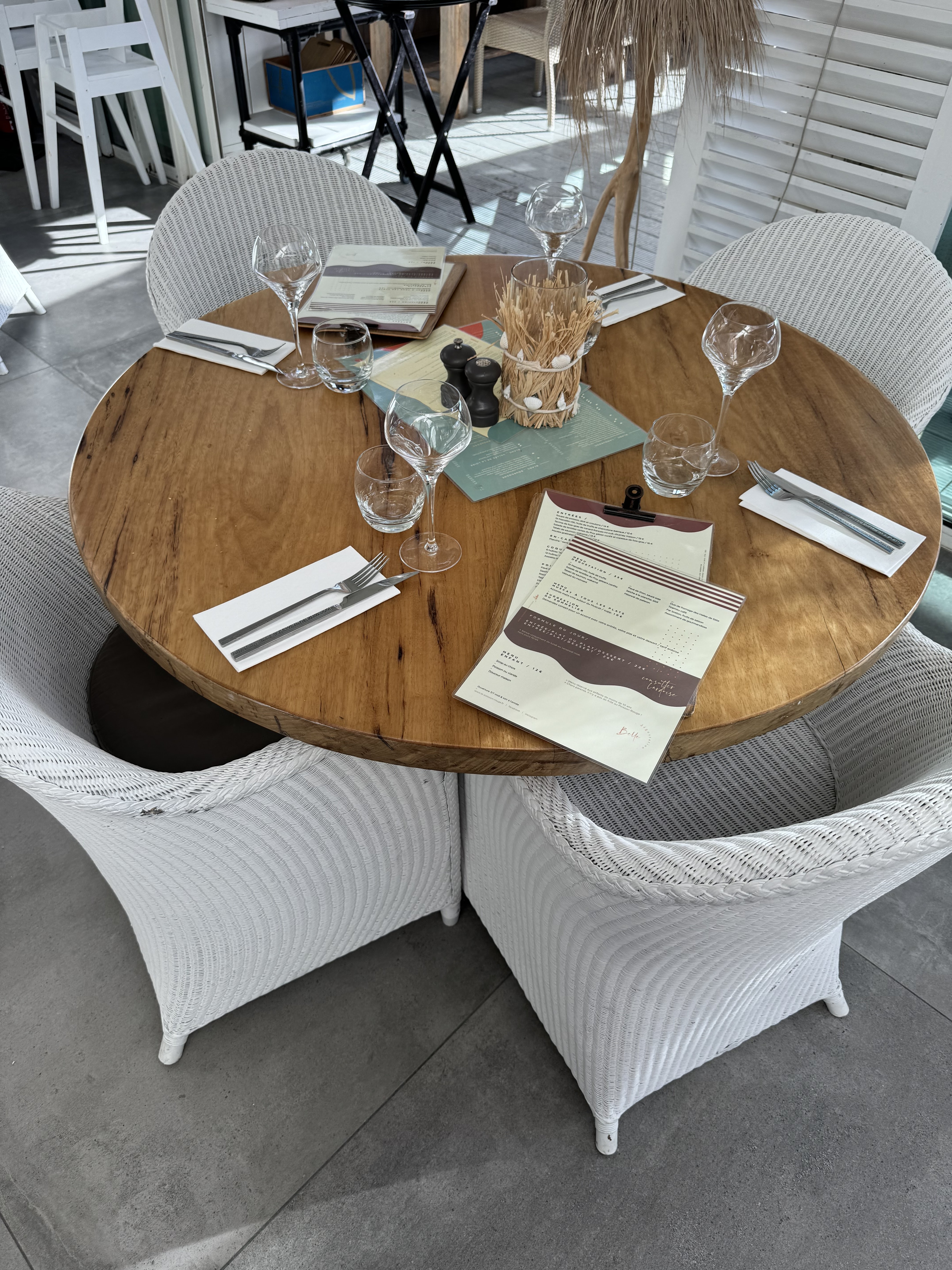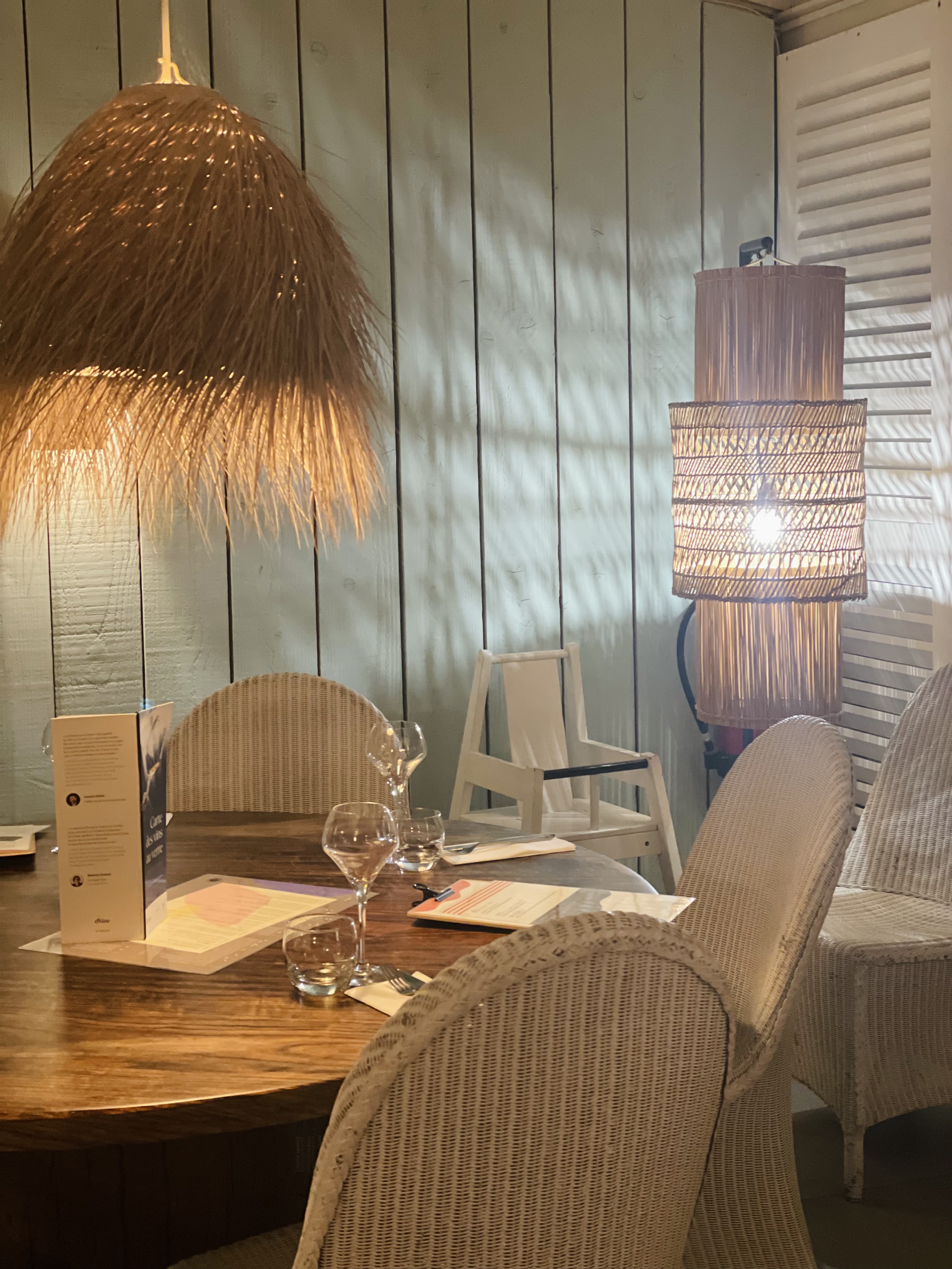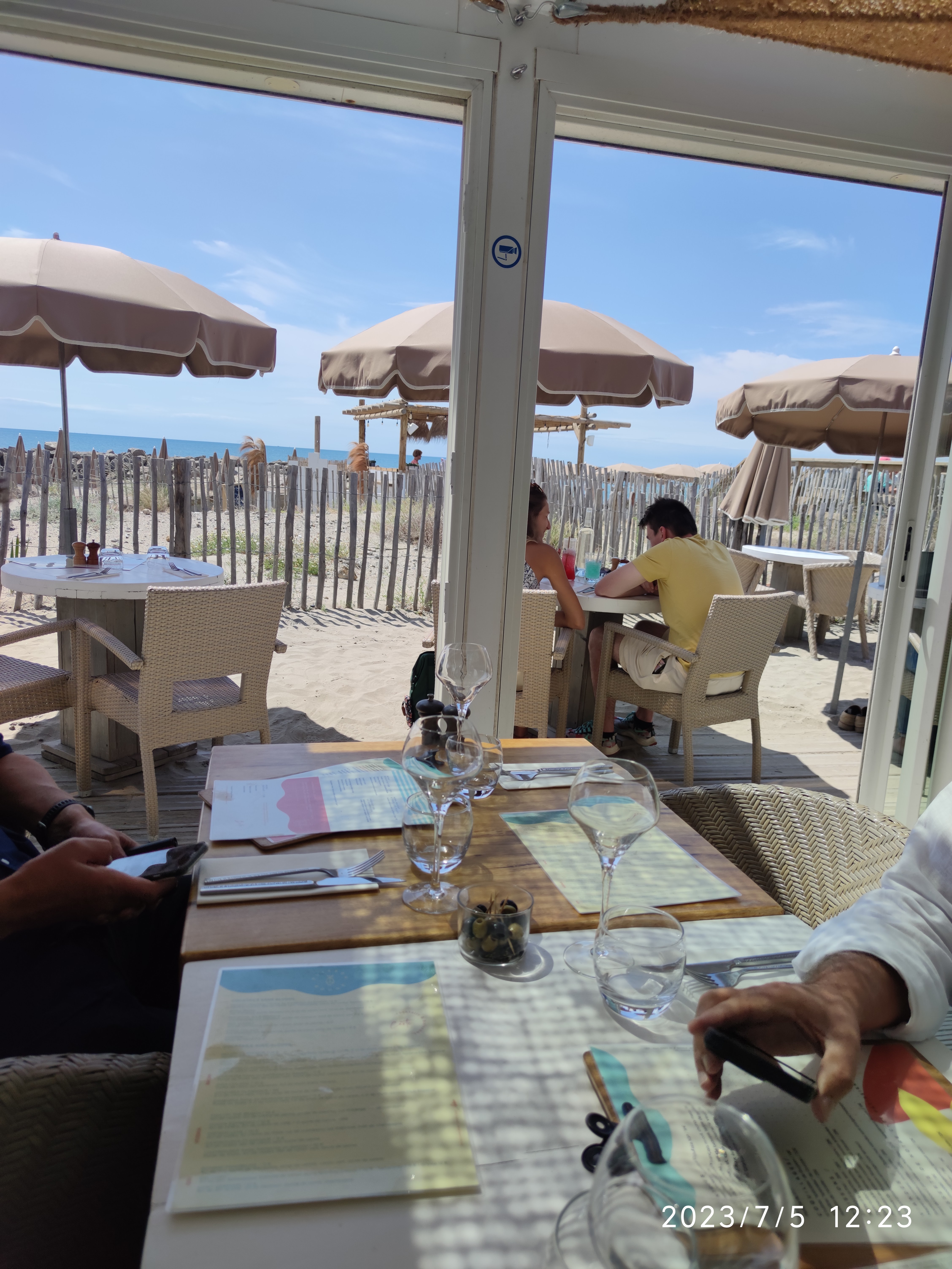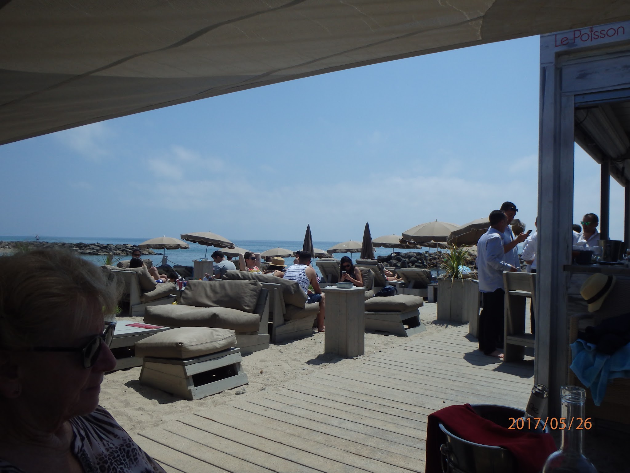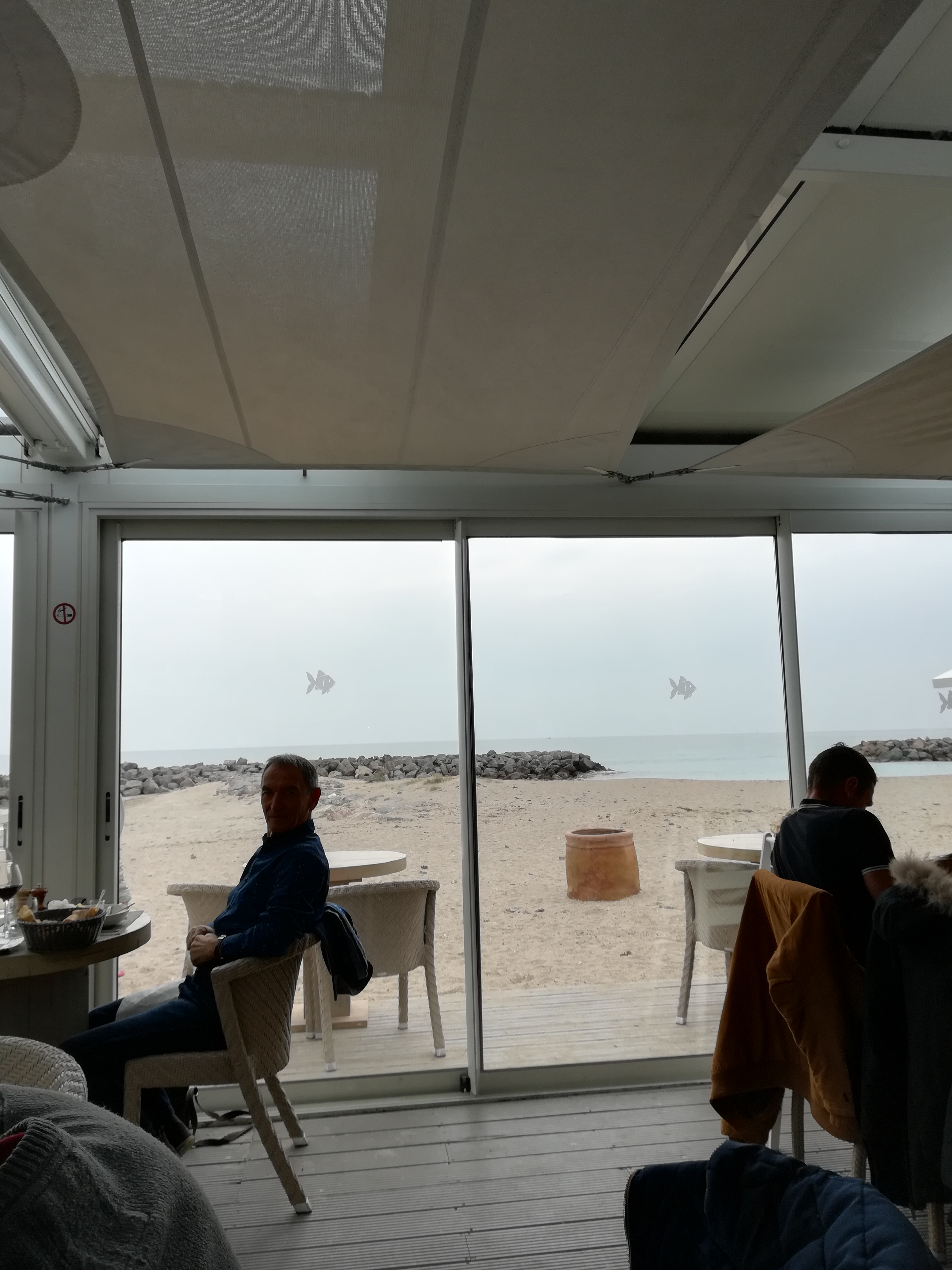 Bonjour Déçu par ce restaurant dont on m'avait vanté l'implantation avec vue sur la mer. En fait de vue,en terrasse on a devant les yeux la palissade qui sépare de la plage privée et quasiment rien de la mer. Côté restauration,les plats sont bons,mais au vu des tarifs,on ne s'attend pas à moins. Le service est correct, sans plus,(j'attends toujours mon verre de vin) Ambiance bobo,très bruyant,le restau est souvent complet en terrasse,n'y allez pas pour y trouver calme et sérénité... Une idée des prix,pour un peu plus de 100 euros j'avais : 2 apéritifs Une assiette de crustacés (6 huitres 6 bulots 6 crevettes) Une seiche à la plancha Un turbo à la plancha Un café . En résumé, globalement décevant.