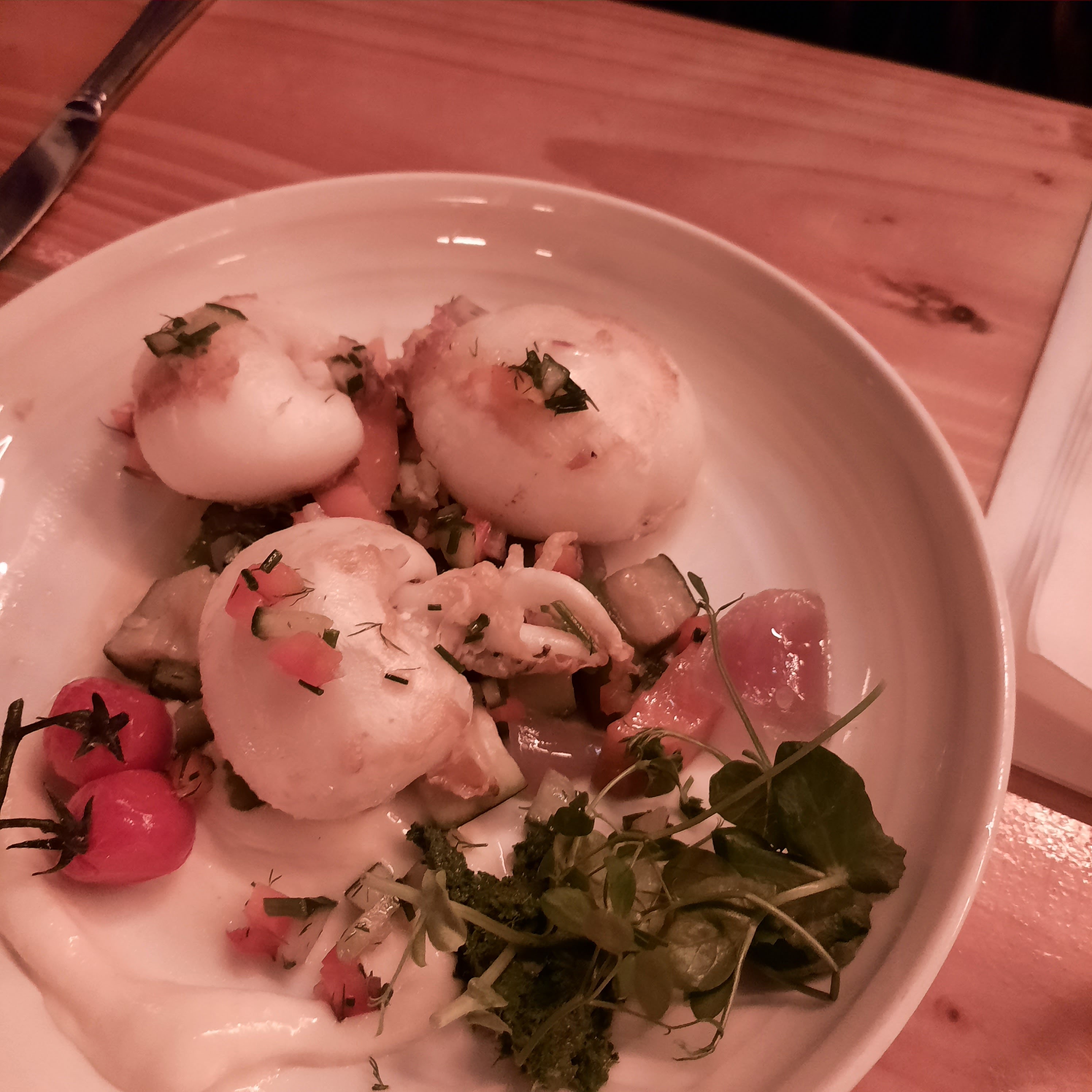 Seiches à la plancha délicieuses, juste cuite au TOP, espadon à la mangue, un régal Seul bémol, des olives sans noyaux à l’apéritif, qui ne représentent pas ce super restaurant…