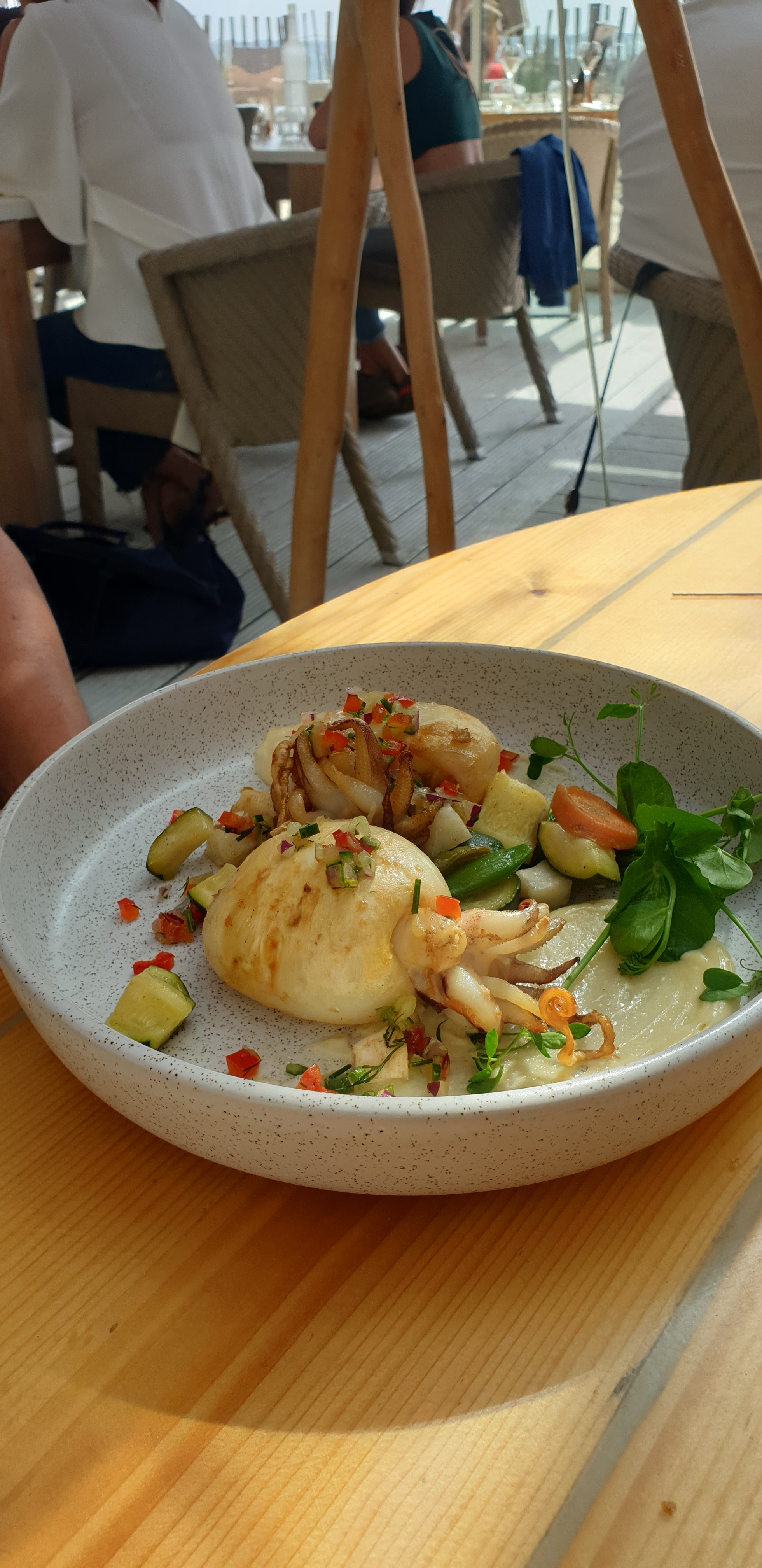On a réservé tard donc on est malheureusement à l intérieur mais très joli restaurant bord de mer avec une déco plage/zen/chic. Les plats sont très bons, bien présentés et pas trop copieux ce qui est bien pour éviter les lourdeurs de l estomac qu on éprouve parfois après un resto . Les serveurs sont réactifs et les plats s enchaînent sans attendre mais sans trop de hâte non plus. Un peu bruyant à l intérieur qd même.. Mais un très bon moment ! A découvrir !