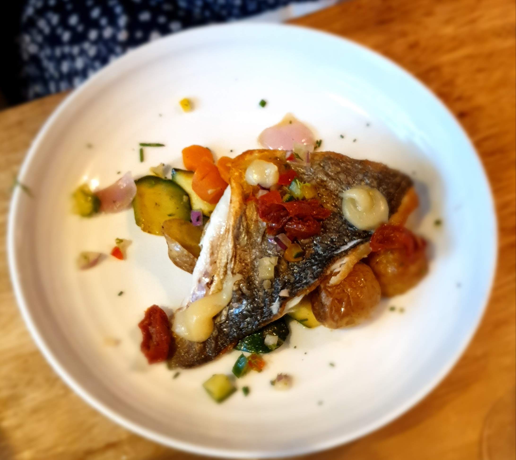 Cuisine plutôt fade , thon avec un trait d'aioli. Thon mi-cuit, cuisson très bien, avec un peu de poivrons en dés sur le dessus mais aucun goût, fade ,tout comme l'aïoli. Légumes sautés....... presque cru, Même garniture que pour la sèche. Au moins ça va plus vite . Salle bruyante. Dommage Si les gens aiment....