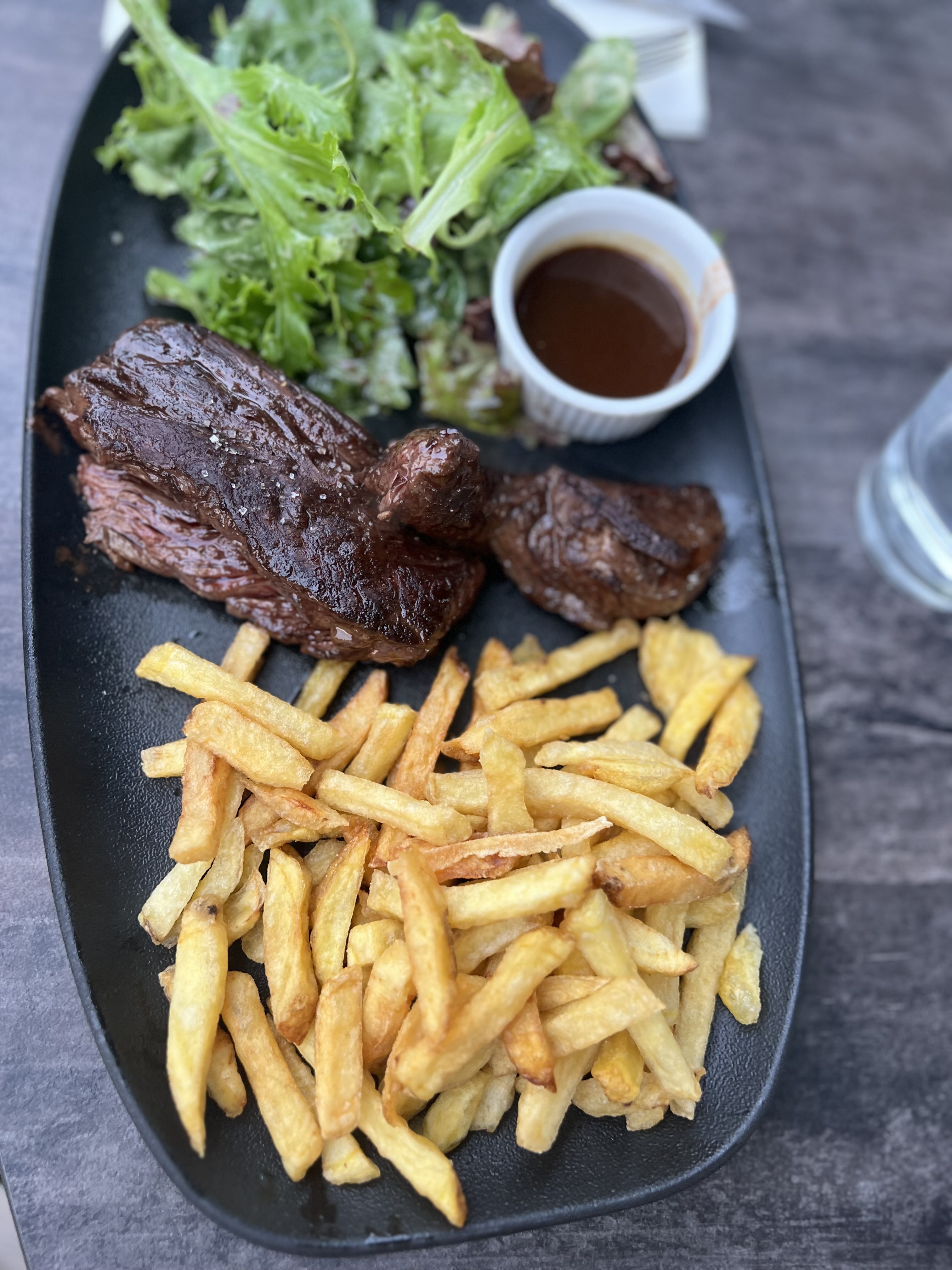 Nous avons dîner un soir de semaine mi Avril. Si vous ne voulez/mangez pas de viande, le choix devient drastiquement restreint. Thon ou poulpe pour les plats, et c'est tout. En entrée, uniquement le saumon. La viande est de qualité, cuite à la cheminée dans la salle, ce qui fait son effet. Large choix de vins. Les prix sont assez élevés. Le cadre est très agréable hiver comme été. Grande terrasse extérieure, le restaurant est idéalement placé sur la piste cyclable. Service très bon.