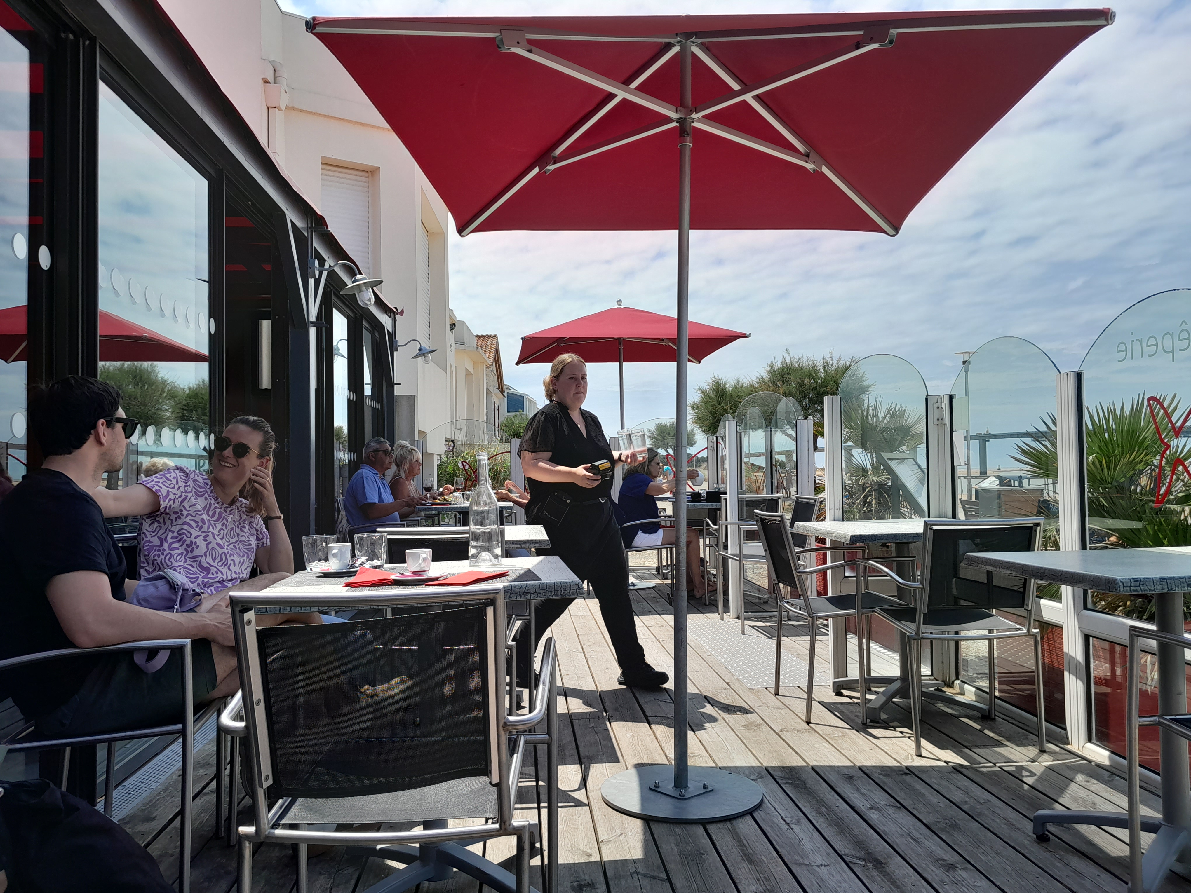 Serveuses serveurs top Apéritif face à la mer sous un petit crachin Nous avons bien fait d’attendre repas sous un petit soleil à l’abri en terrasse