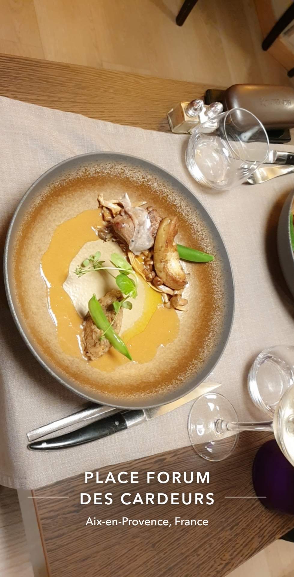 Gastronomie à Aix-en-Provence. J'ai eu le menu dégustation et la confection était impeccable. Tout était absolument délicieux. Le restaurant est un peu cher, le menu dégustation coûte 48 € (août 2016) hors boissons. La plupart des séances se déroulent à l'extérieur. Le service était excellent, les serveuses très mignonnes parlent un anglais parfait et se feront un plaisir de vous expliquer tous les cours.