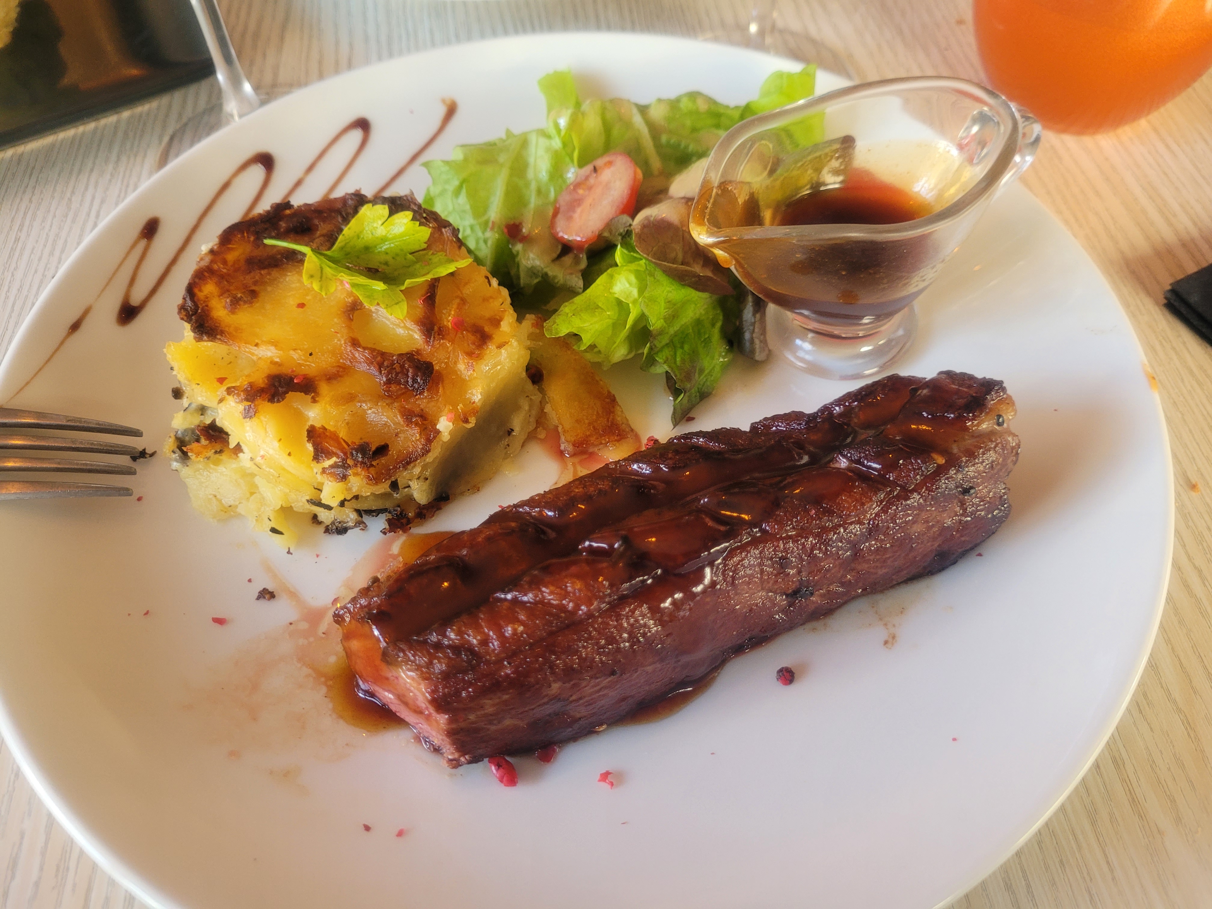 En entrée nous avons pris quatre tranches de carpaccio, bien assaisonnées, mais pour 14€, la quantité était insuffisante. Mijoté de bœuf très moyen, viande assez grasse et peu de goût… Pareil pour les frites. Le magret de canard était quant à lui plutôt bon, la pièce était tendre. Bilan : nous avons terminé notre déjeuner assez déçus