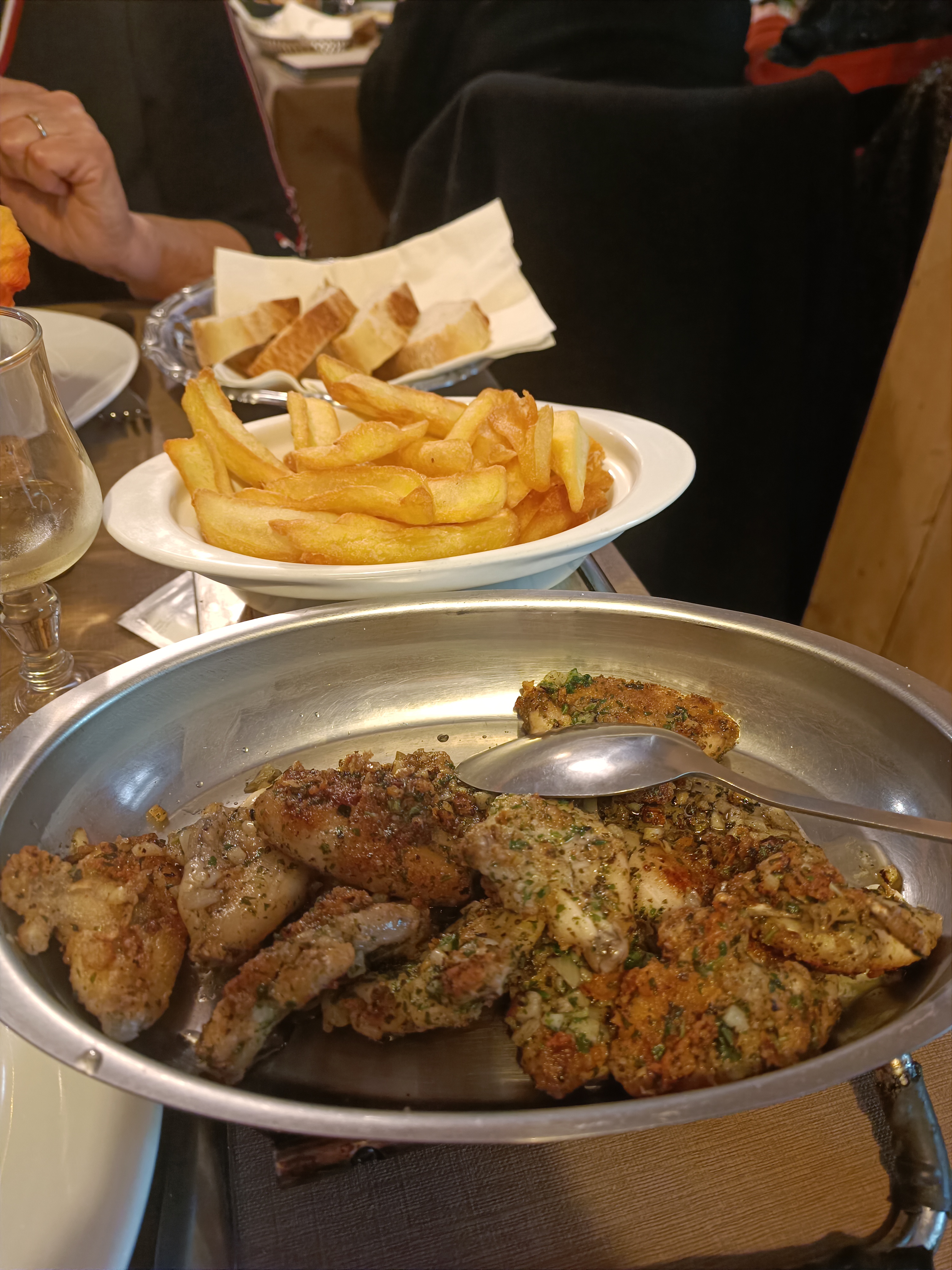 Très bien déjeuner les cuisses de grenouilles 🐸 très bonnes ainsi que les frites et le petit vin Rully blanc qui va bien