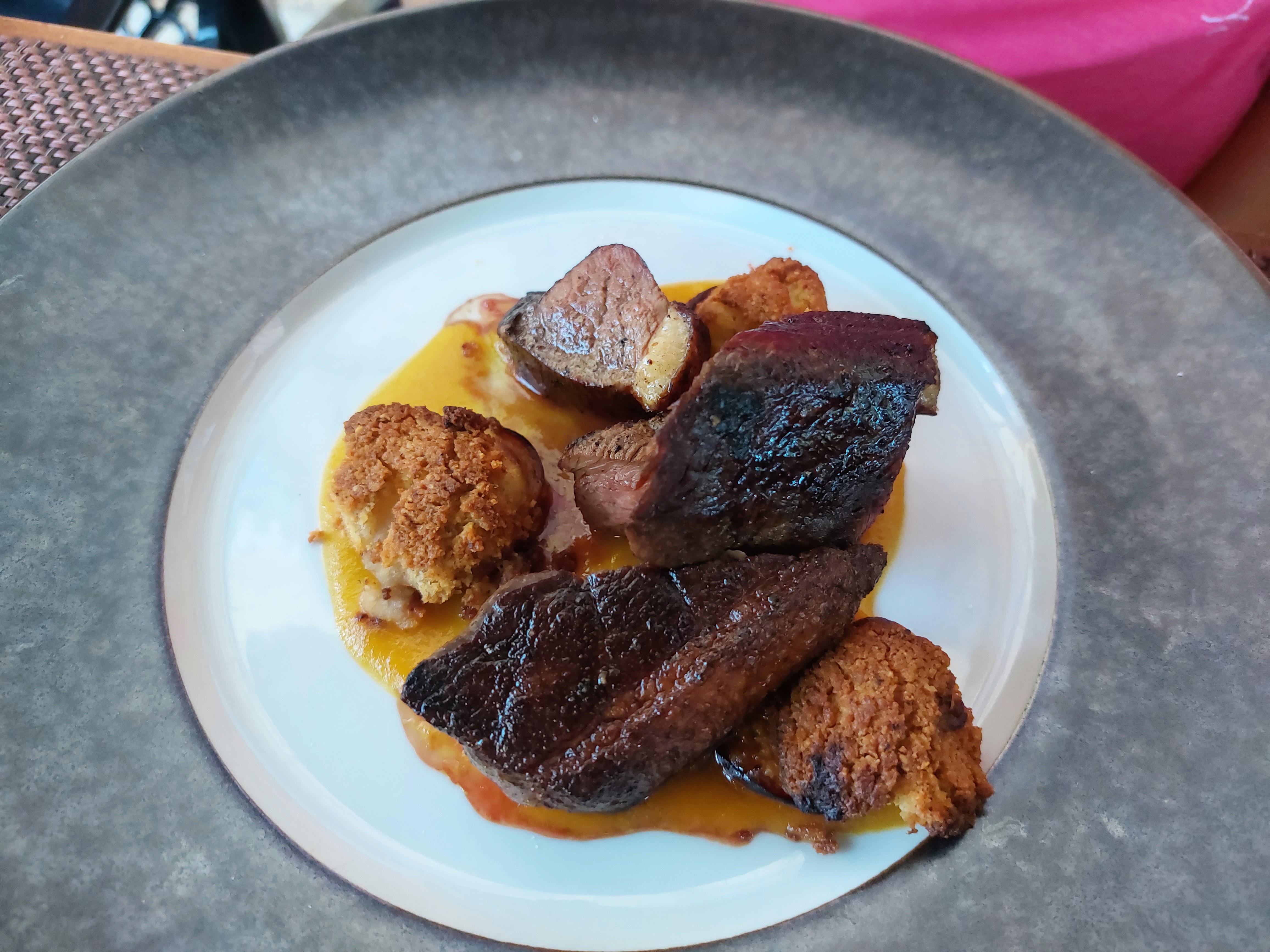 Entrée excellente mais assiette peu garnie. Très peu d'accompagnements (pommes de terres) avec l'entrecôte et courgettes beaucoup trop salées avec un magret légèrement trop cuit (demandé rosé). Je m'attendais à mieux considérant notamment les prix affichés à la carte. La cadre est très sympas voire romantique mais ne suffirait pas à ce que je conseille ce restaurant.