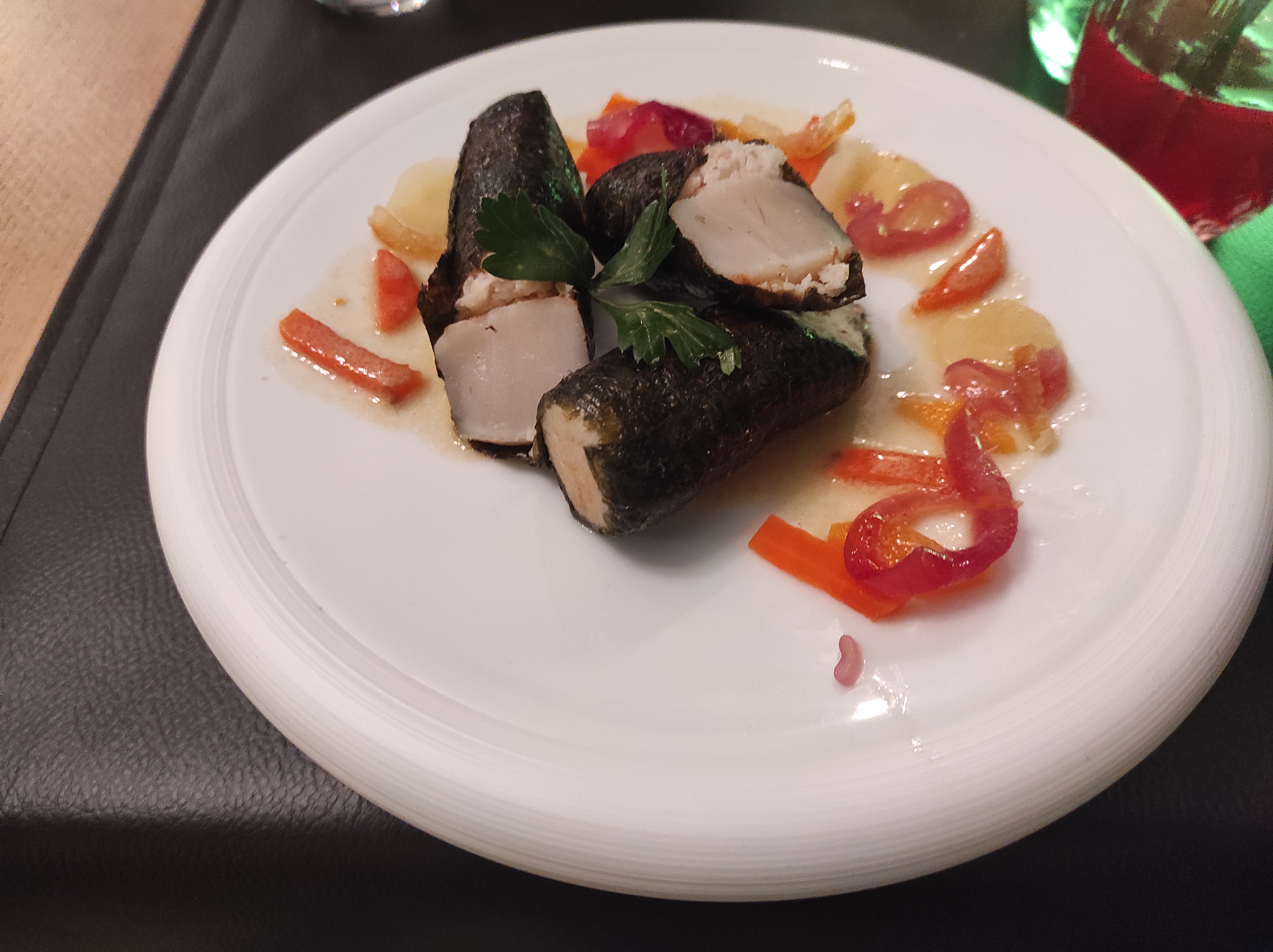 Après un accueil pétillant de sourire et de sympathie, l’on vous installe dans une jolie salle décorée avec beaucoup de goût. Quelques notes de piano aident à installer un sentiment de détente et de plaisir. Après lecture de cette carte époustouflante de créativité et de goût, et quelques minutes de patience, vous est présentée une assiette aux couleurs chatoyantes, pleine d’élégance de raffinements et encore une fois de créativité. Fermez les yeux et mettez en bouche et laissez tourbillonner les saveurs caresser vos papilles. Un endroit très agréable une équipe agréable et attentionnée, cet établissement est a conseiller et tester à tous les amateurs de cuisine fine à prix très compétitifs. Ce fût vous l’aurez aisément comprit un moment empli de bonheur.