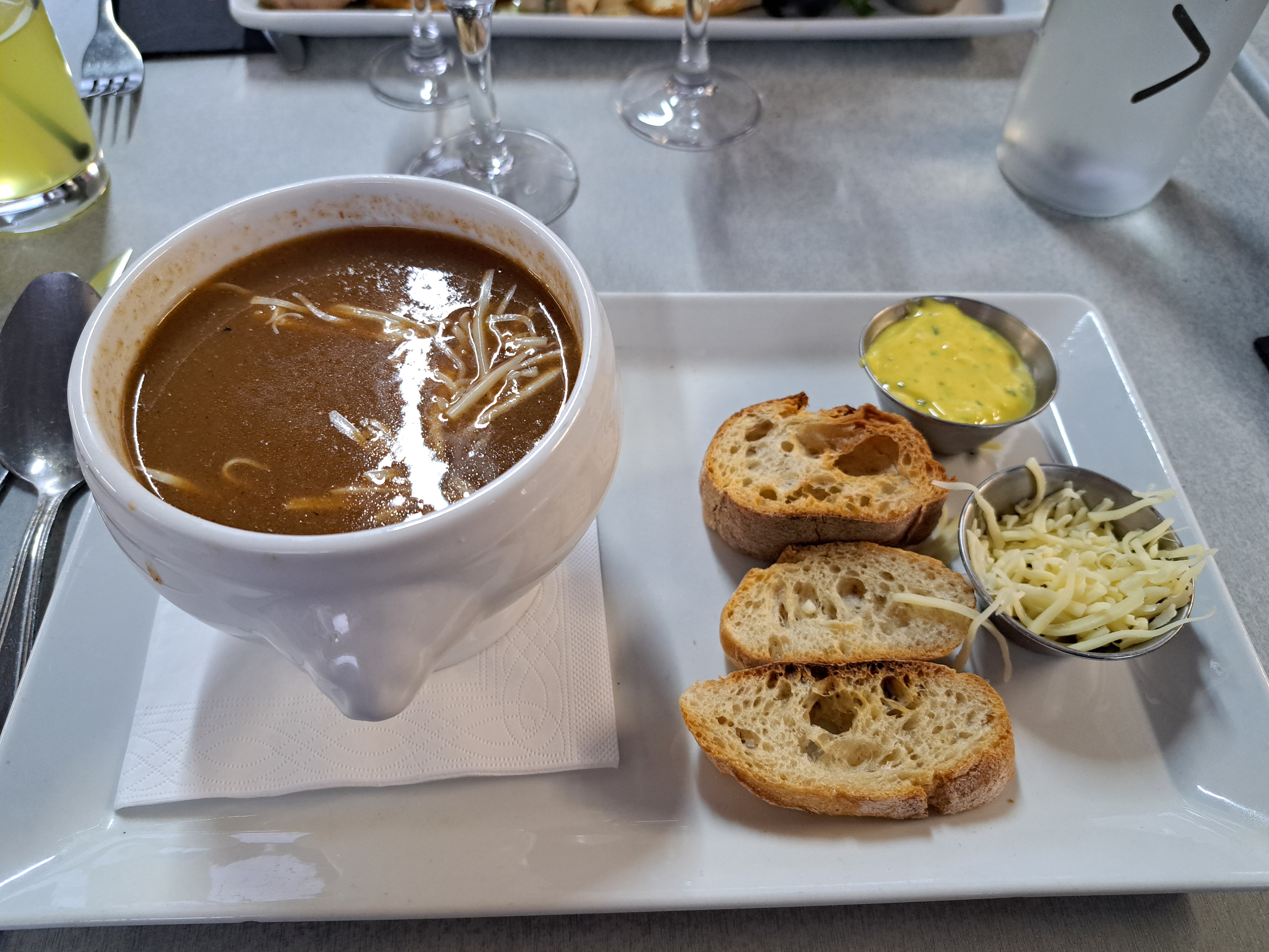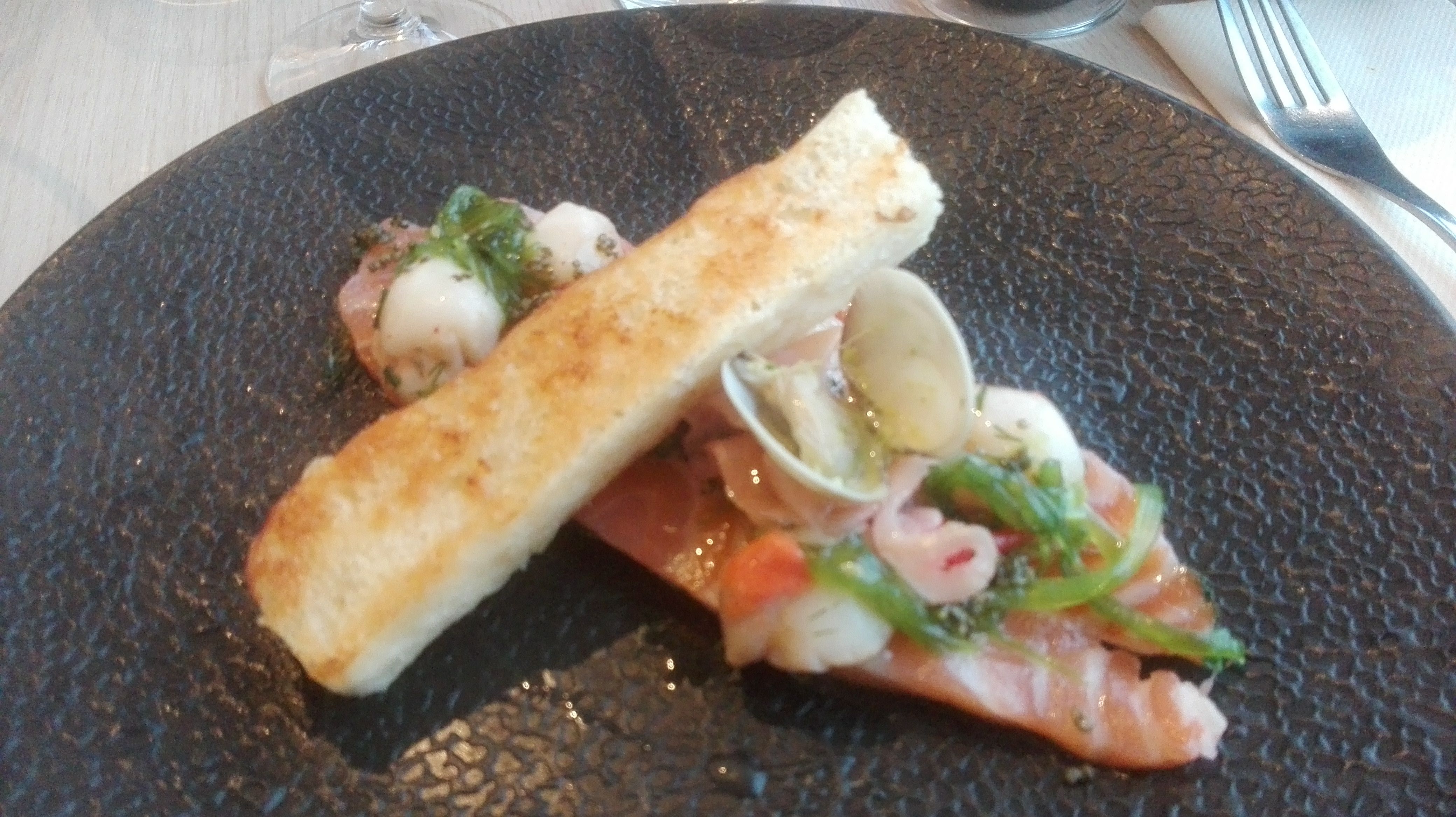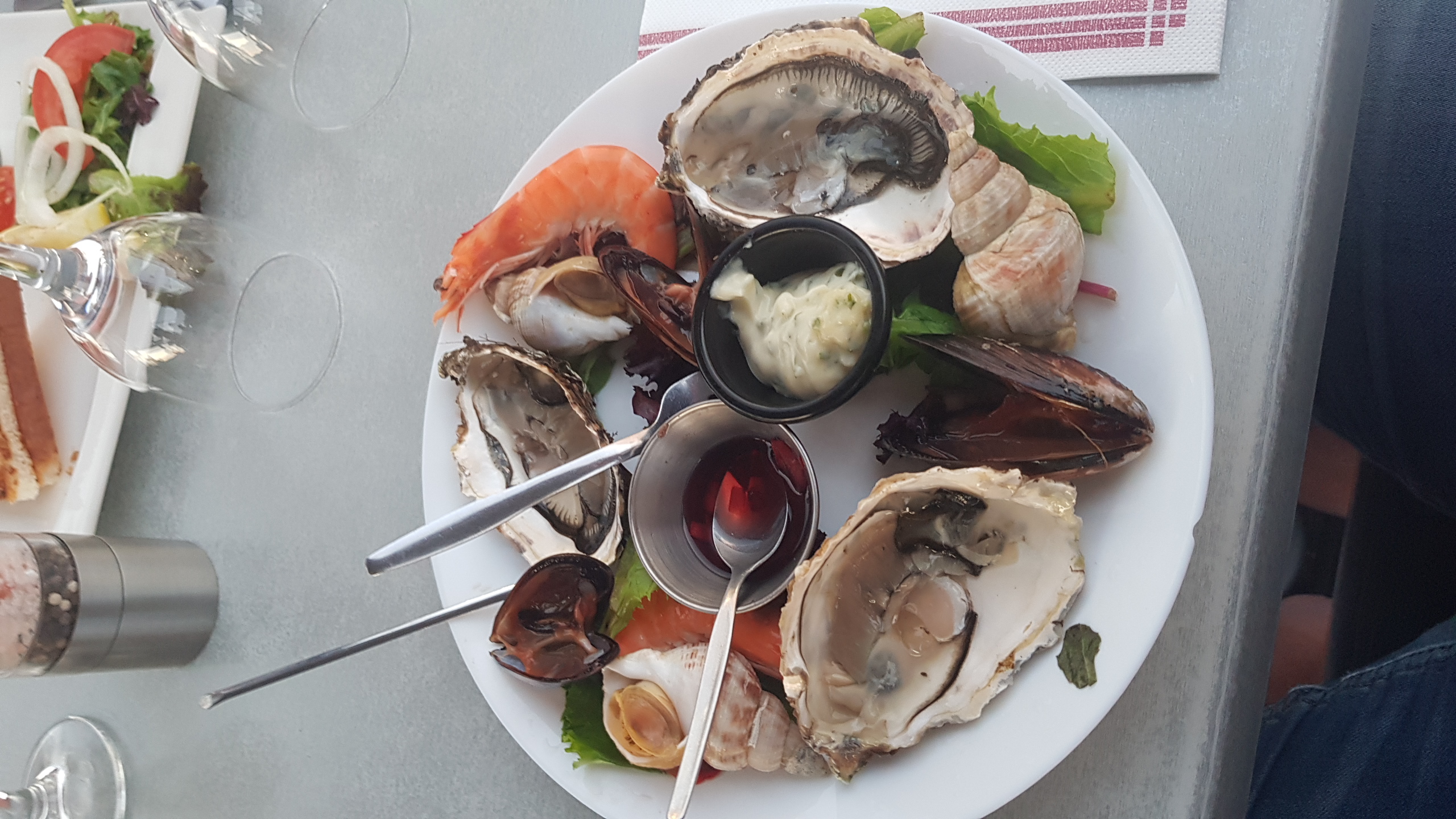 Super terrasse, assietes copieuse Manque certains détails au service : lave main avec les huîtres, plat poubelle pour les assiettes de poisson, couteaux pas adaptés (pour coupé une sèche, pas facile avec un couteau classique)