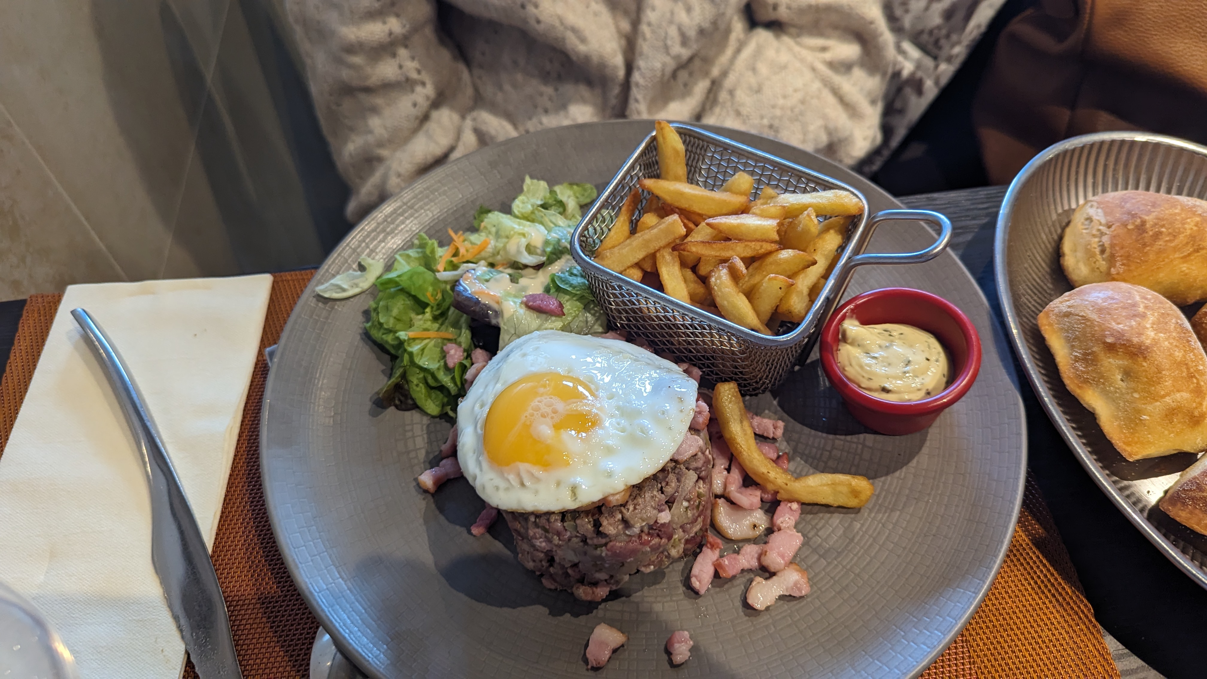 Plutôt décevant... Nous sommes arrivés vers 13h30 L'accueil était plutôt agréable, la personne que je suppose être le gérant à été très gentil et ouvert avec nous. Cependant, la suite du repas n'étais pas très agréable : Le premier serveur que nous avons vu était étourdis et est revenu au bout de 5min pour nos poser des questions sur nos plats (quelle sauce nous voulions, quel poids pour le tartare... Etc). Ensuite, la deuxième serveuse que nous avons eu à été plutôt désagréable : pas de sourire, peu de formule de politesse, et elle nous lançais des regards plutôt désagréable en raison du fait que nous étions les derniers clients du service. A la fin de notre plat, il y avait déjà le passage de l'aspirateur autour de nous, et le service c'était transformé en marathon, visiblement pressé de terminer (ce que je comprends, mais ce n'étais pas très agréable) mais alors dans ce cas, si nous dérangeons, pourquoi nous avoir accepté à cette heure ci ? S'ajoute à cela le service très long par rapport au nombre de clients restants. Concernant le plat, malgré les prix plutôt cher, c'était vraiment très bon. En revanche, l'oubli d'accompagnement et de sauce dans le plat était décevant. J'ajoute aussi que les quantités sont selon nous trop petites par rapport au prix. Bref nous ne reviendrons pas, ma mère qui était déjà venue il y a quelques années à été hyper déçue car elle en avait un très bon souvenir. Pour ma part, je ne reviendrais pas.