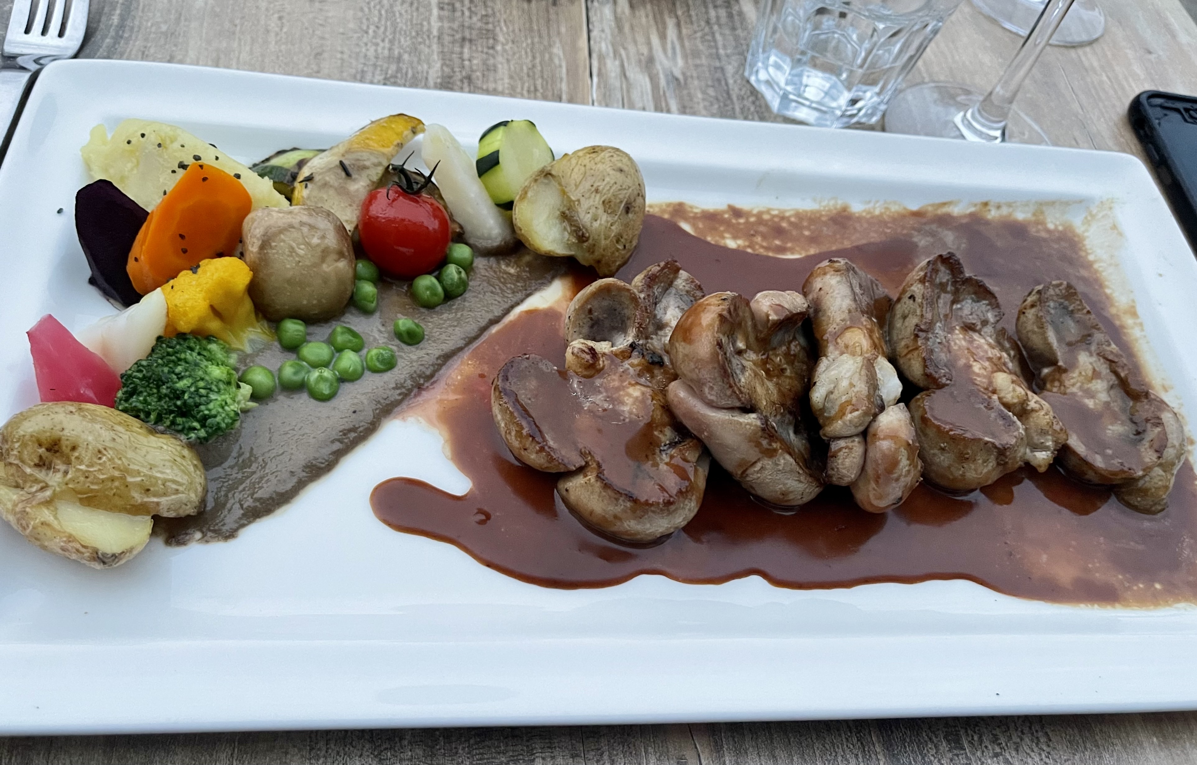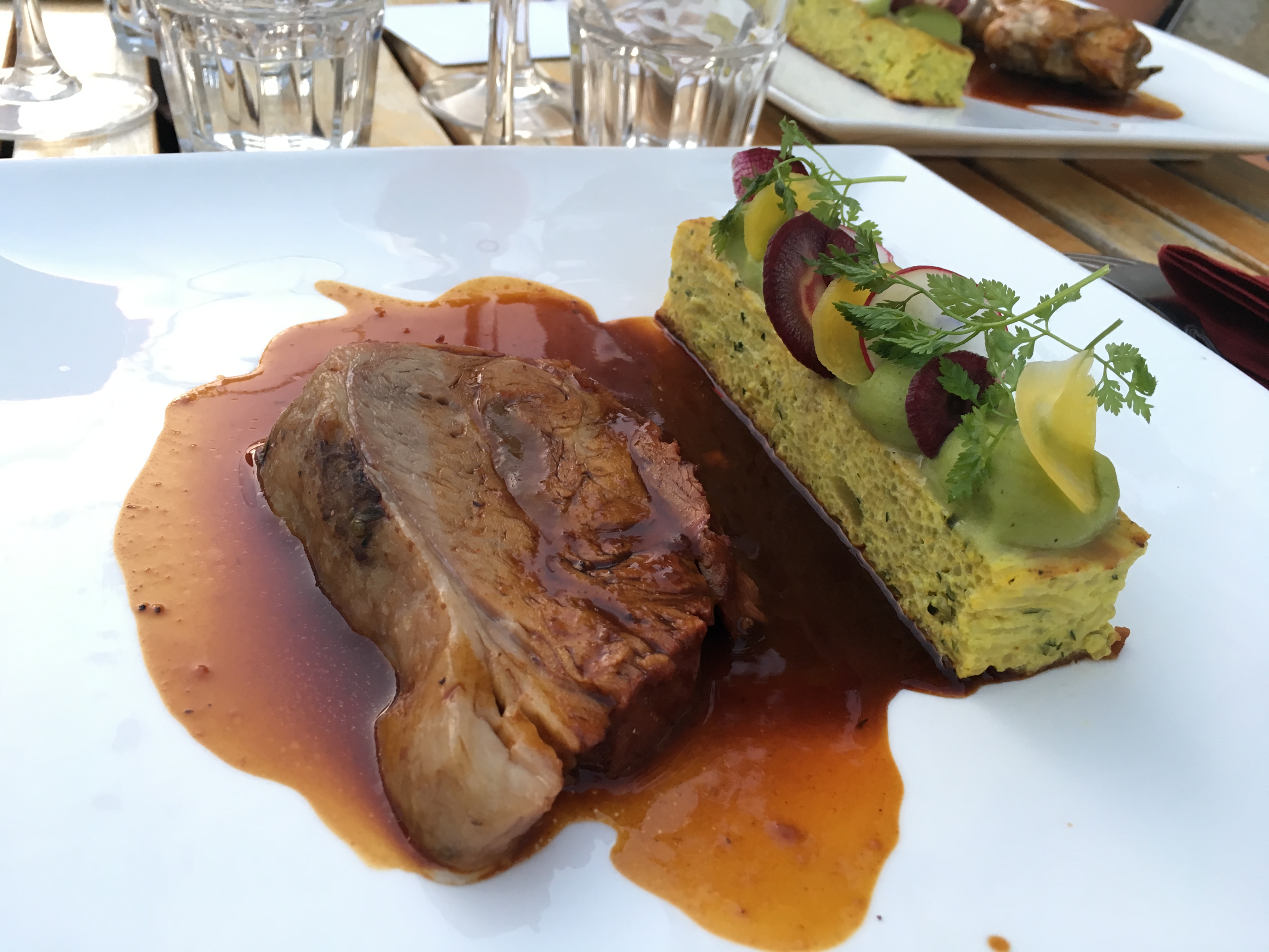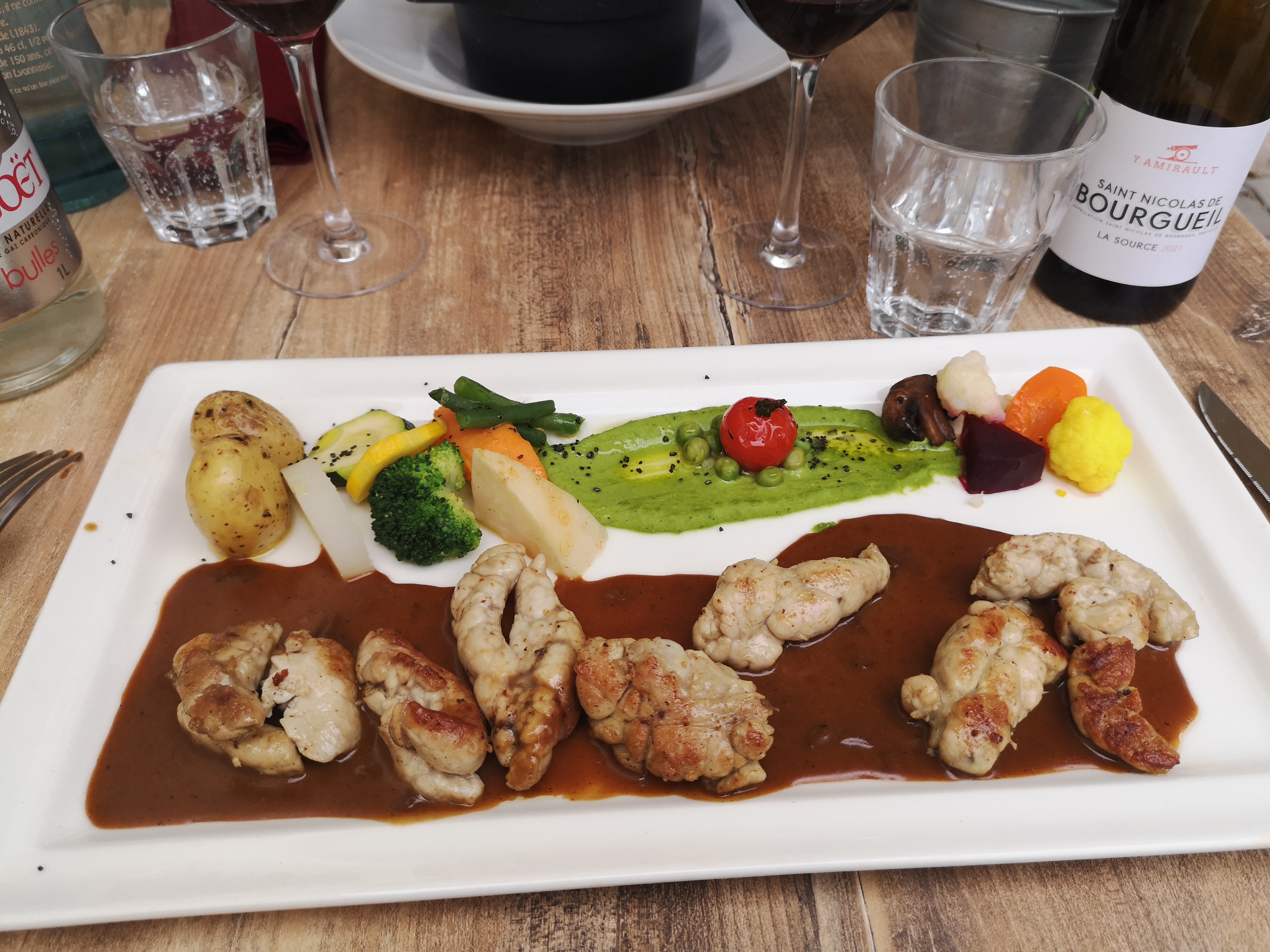 Un régal de l'entrée au dessert. Entrée avec un croustillant d'andouillette sauce moutarde, suivi d'un ris d'agneau et sa garniture (au moins 7 légumes differents) le tout très bien présenté, goûteux et très copieux (je dirais presque trop, mais j'ai tout mangé quand même) Déjeuner en terrasse en bordure d'une rue sans passage. Ça vaut vraiment la peine de s'éloigner du centre ville. Le seul (petit) reproche: c'est un peu long.