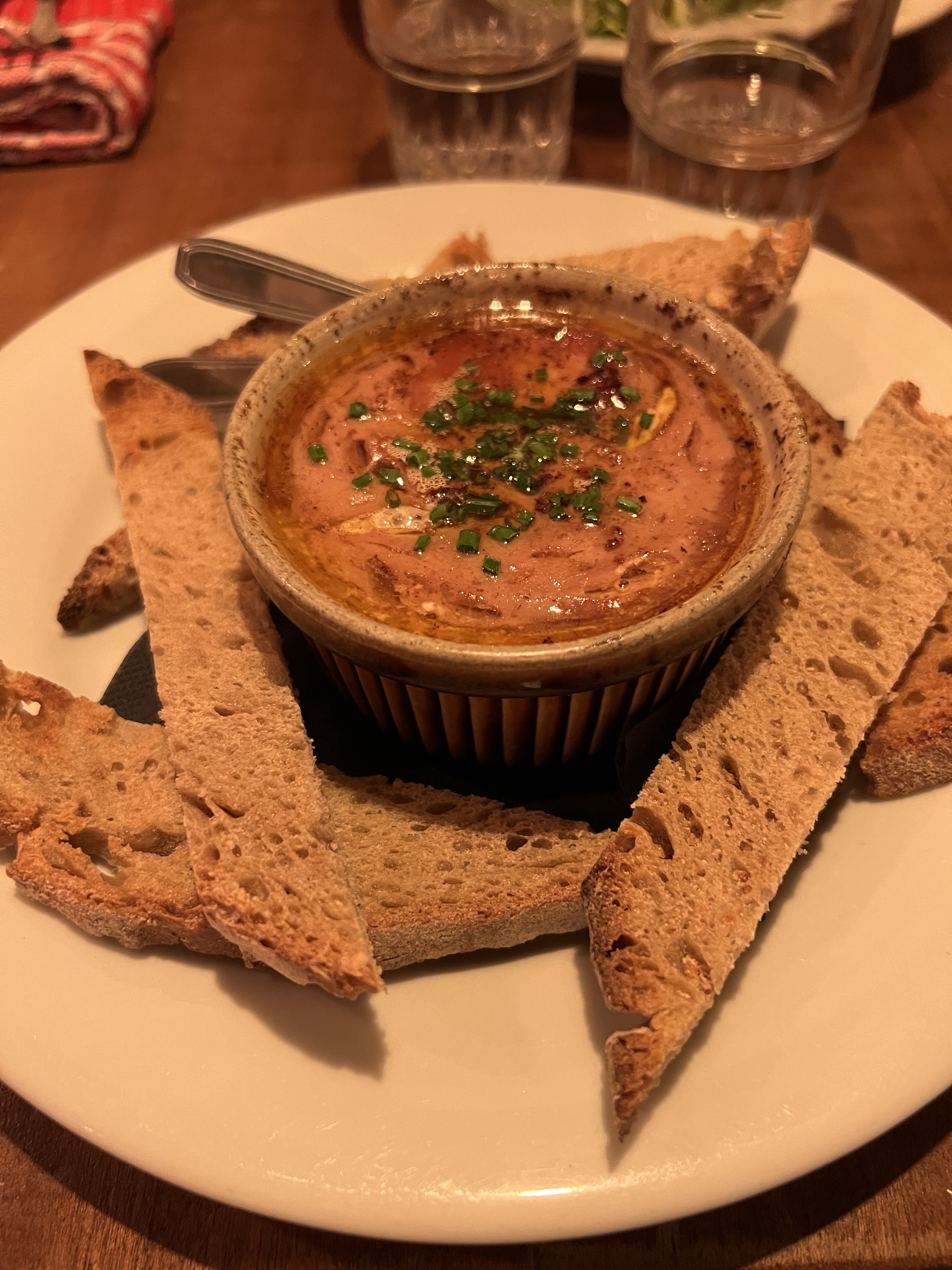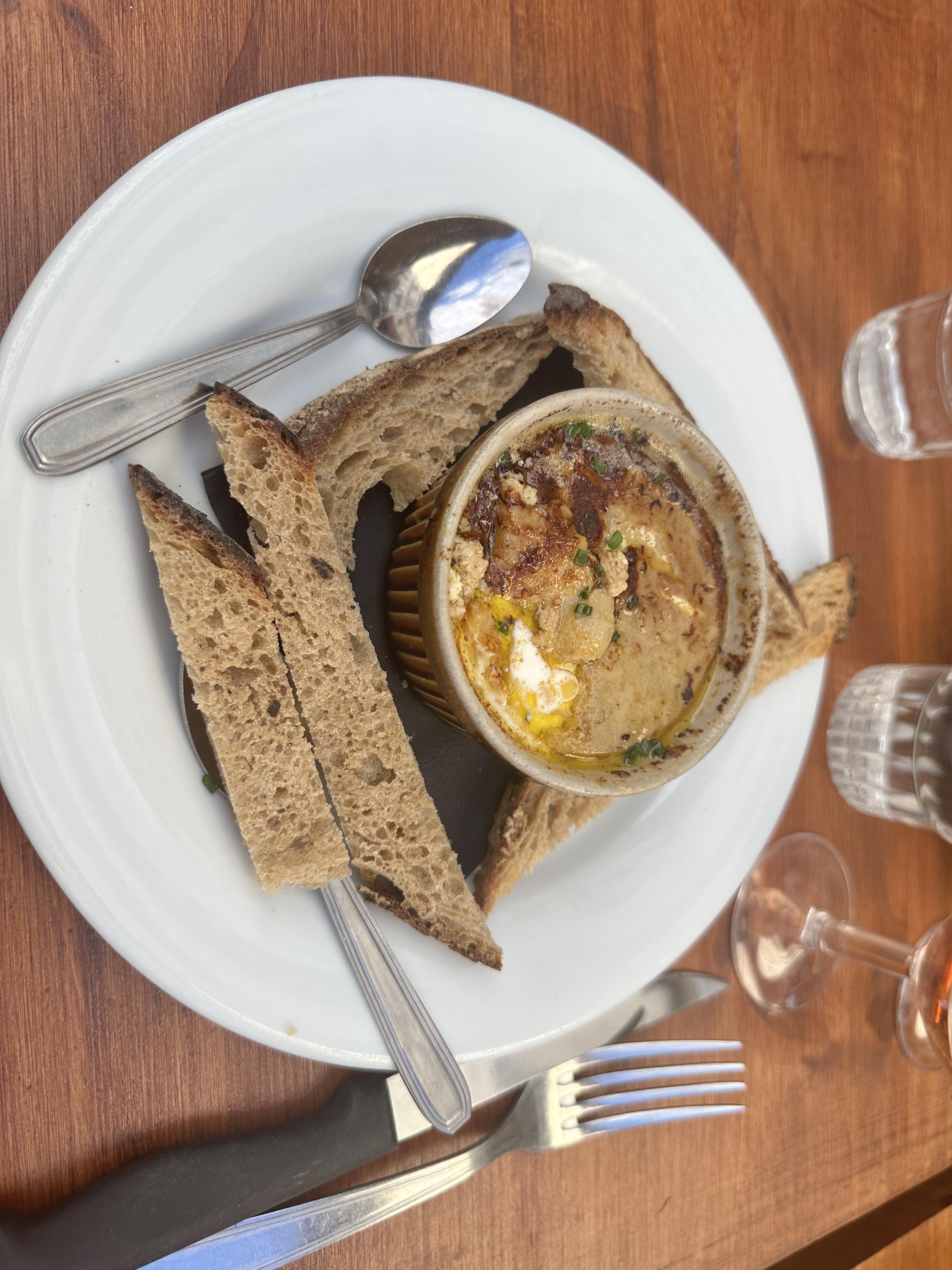 We shared the Oeuf cocotte au foie gras, a veal plate, a duck plate and creme brûlée.