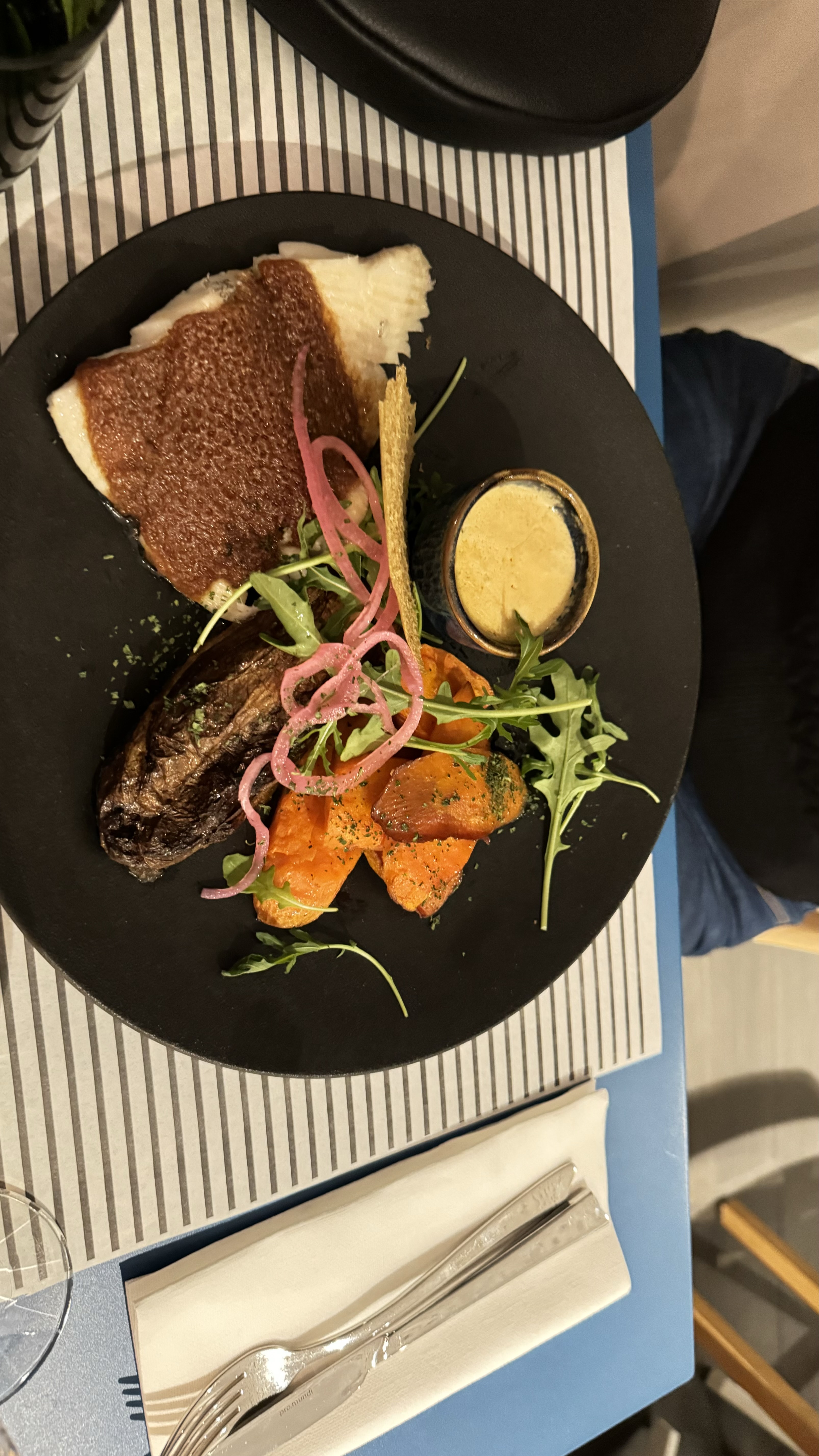 Excellent dos de cabillaud.. Personnel disponible et à l écoute du client.. Malgré la chaleur caniculaire ..le tout face à une superbe vue je recommande.. Bon rapport qualité prix