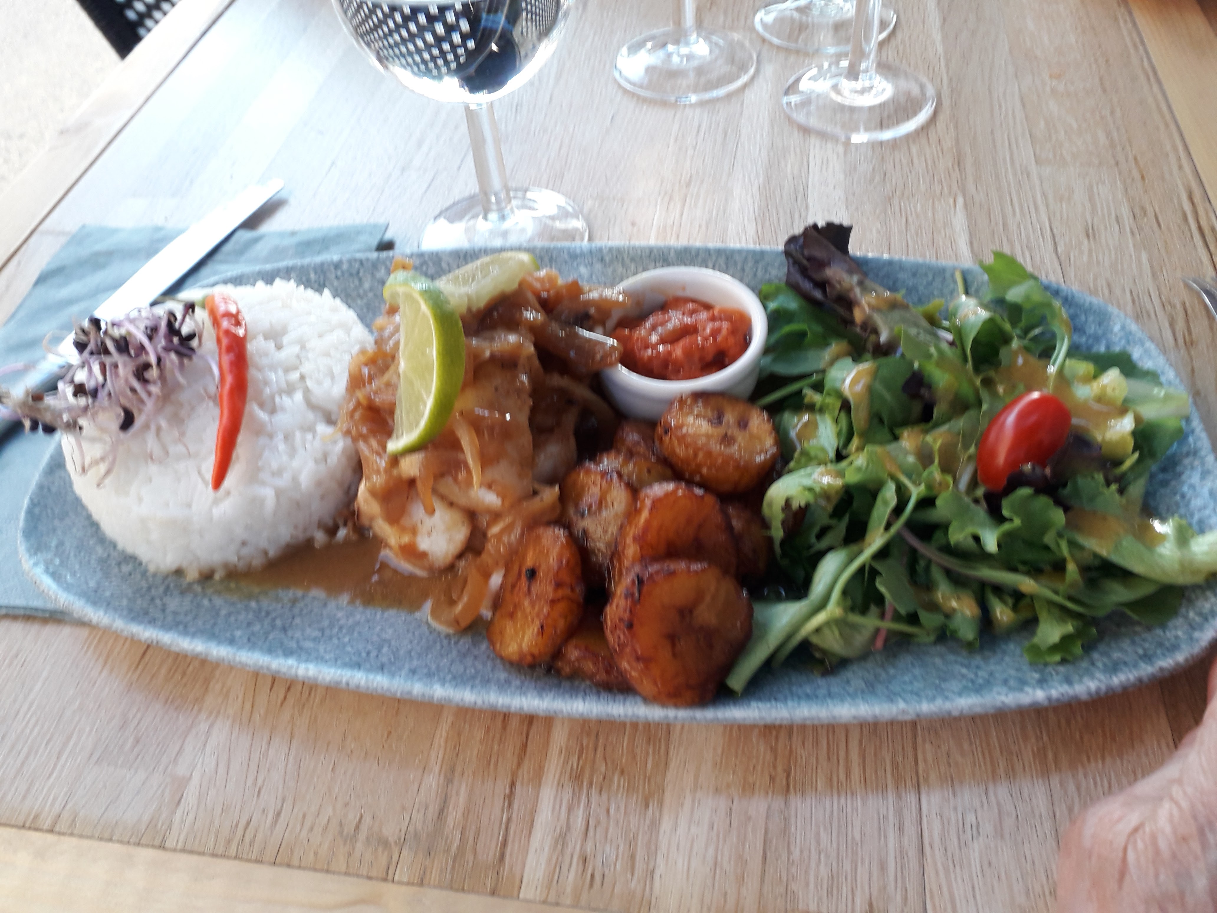 Excellent, j'ai pris la spécialité du poulet bicyclette et je n'ai pas été déçu. Très généreux en quantité même trop ! Et les accompagnements (sauce, épices, salades,...) génialissime ! Prix tout à fait correct. Des apéritifs maison (à base de rhum) très variés et typique locale. J'adore. Une adresse que je retiendrais pour mes prochaines virées.