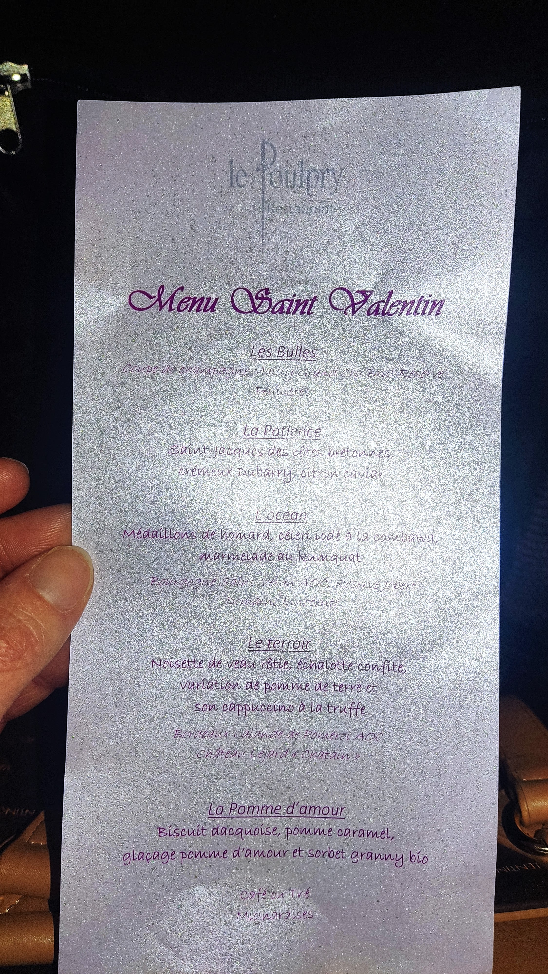 Une très belle soirée de la Saint Valentin. Un cadre très sympathique charge d histoire, un menu très raffiné et un personnel de très grande qualité. Bravo à toute l équipe.