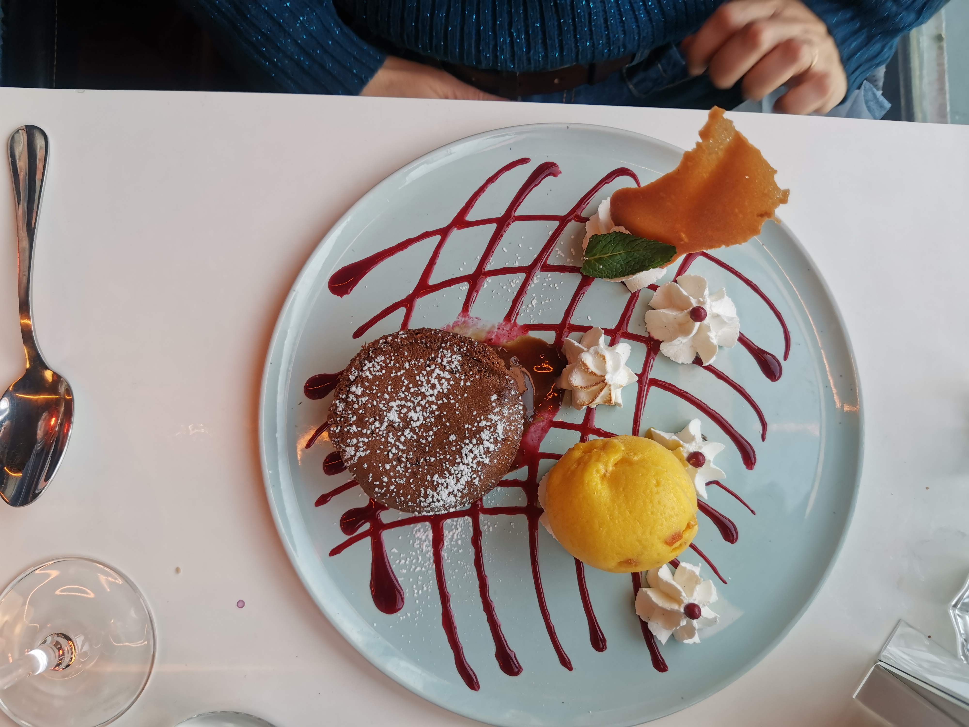 La cuisine est correct d'un point de vue qualité , le service relativement rapide par contre la terrasse est tout sauf intimiste ( moins de 30centimetres entre les tables de deux, ce qui est pratique pour participer à la conversation du couple voisin .......mais nettement moins bien pour votre propre intimité.) établissement pas commerçant du tout par ailleurs ( impossible de faire remplacer une boule de vanille par de la fraise dans un chocolat liégeois vendu plus de 7€...sous prétexte de surcout de matière première mais sans proposition de suppléments non plus pour accéder à ma demande !!) Bref c'était ma première fois dans ce restaurant mais sera également ma dernière... la prochaine fois j'irais voir ce que propose leur concurrents direct..