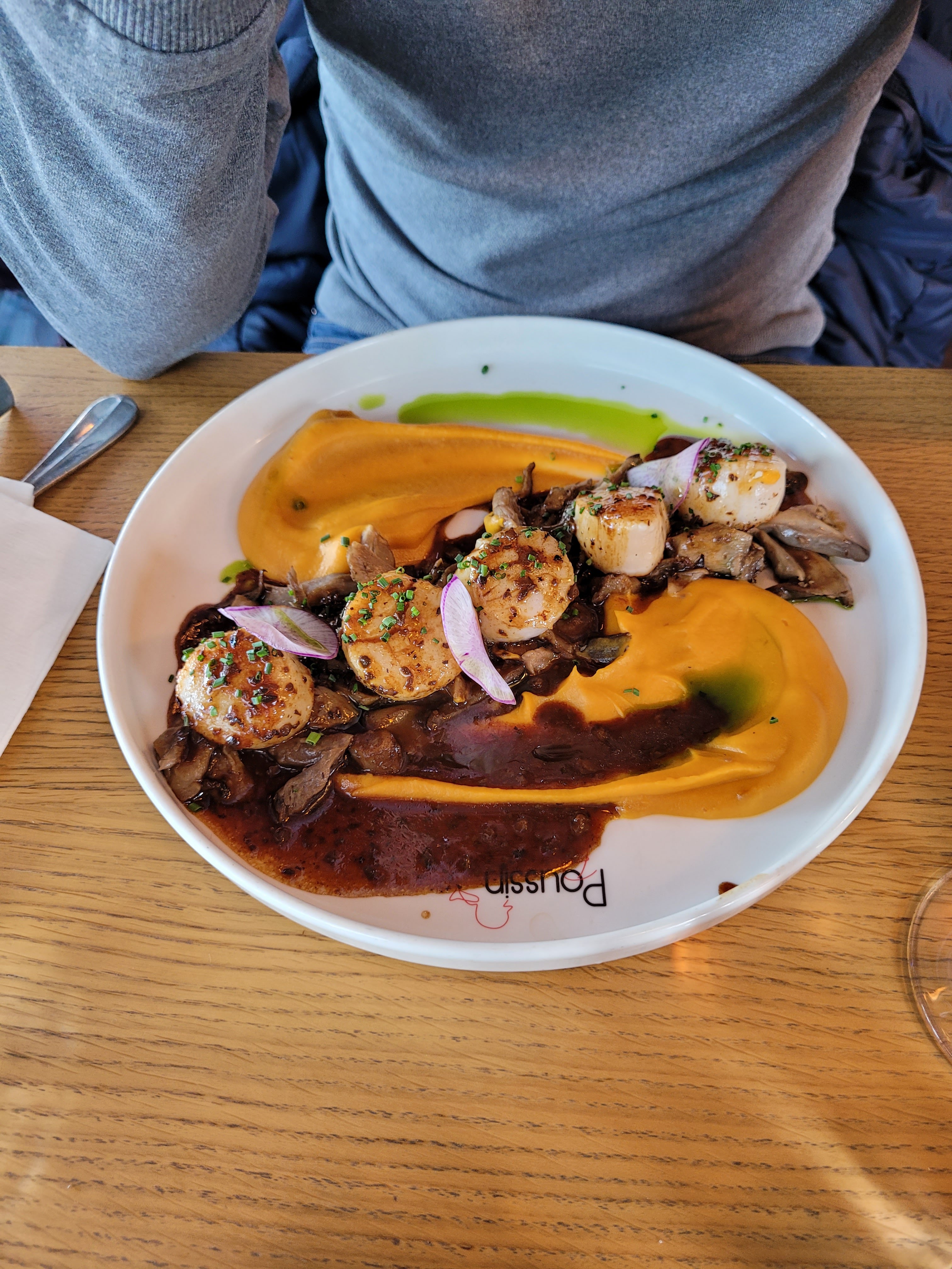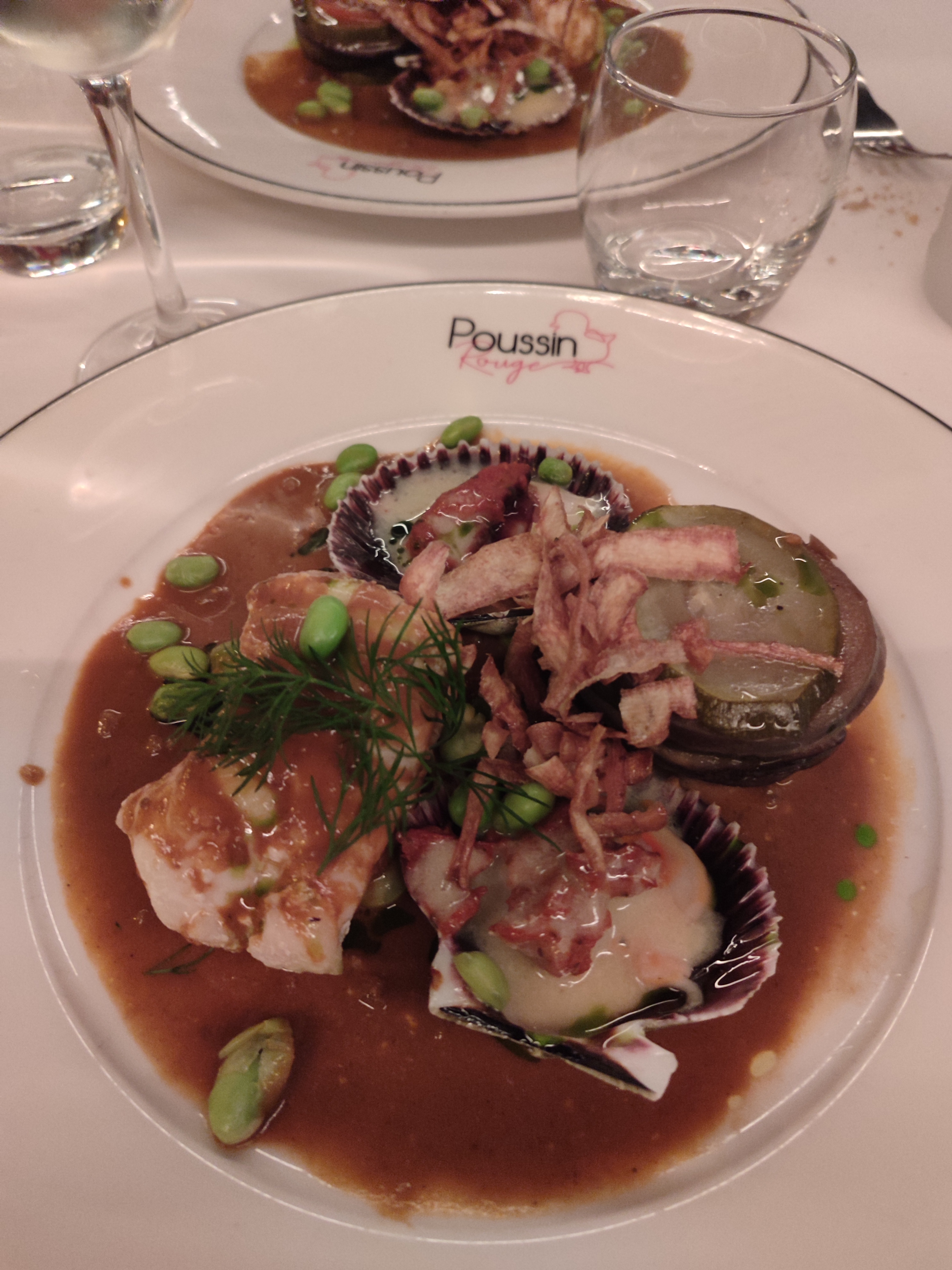 J'avais pas grand chose dans l'assiette pour le menu à 34 €. Apparemment, on n'a pas la même définition du terme poêlée. Il y avait seulement 4 petits morceaux d'anguilles pour une poêlée d'anguilles. Et pareil pour la poêlée de St Jacques ...
