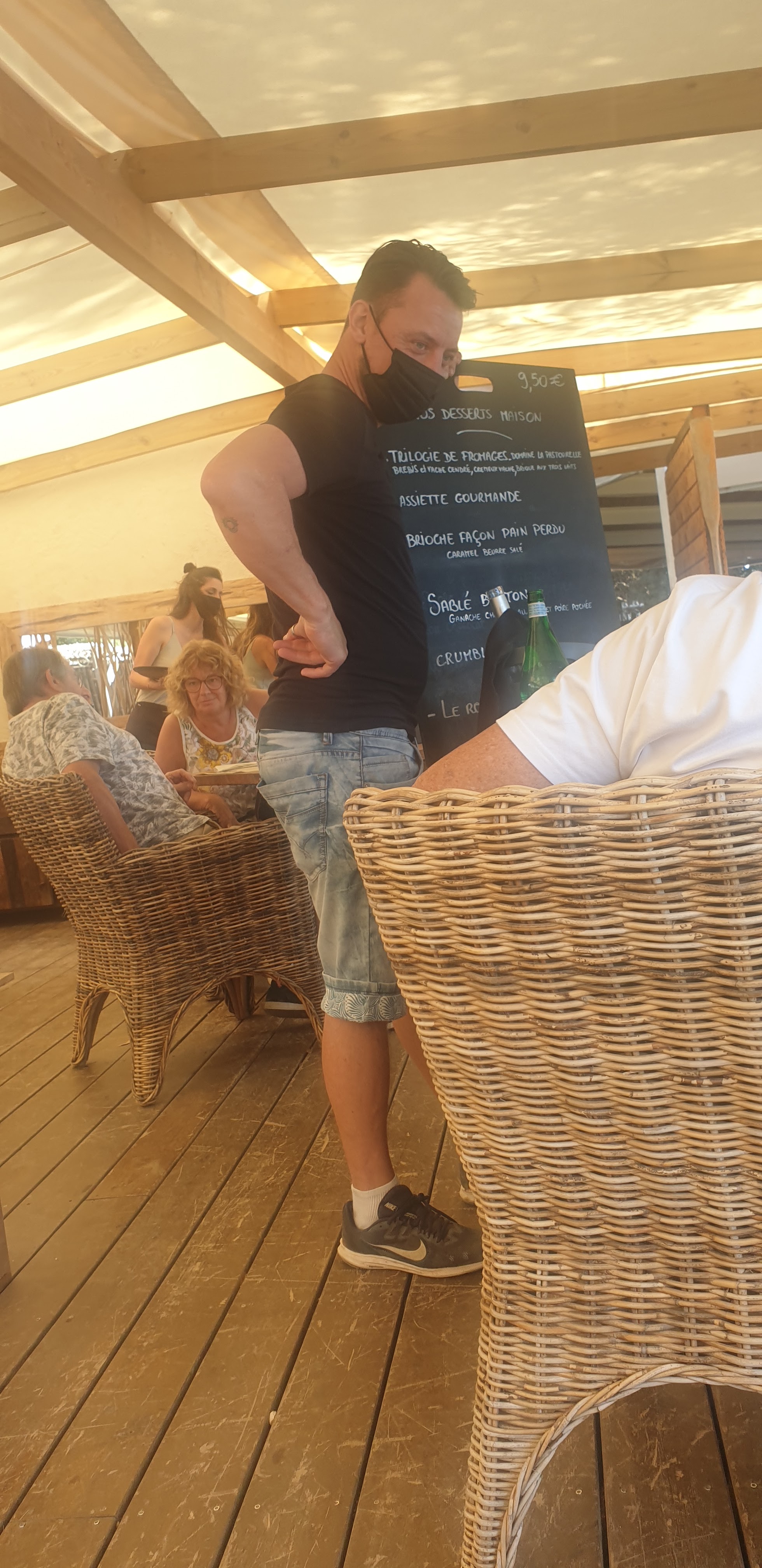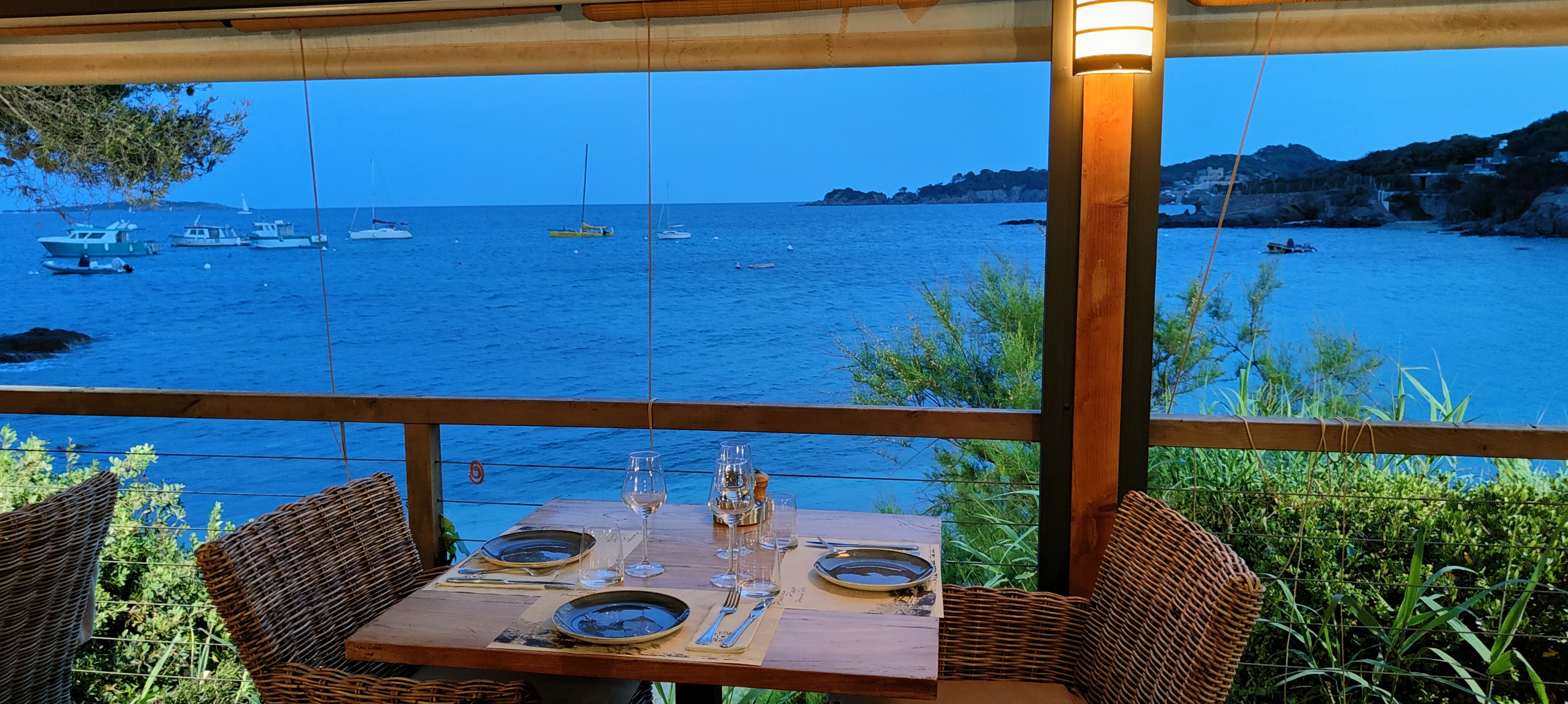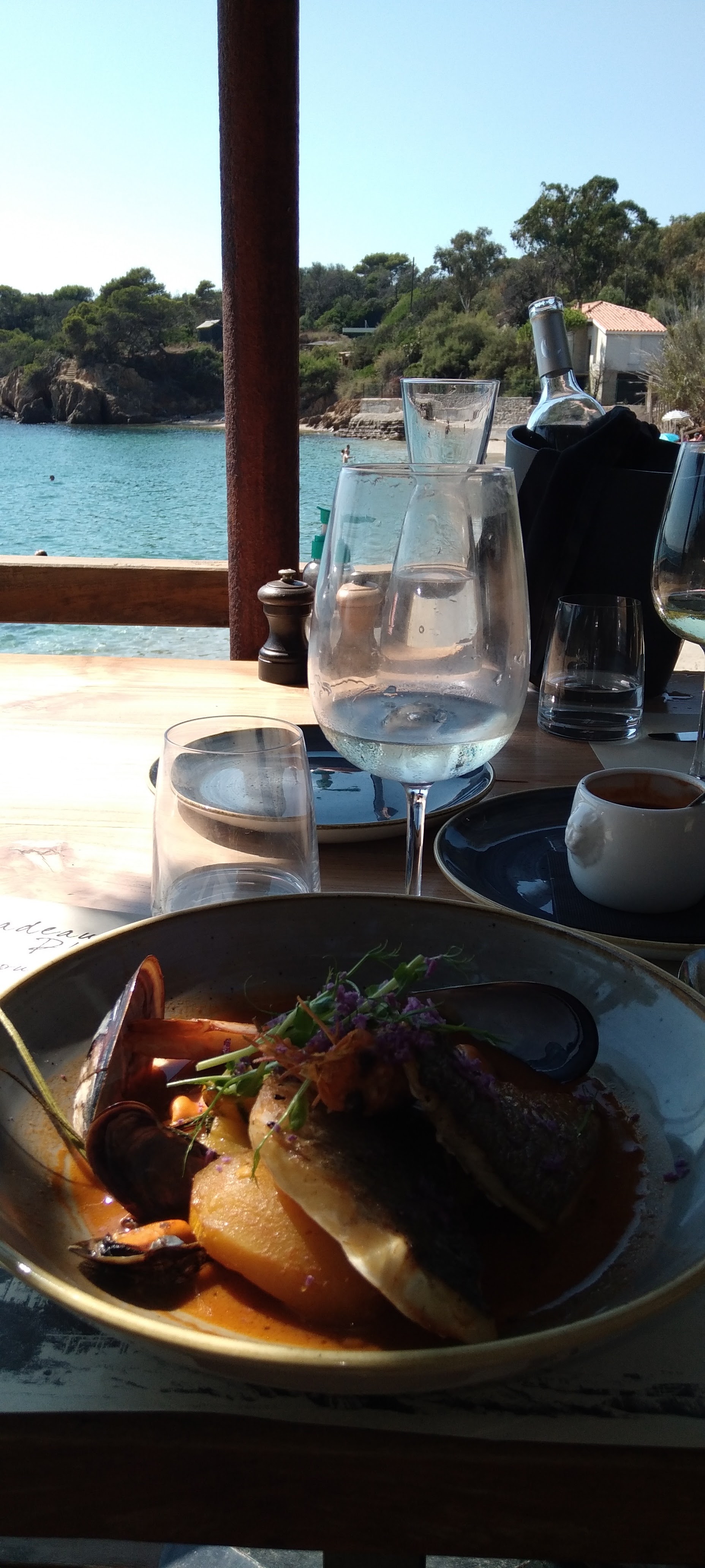 Une soirée exceptionnelle ! Tout d’abord le cadre idyllique de ce soir : une table pour 3 personnes en retrait des autres en descendant un escalier, à l’abri des conversations des autres tables et avec une vue imprenable sur la mer et l’île de Porquerolles. Un cadre certes mais aussi une cuisine exceptionnelle : du poisson ultra frais, des accompagnements et des assaisonnements accordés avec brio ! Pour ma part en entrée des saint Jacques snackées sur lit de poireaux avec un coulis de fruit de la passion, puis la pêche du jour avec un Saint Pierre de 950 grammes (pour 2) avec son écrasé de pommes de terre et son flan aux legumes une fois encore assaisonnés tous trois avec goût et simplicité. Pour finir, une assiette gourmande pleine de légèreté et de gourmandise comme son nom l’indique. Une ovation particulière au(x) chef(s) pâtissiers pour le croustillant citron : une révélation pour mes papilles ! Enfin, après le cadre et la cuisine, un personnel très aimable, souriant et très abordable pour le moindre de vos besoins. Je recommande à 1000% et reviendrai avec plaisir déguster les merveilles que les chefs nous ont proposées ce soir ! Un grand merci !