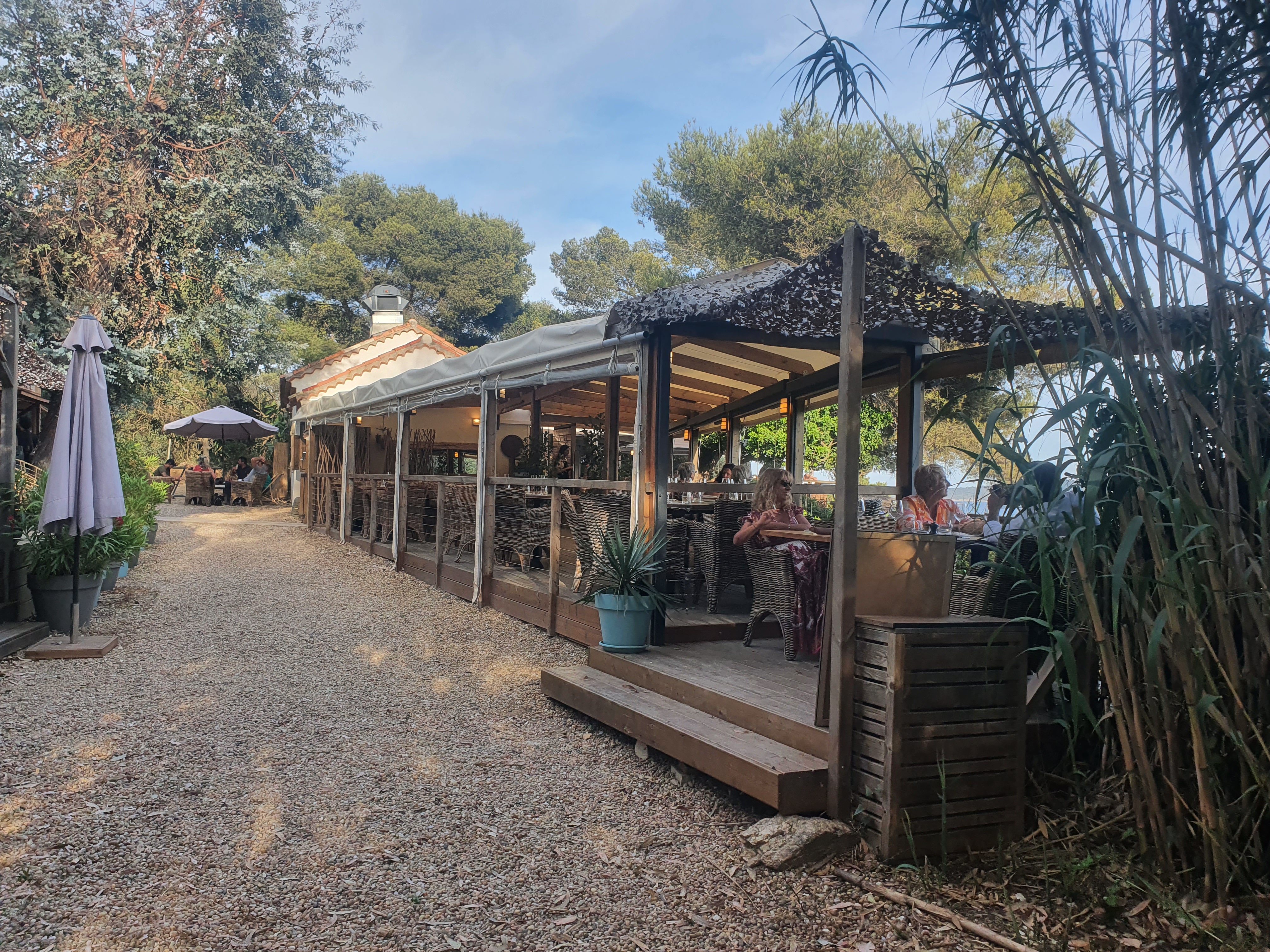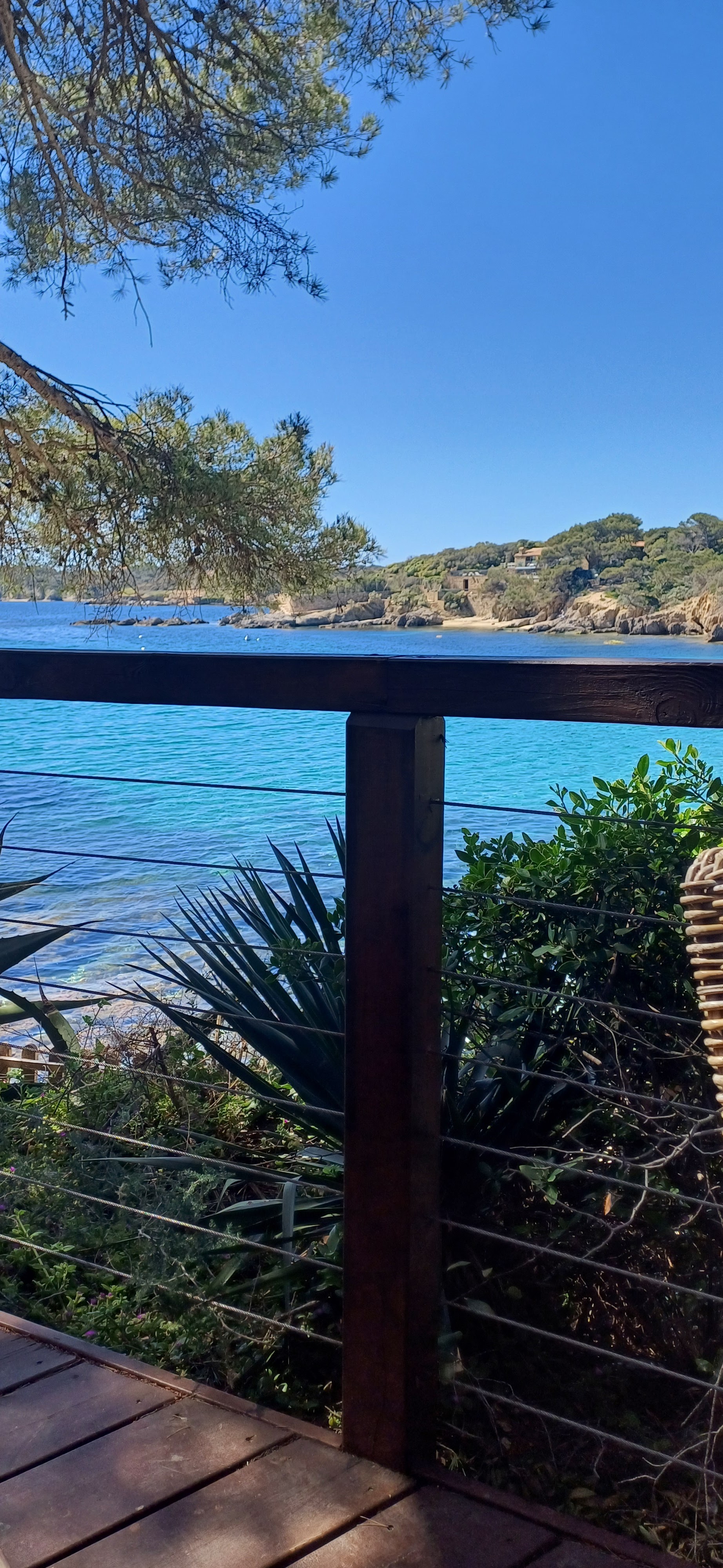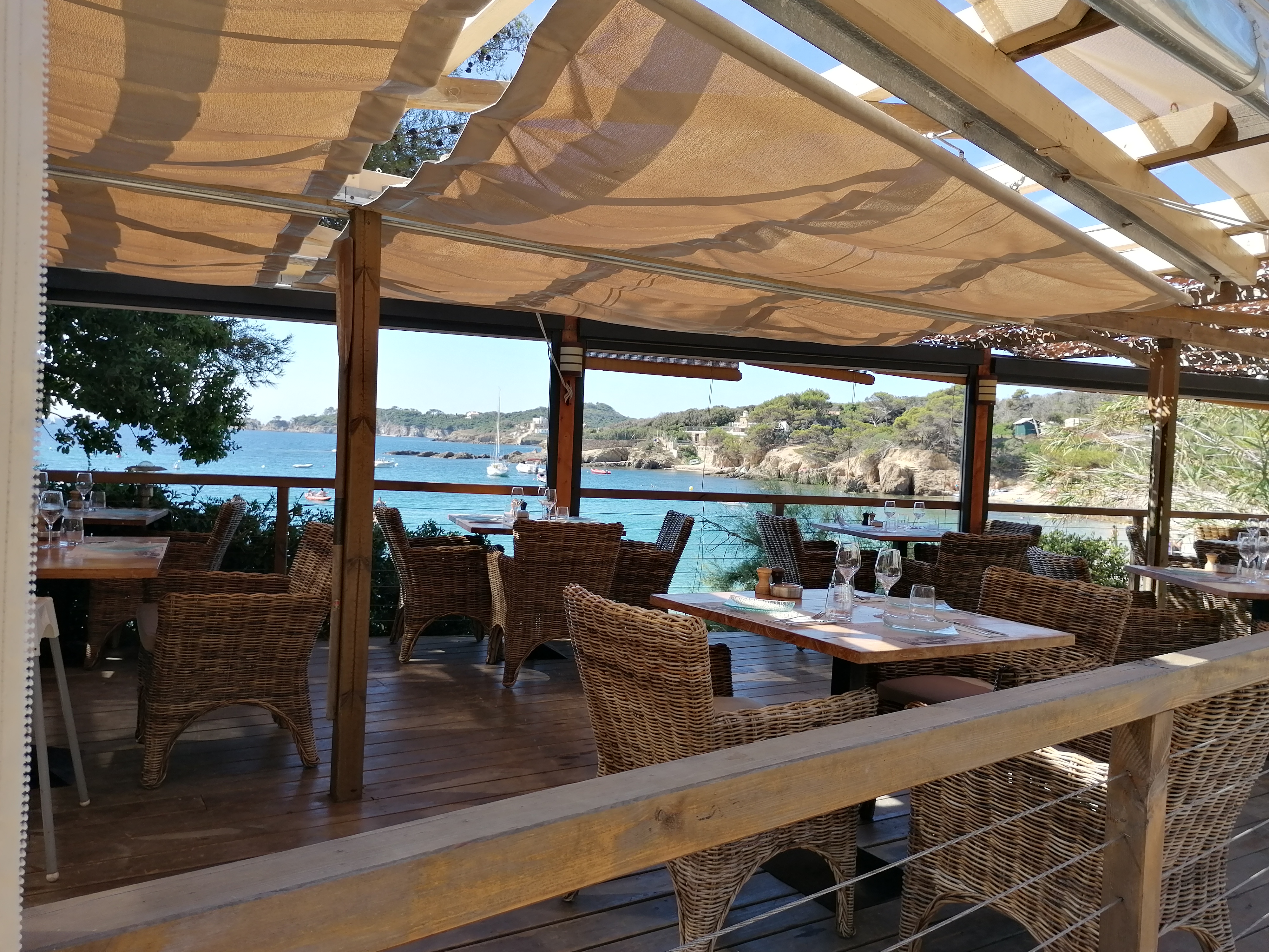 Un endroit magique très préservé, vue sur une crique et Porquerolles. On y mange très bien : poissons frais, pâtisseries délicieuses et cocktails très sympas. Tout y est pour passer un excellent moment dans un cadre magnifique ! Le service est aux petits soins. Allez-y !
