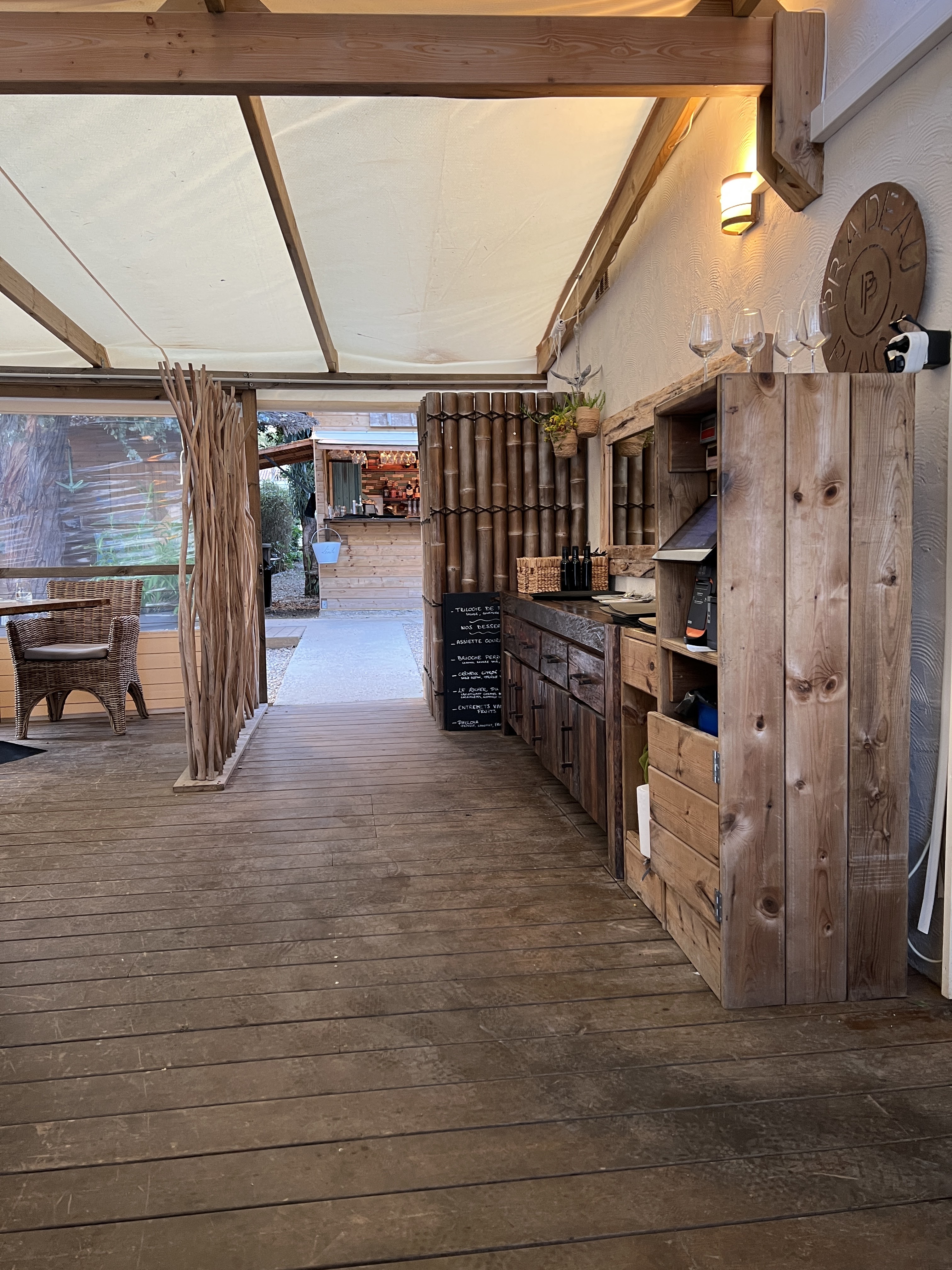 Un emplacement paradisiaque pour un déjeuner ou un dîner. La terrasse du restaurant est superbe, toute en bois...sous les eucalyptus et les roseaux. Malgré une carte alléchante, le résultat n'est pas vraiment à la hauteur des prix des plats...les gambas étaient pâteuses, ce qui est dommage sur un plat à 33€ ! Les desserts testés (pain perdu et assiette gourmande) étaient excellents. Il faut y aller au moins une fois pour cette vue incroyable.