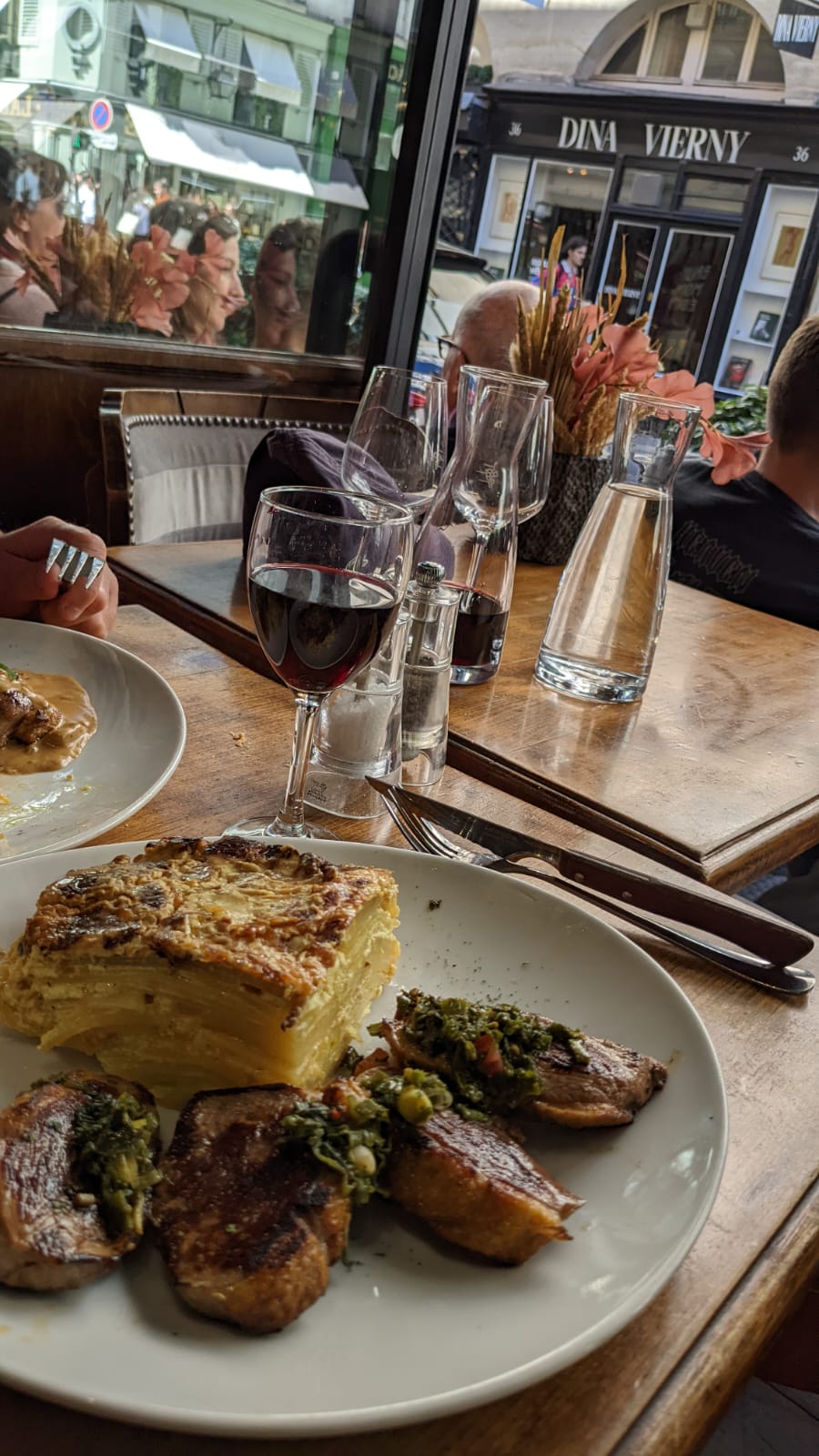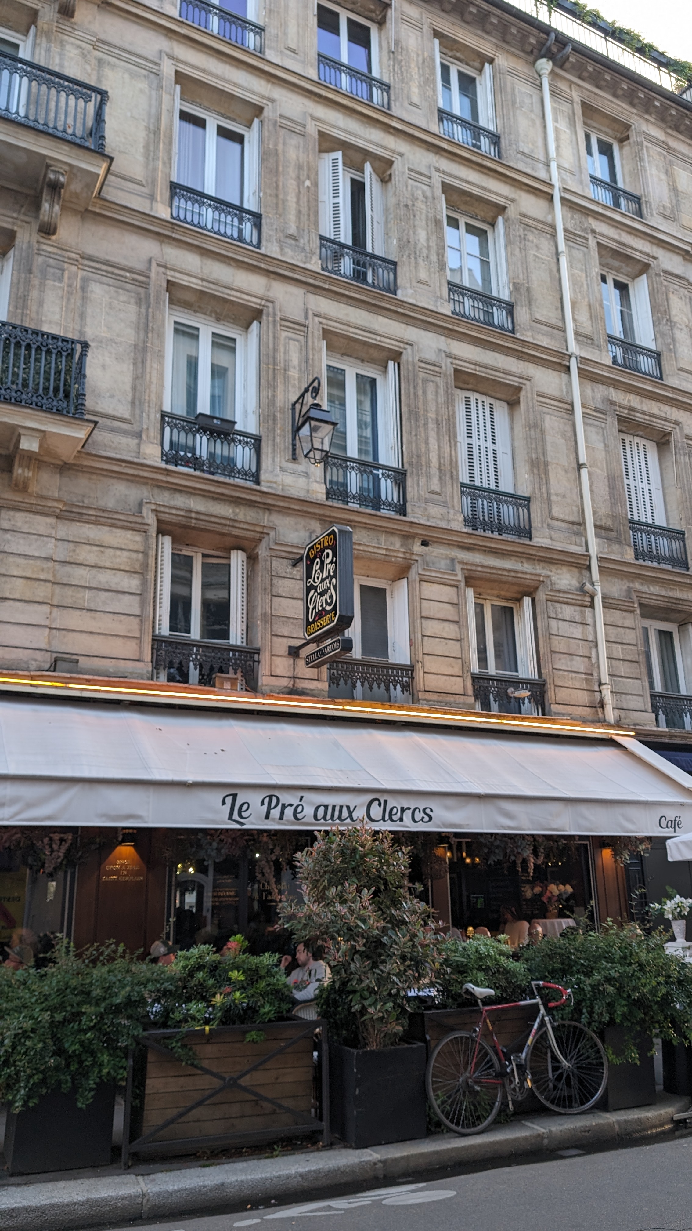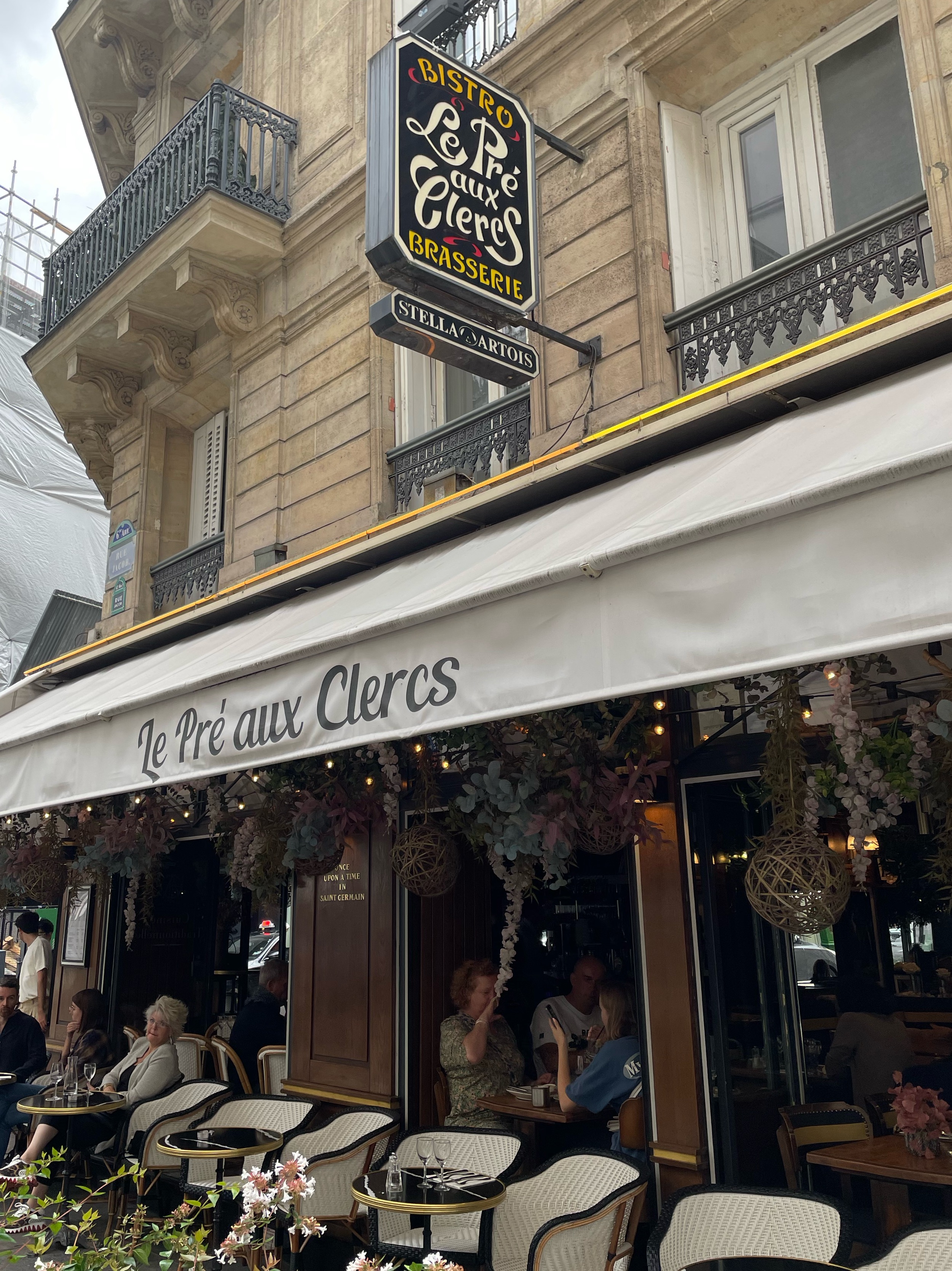 Nous avons eu un délicieux déjeuner composé de charcuterie et de fromage et une fantastique bouteille de vin rouge maison à Lê Pré aux Clercs. C'était délicieux de s'asseoir sur le trottoir de ce restaurant animé et de regarder passer la vie parisienne.