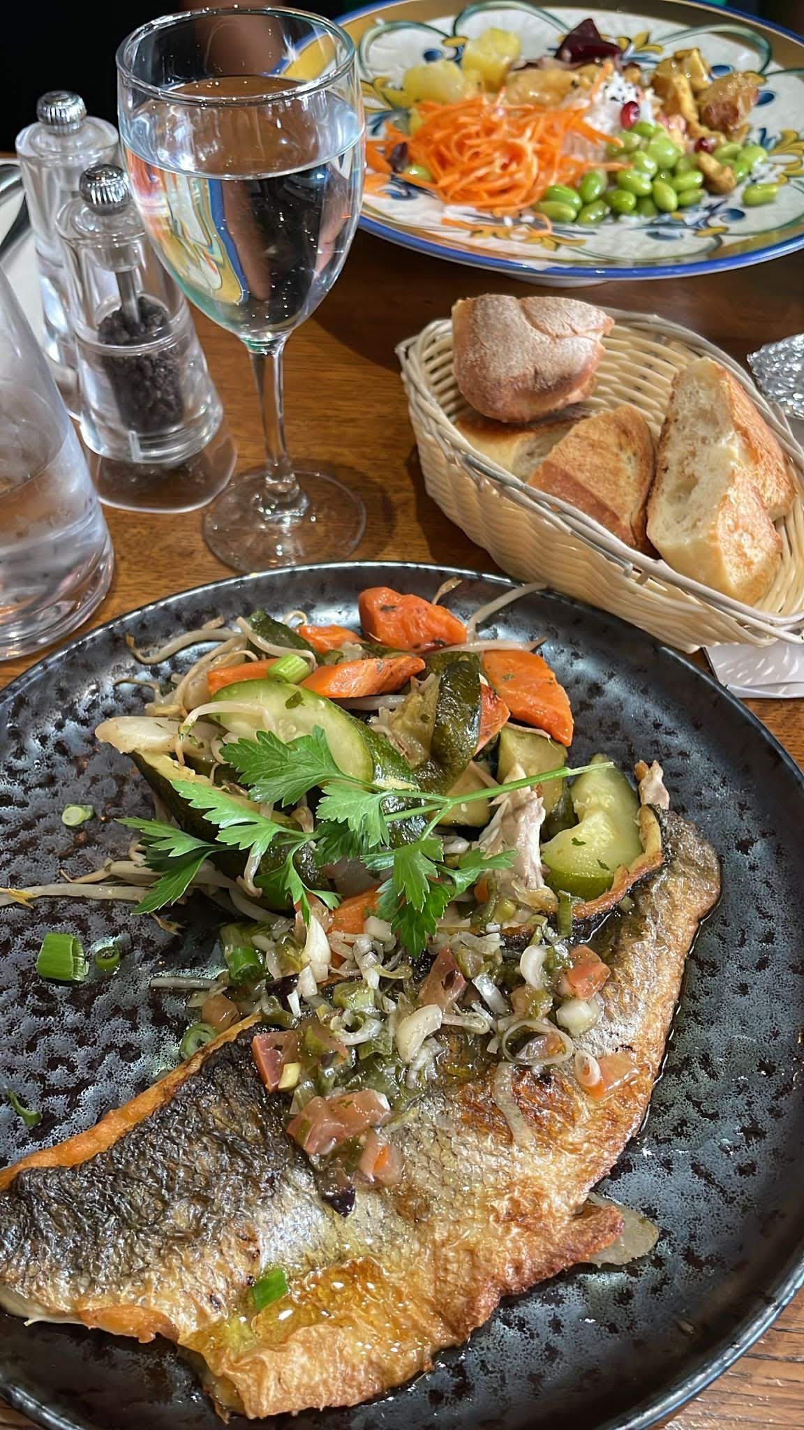 Je suis venu ici deux fois pendant mes deux semaines de vacances. Si vous recherchez un dîner rapide aux heures de pointe, ce n'est peut-être pas votre endroit, car les choses peuvent prendre un certain temps, même si les serveurs bougent vite. Mais si vous sortez avec des amis autour d'un verre ou d'un repas et que l'attente ne vous dérange pas, cet endroit vous conviendra. Salade composée, bar, canard, filet de steak et mousse au chocolat. Je ne peux pas me plaindre. Tout avait une très bonne saveur. Ambiance sympa; un mélange de clientèle jeunes et moins jeunes qui passent un bon moment. De la musique anglaise jouait en arrière-plan, ce que j'ai apprécié. Les prix sont raisonnables.
