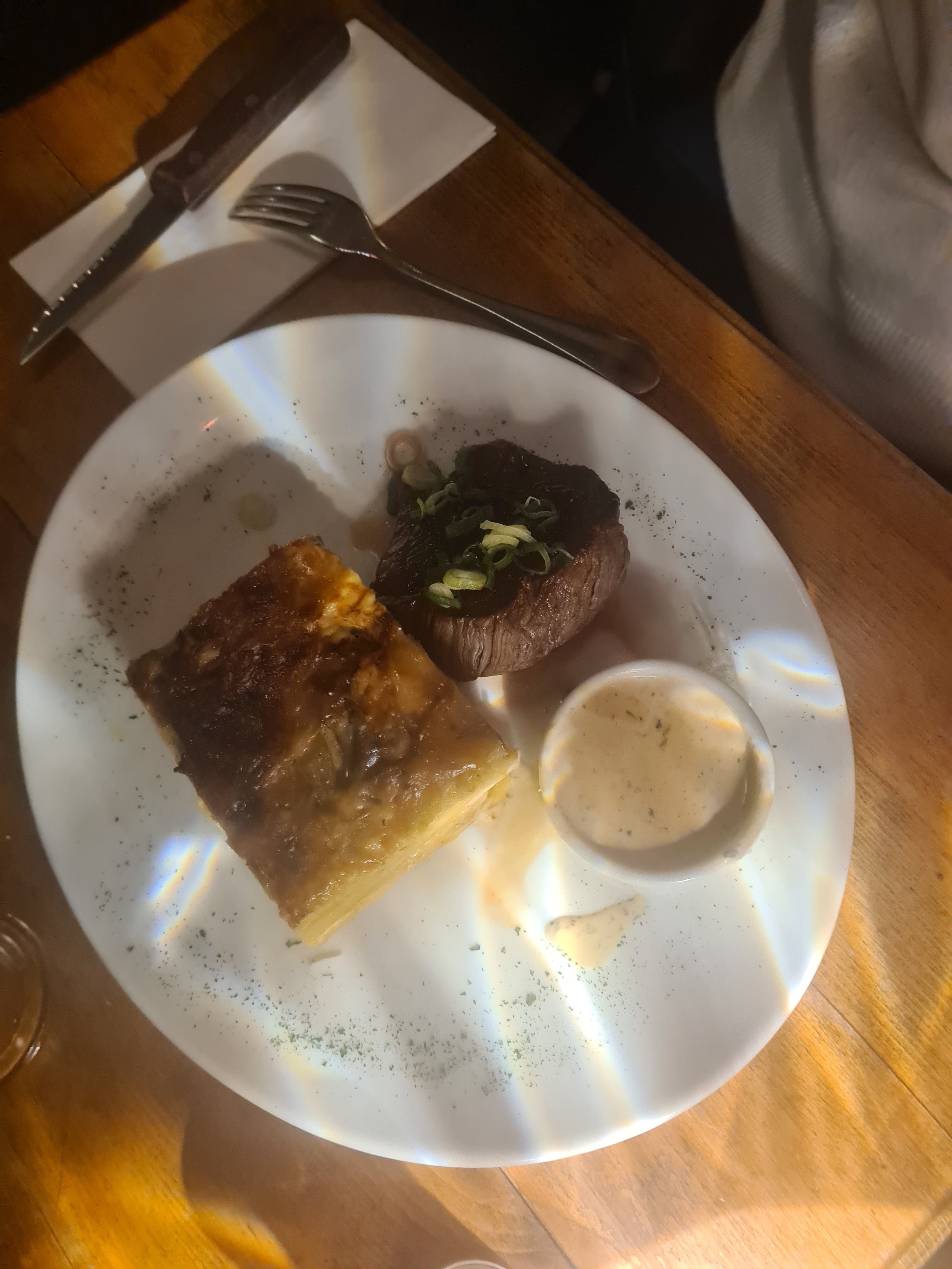 Incroyablement trop cher pour ce que c'est. Le burger à 18,50 € était incroyablement sec et insuffisamment cuit pour un « moyen » (il était littéralement cru) tout comme le steak qui était super moelleux et sans saveur. En plus de cela, je me sentais incroyablement pressé de demander si j'avais fini alors que je ne l'étais clairement pas, mais j'enlevais quand même les condiments de la table. Et déjà venir régler l'addition alors que nos boissons hors de prix sont encore sur la table. Pour ce prix, la moindre des choses est de nous laisser tranquilles. Je ne reviendrais pas et choisirais l'un des nombreux autres restaurants de la région.