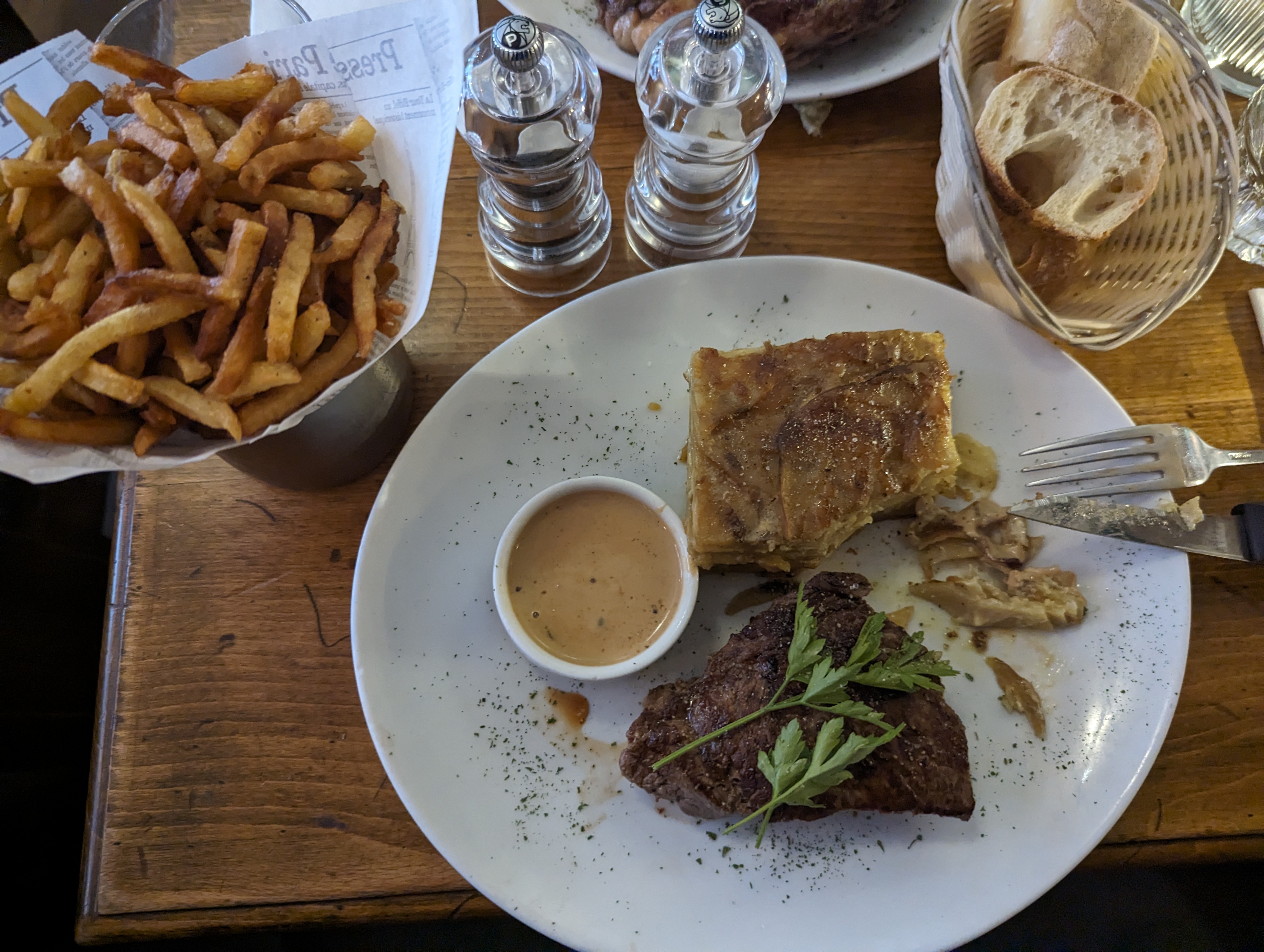 Mon fiancé et moi avons eu le steak et les pommes de terre, ce qui était incroyable. Même si je préfère mon steak un peu plus saignant que je l'ai reçu, à notre retour à Paris, nous ferons certainement une halte ici. Le service était merveilleux. Le steak était bien assaisonné. Les pommes de terre étaient parfaites.