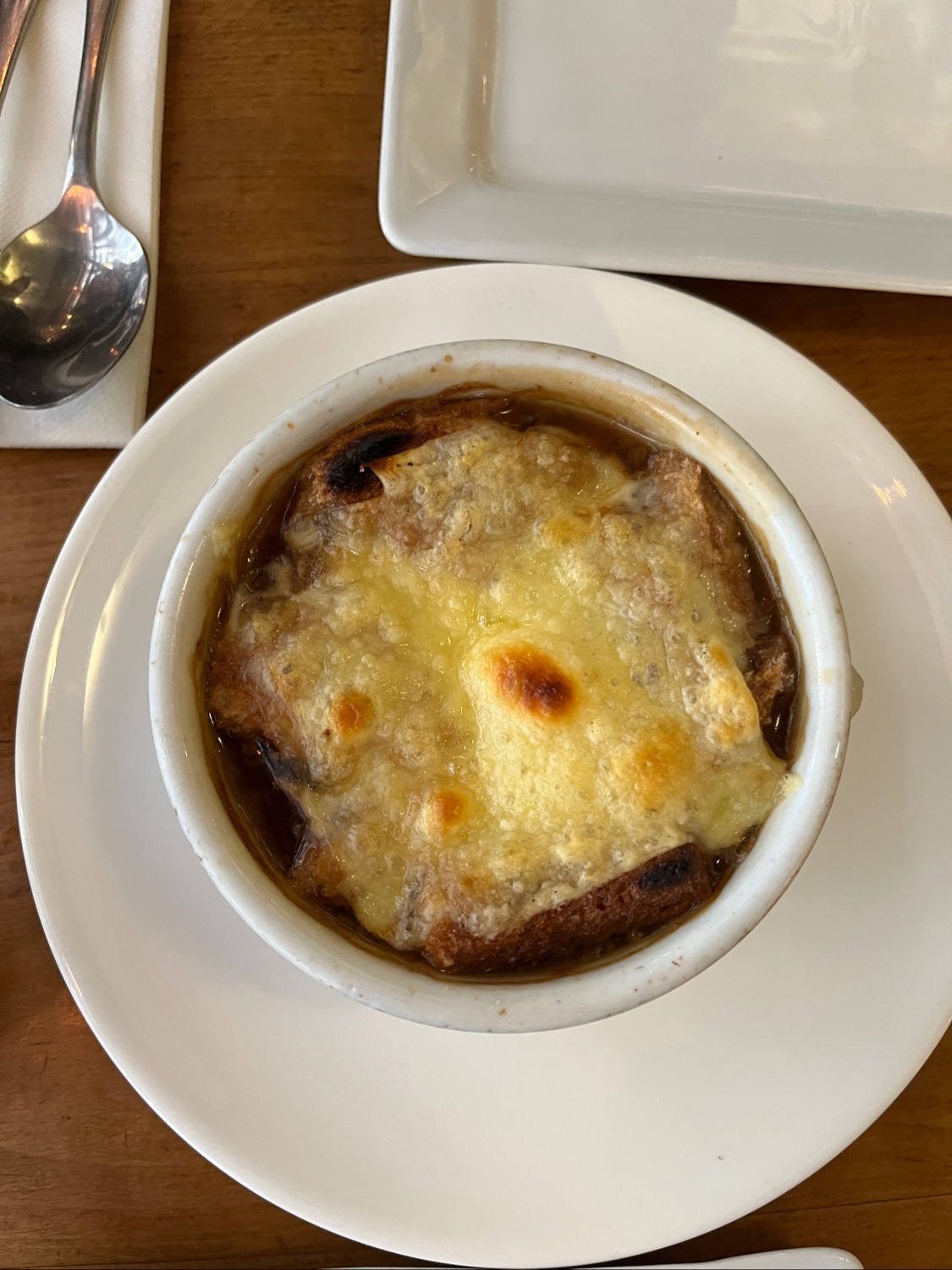 Bon déjeuner, la soupe à l'oignon et les frites étaient super, les autres plats n'étaient pas si bons.