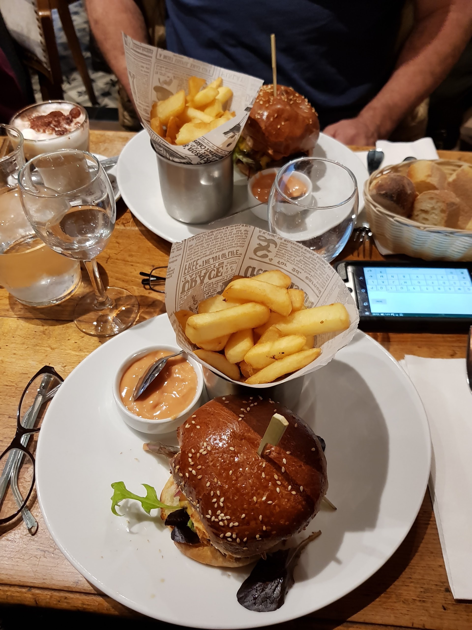 Frites très bonnes, beaucoup trop cher pour ce que c’est, hamburger basique Très bonne salade niçoise !