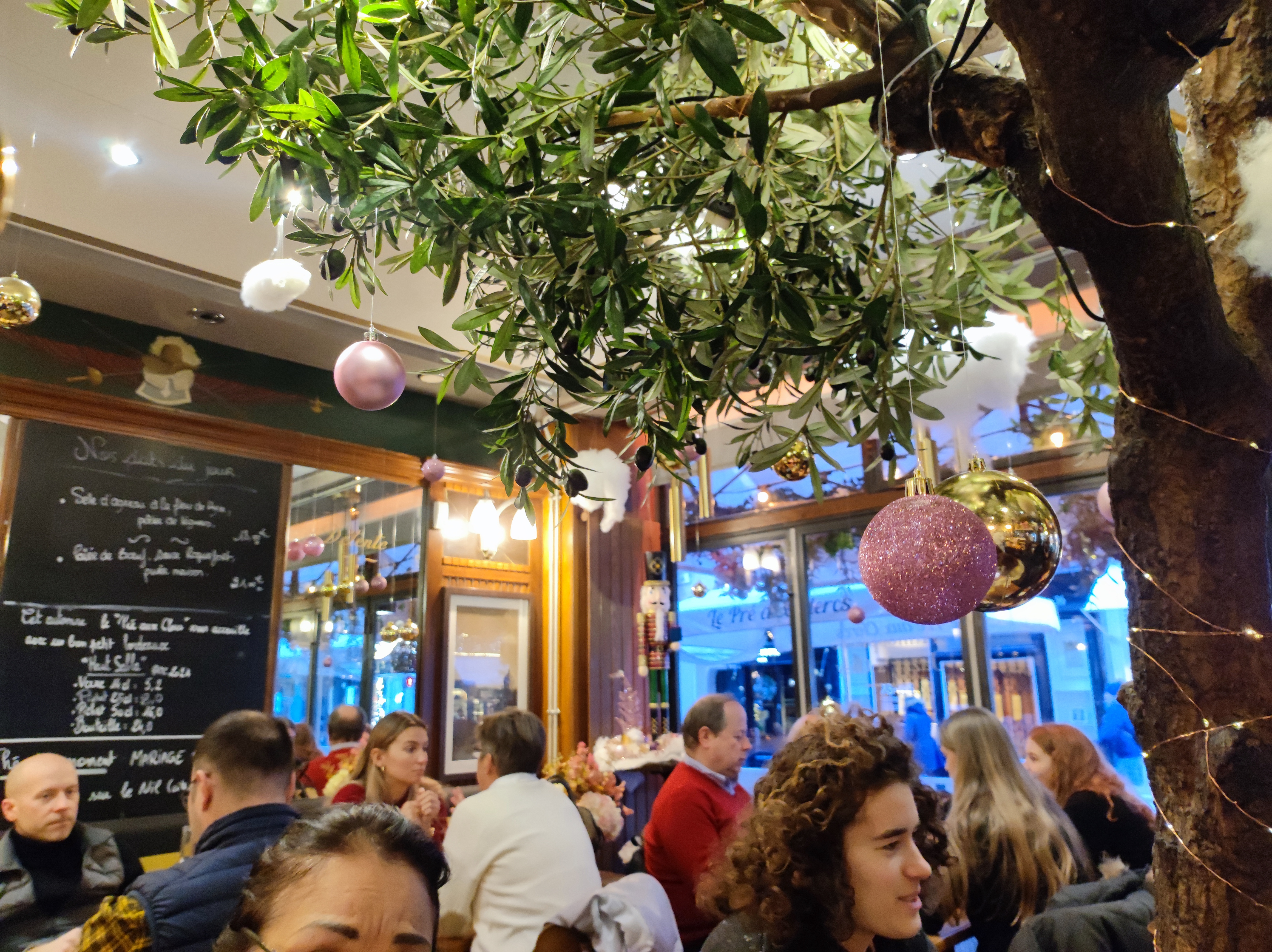 Ambiance vraiment sympa. Belle musique. Serveurs agréables. Prix raisonnables. Il y a un faux olivier au milieu de la pièce qui ajoute une ambiance familiale si vous êtes méditerranéen. La soupe à l'oignon était super. J'ai eu l'assiette de desserts au fromage mais les tranches ne semblaient malheureusement pas si fraîches. La nourriture de tout le monde avait l'air et sentait délicieusement bon ! Note au restaurant : mon bol à soupe avait des poignées cassées. Ce sera bien de continuer à jeter ce qui est cassé et vieux. Un peu inacceptable également de ne pas avoir de plateaux de fromages frais à Paris. Vous pouvez effectivement voir les bords des tranches devenir jaune foncé. L'un des fromages moisis avait de la moisissure dans le réfrigérateur. Les consommateurs peuvent encore faire la différence !